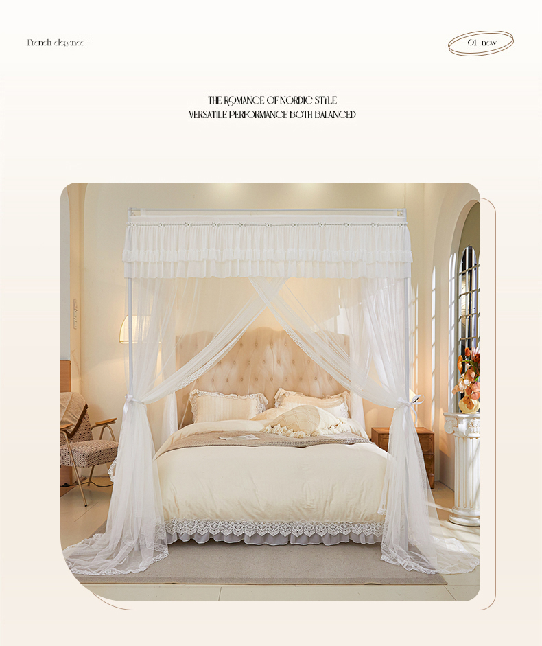 (总)2025新款双层花边全包围床笠款三开门蚊帐-幽梦星辰,奶黄,藕玉,颜淡蓝