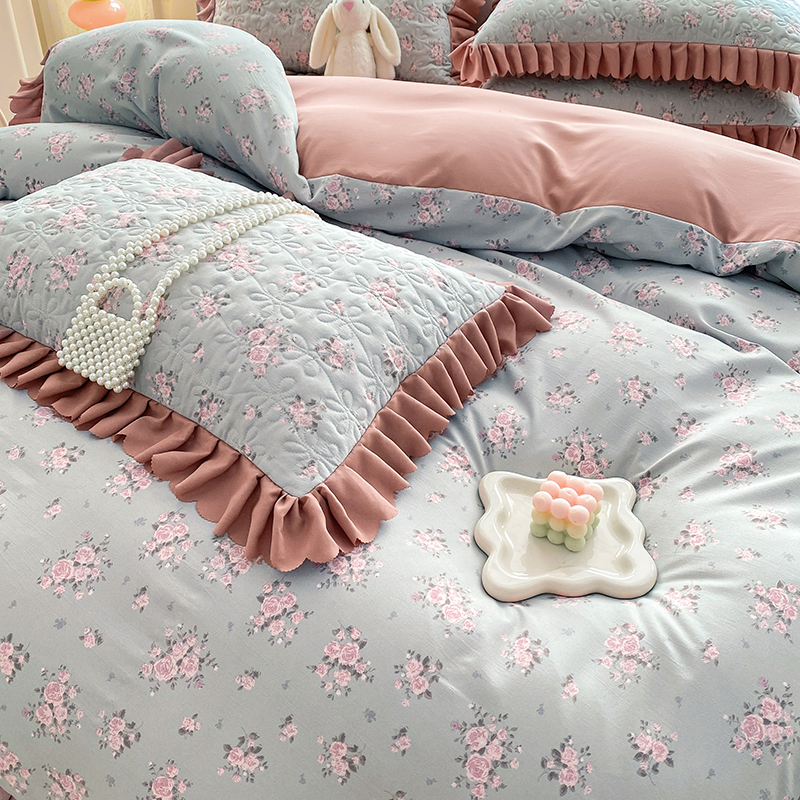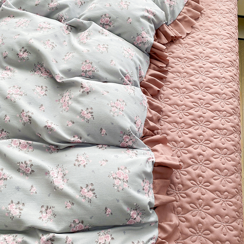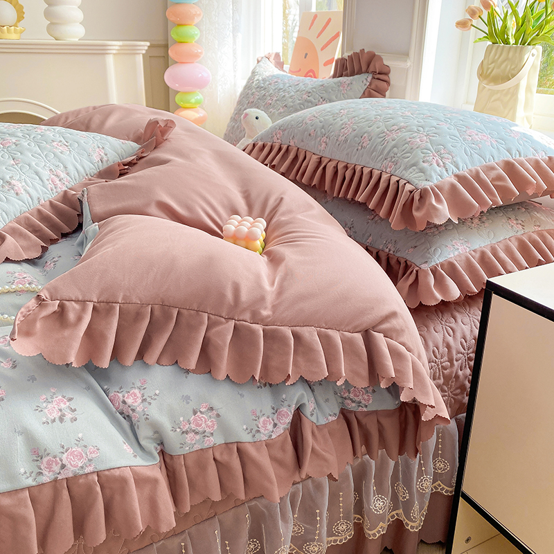 • 91家纺网 家纺一手货源 找家纺 提花大世界 2025直播热款A类针织棉双层纱夹棉床盖床裙花边单件三件四件套 花香丽影