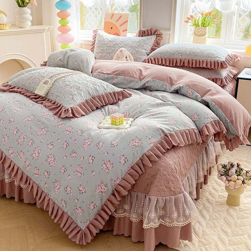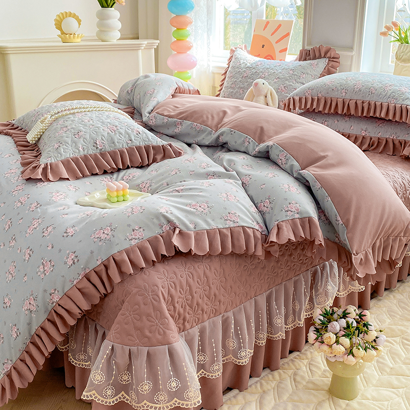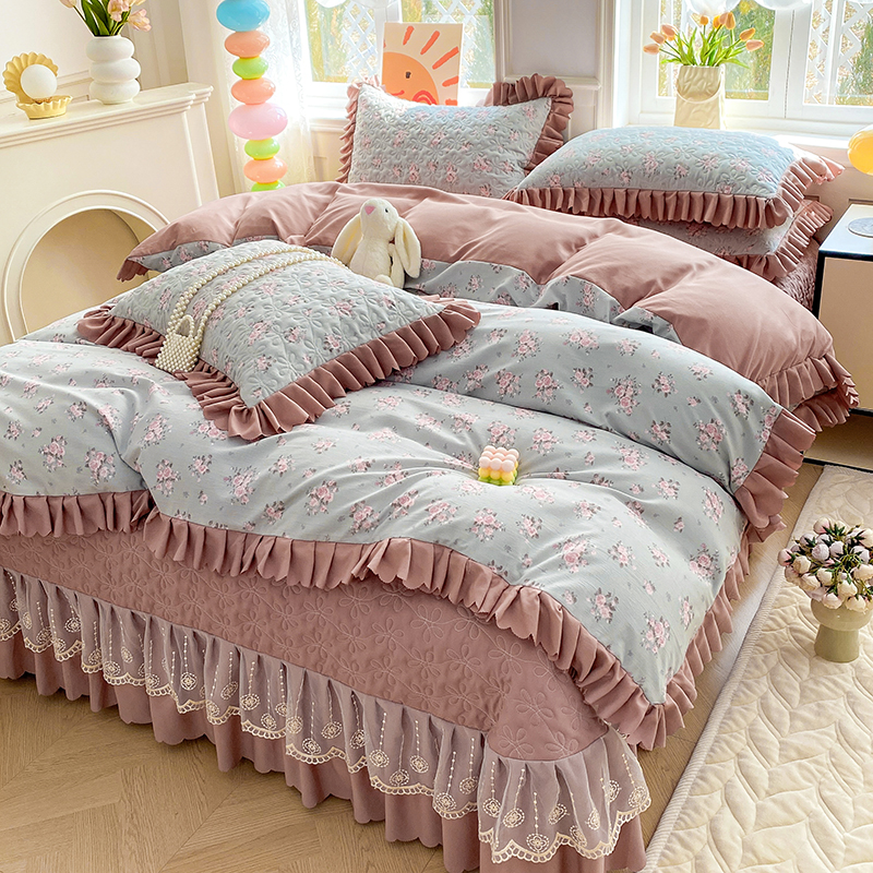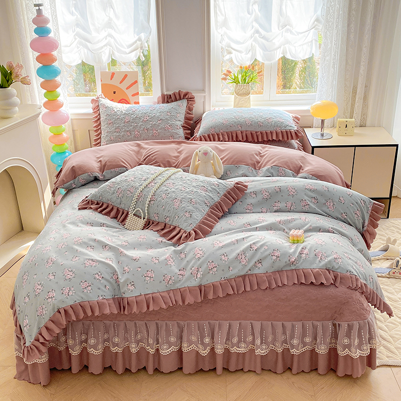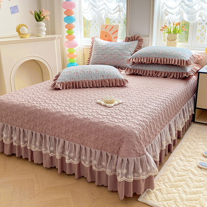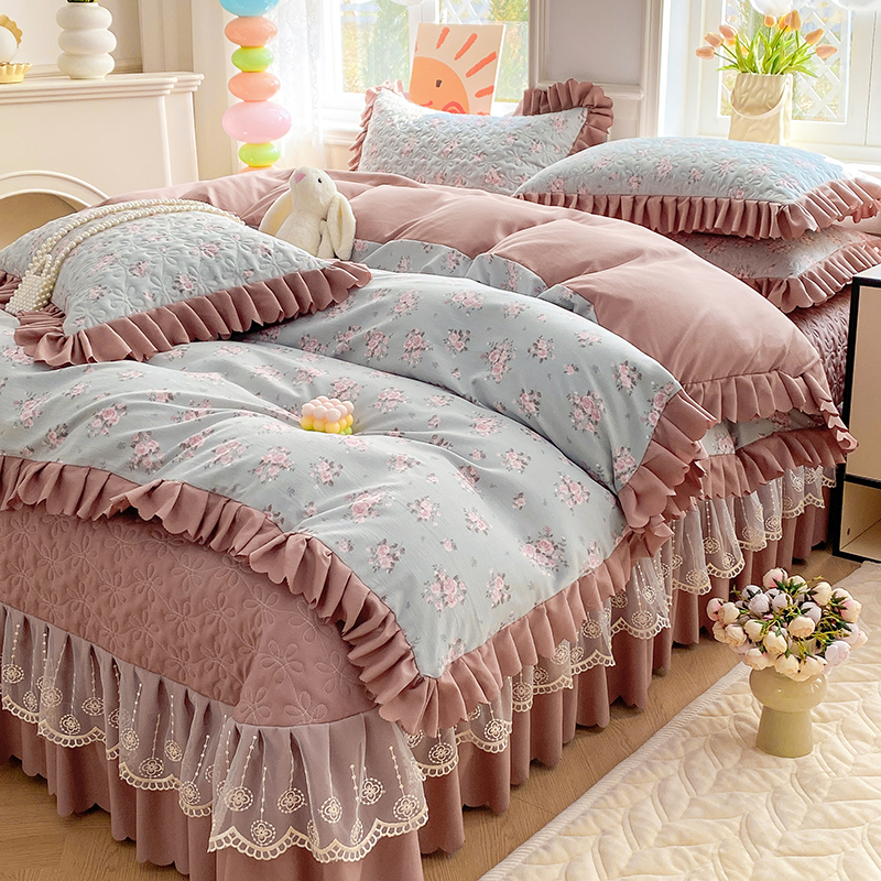 提花大世界 2025直播热款A类针织棉双层纱夹棉床盖床裙花边单件三件四件套 花香丽影