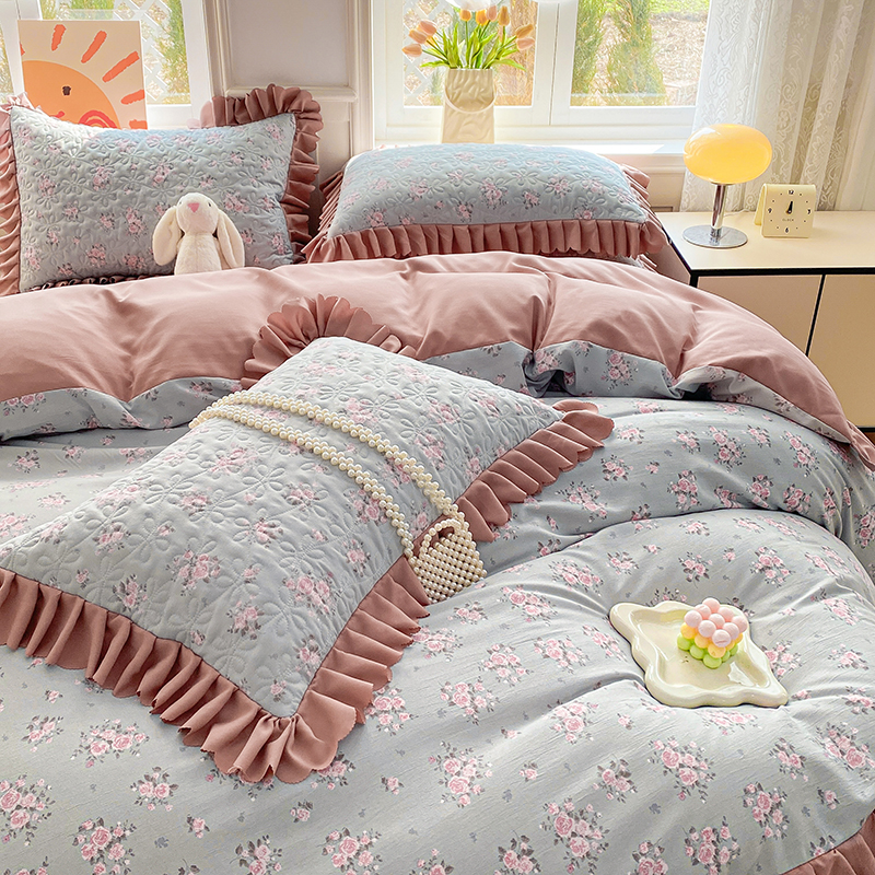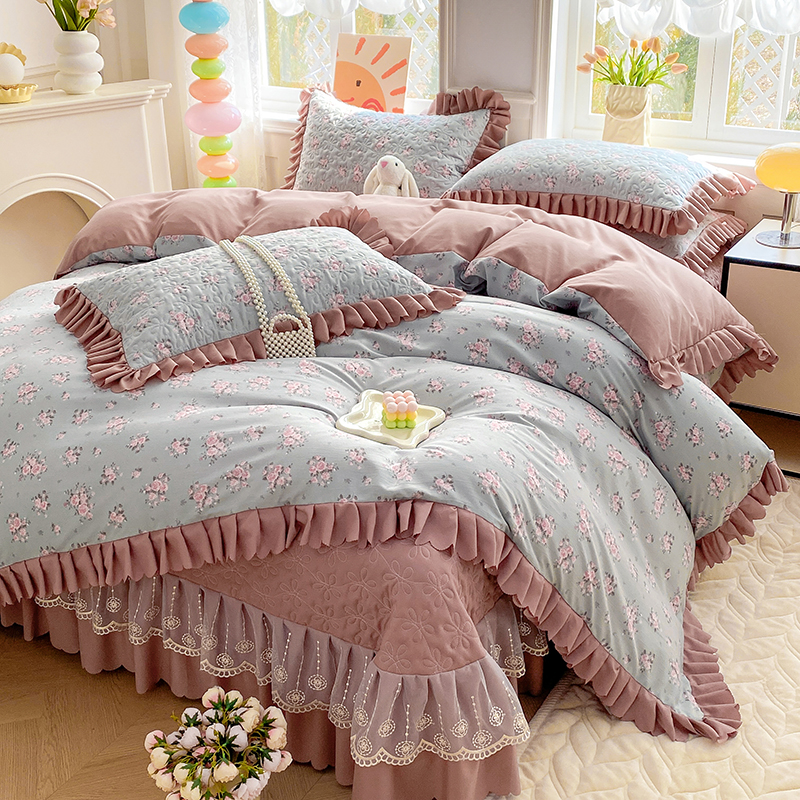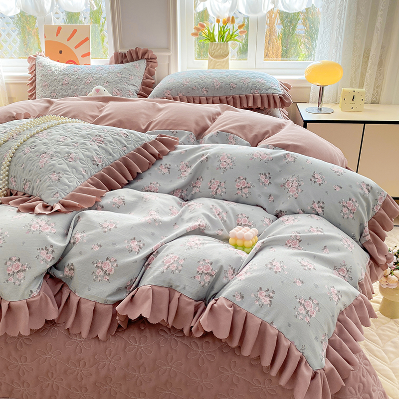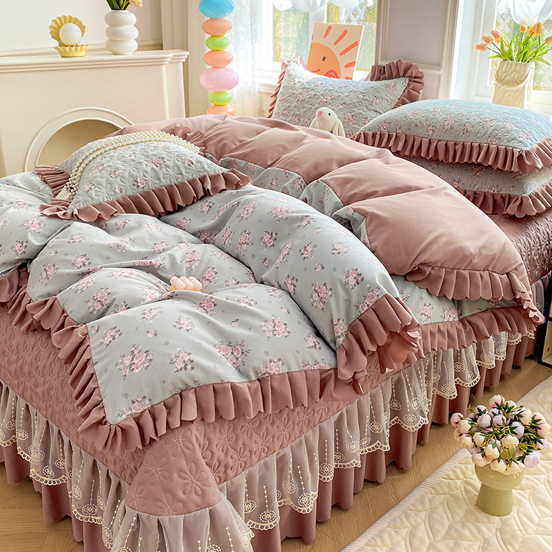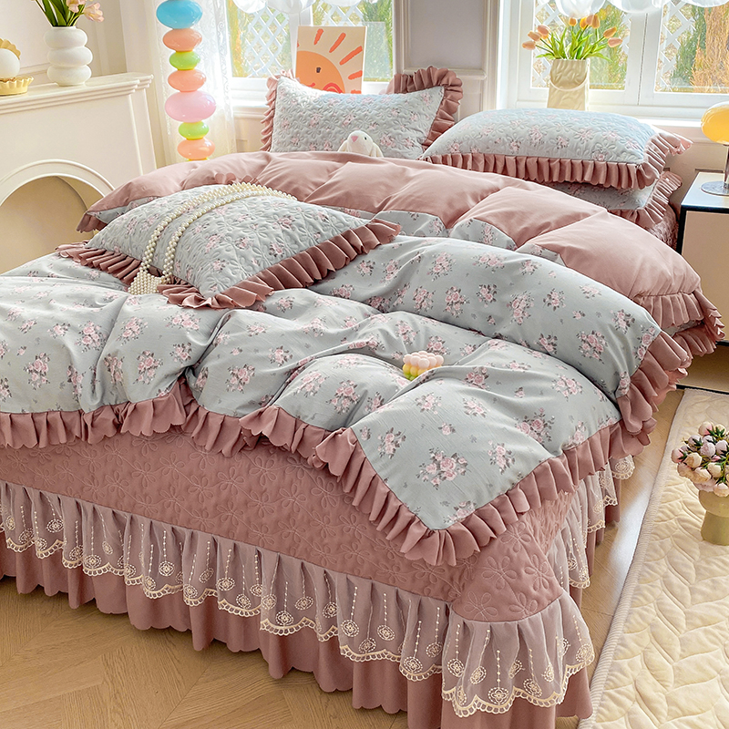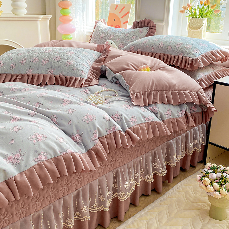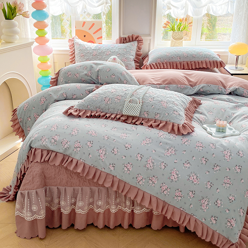 提花大世界 2025直播热款A类针织棉双层纱夹棉床盖床裙花边单件三件四件套 花香丽影