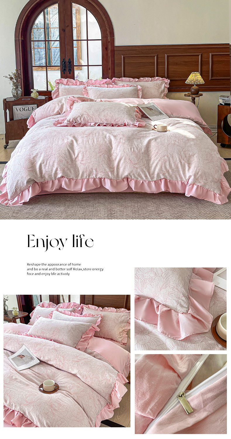 锦格家纺 2025年春夏新款A类全棉纯棉色织三层纱提花四件套 漫香花羽-粉
