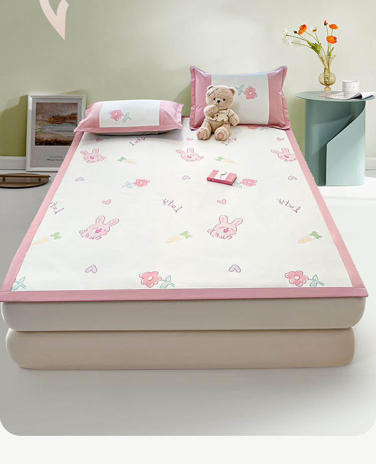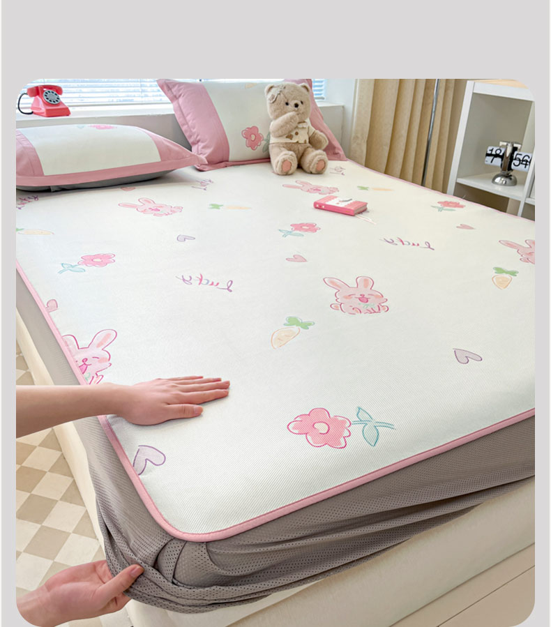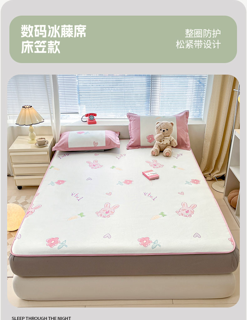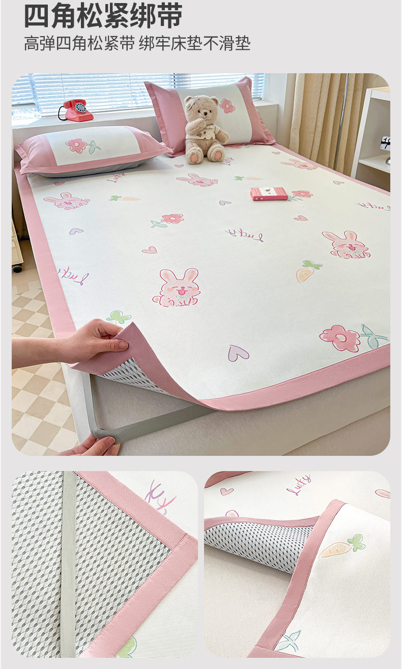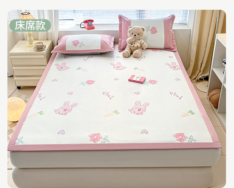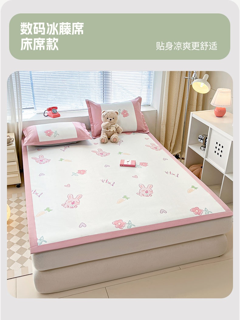 鑫琪莱家纺 2025新款数码印花加密冰藤凉席三件套 床席款-花园小兔