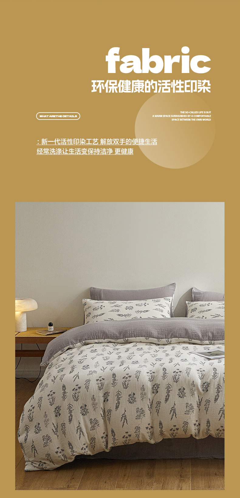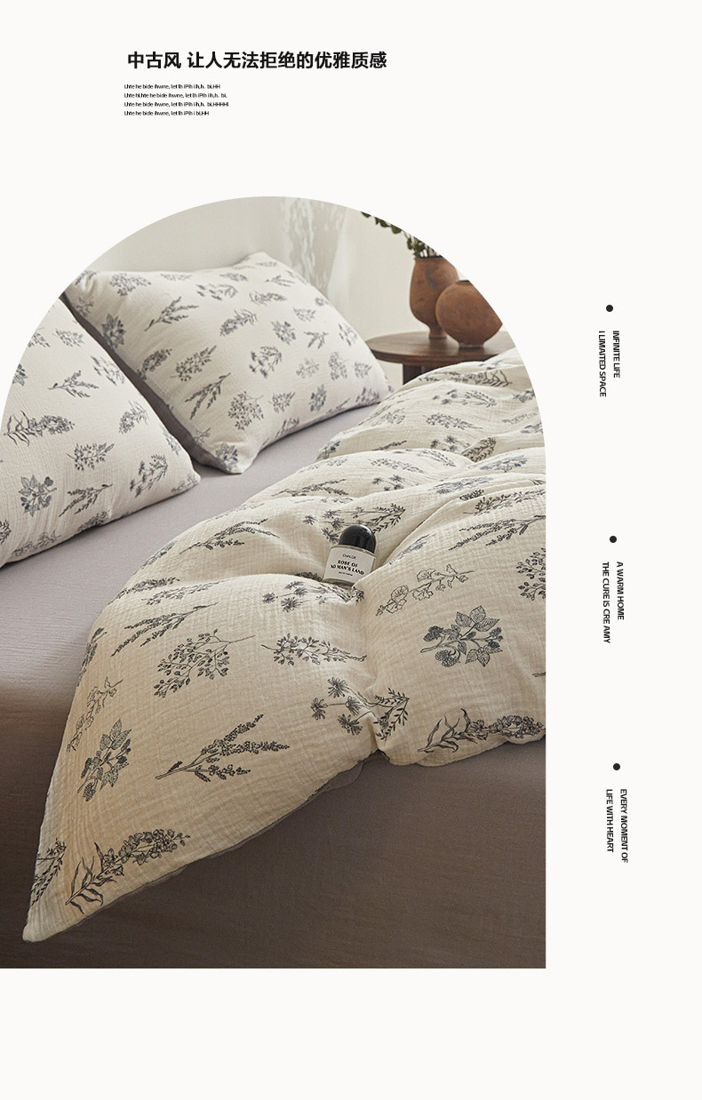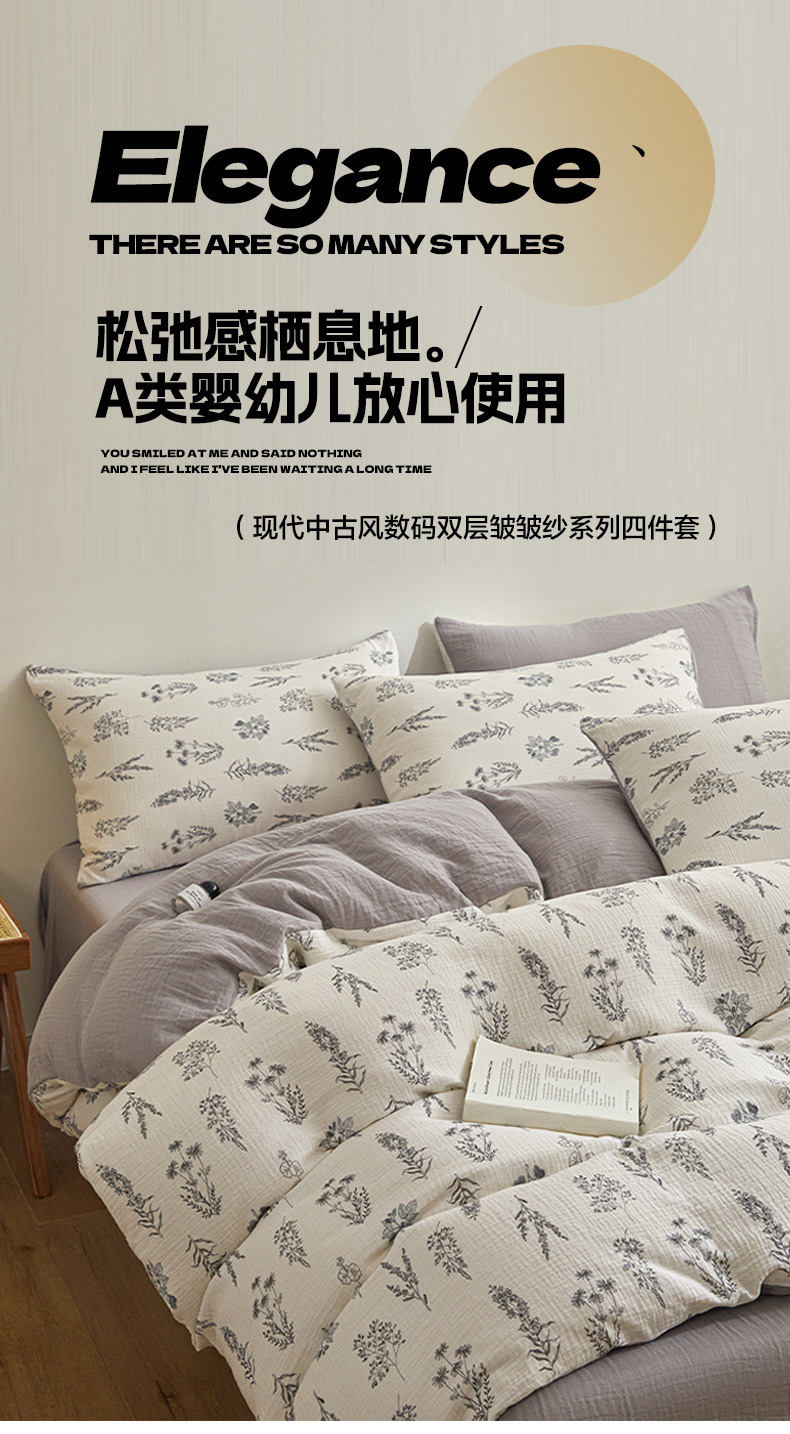 卡巴伦家纺 2025新款全棉双层皱皱纱现代中古风数码四件套 椿山集