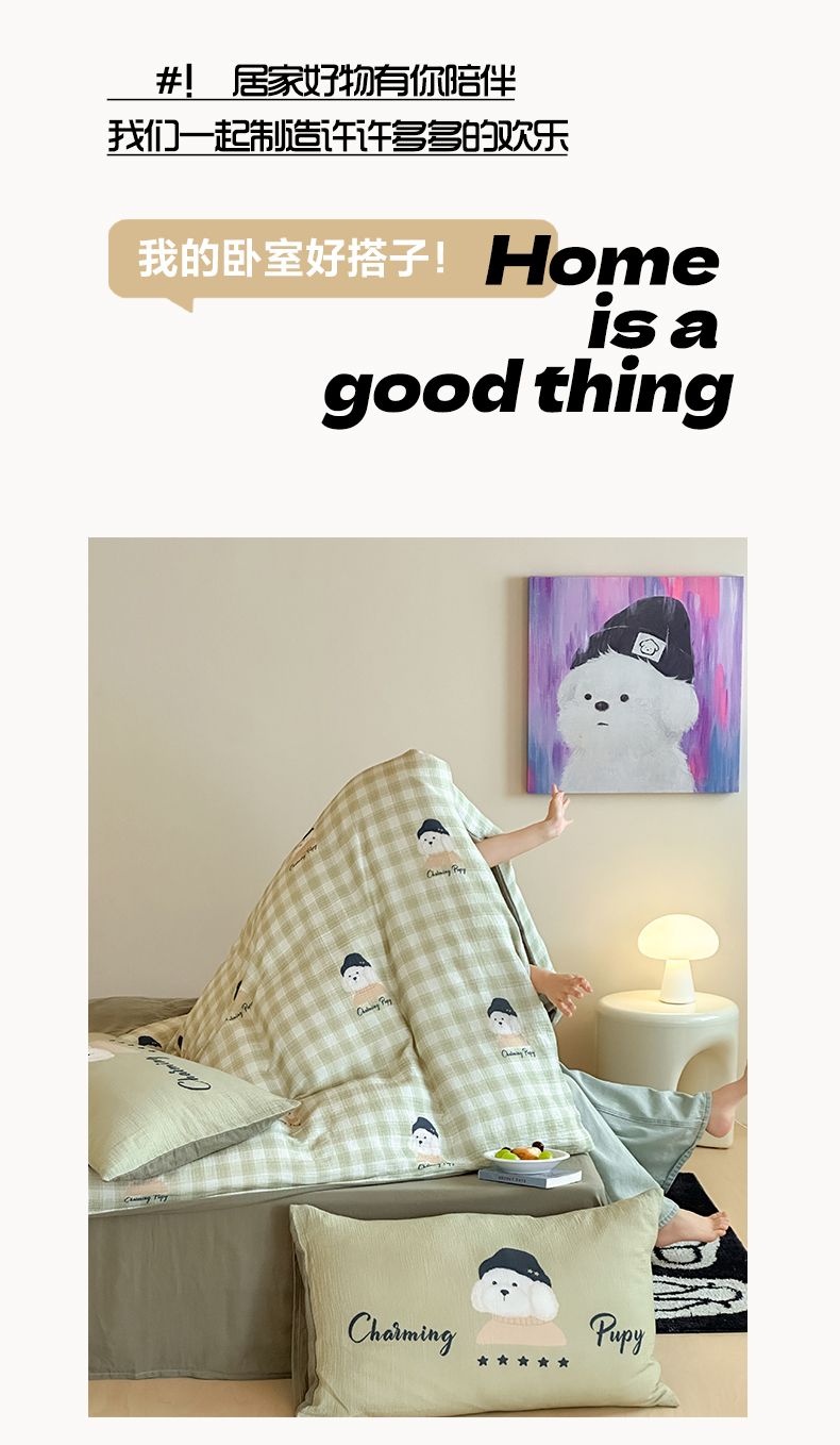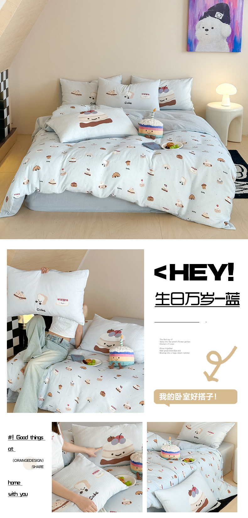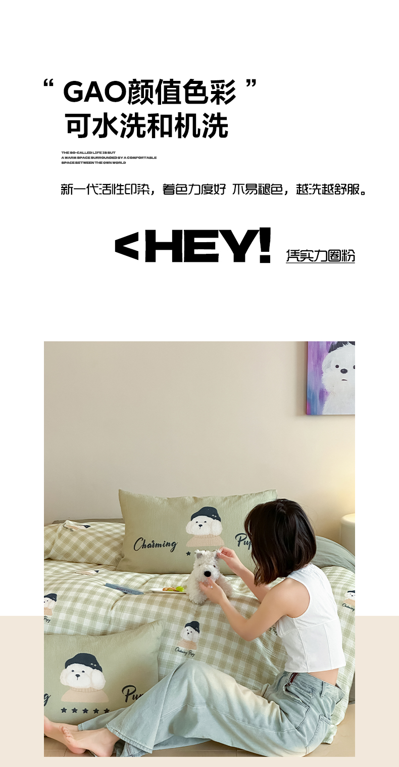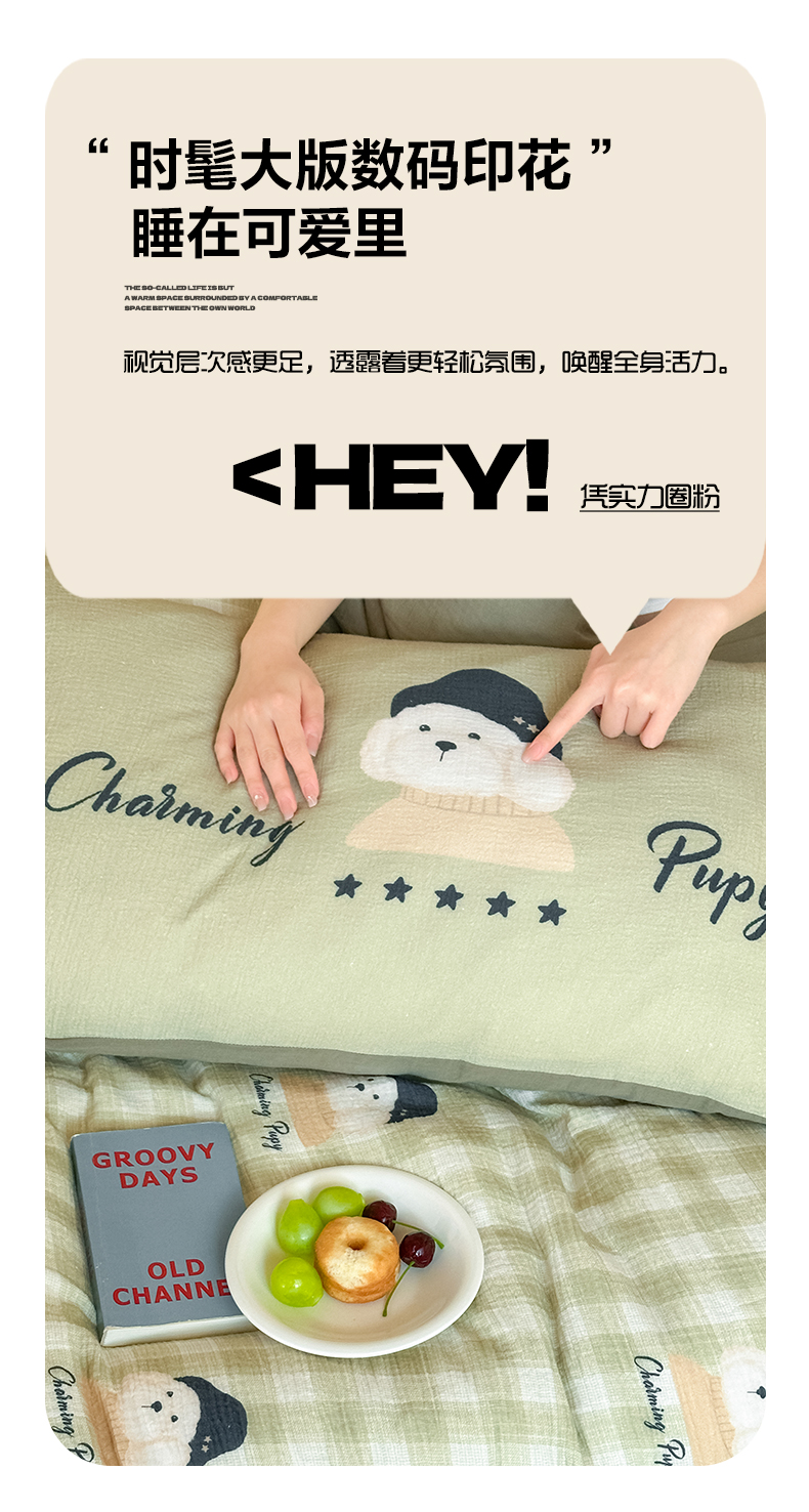 (总)卡巴伦家纺 2025新款全棉皱皱纱大版卡通数码印花款四件套二,酥酥熊-粉,腊肠总裁,生日万岁-粉,生日万岁-蓝,生日万岁-米,酥酥熊-米黄,汪汪掀被-灰,汪汪掀被-绿,小狗没烦恼