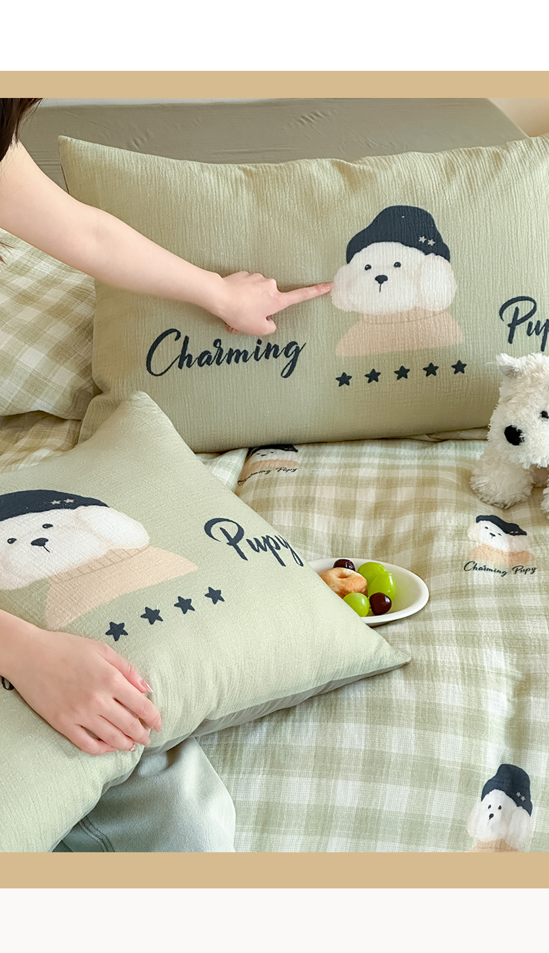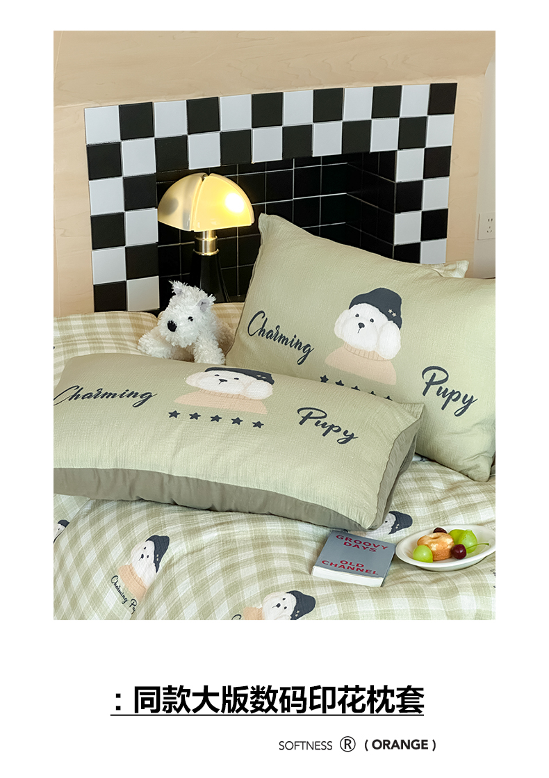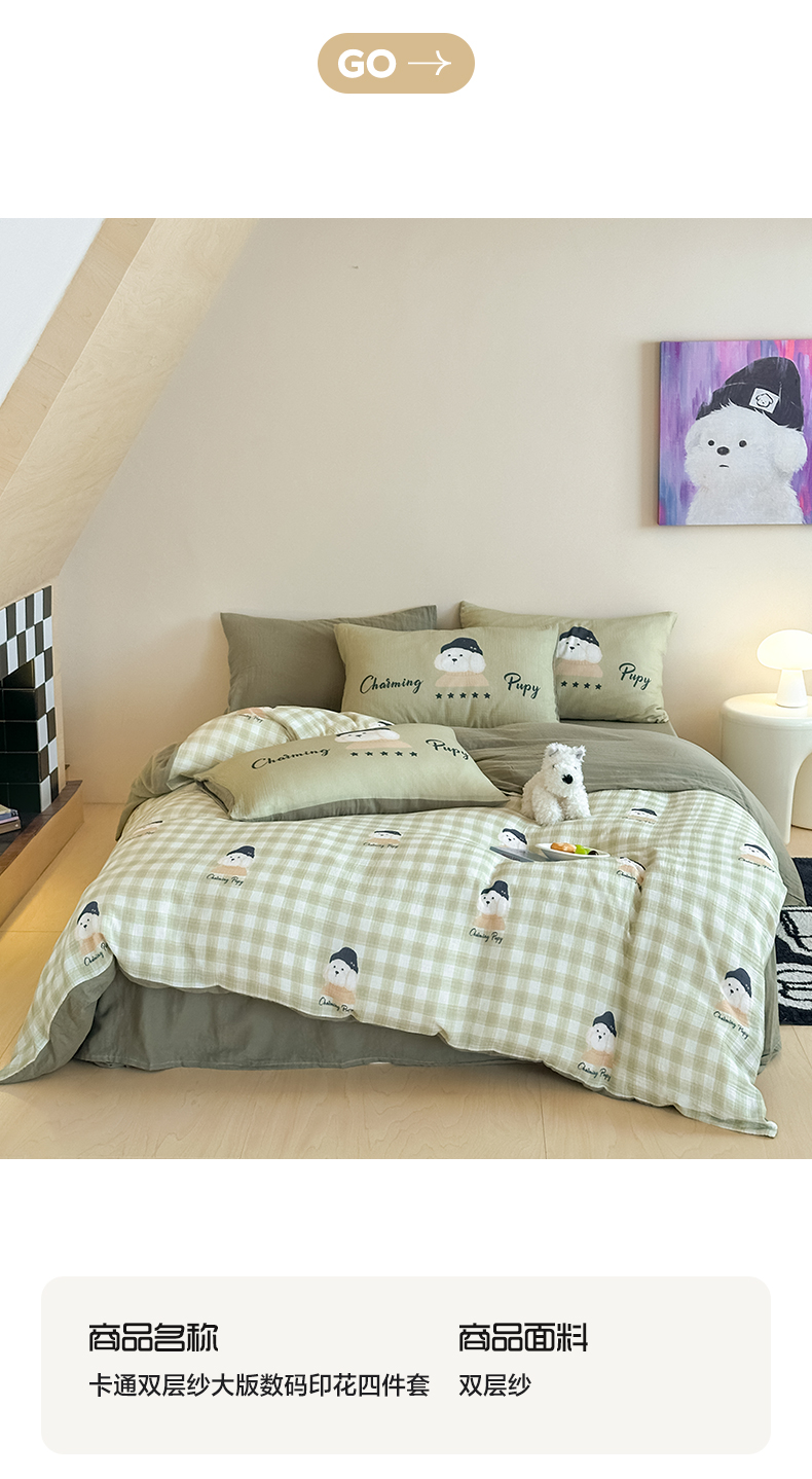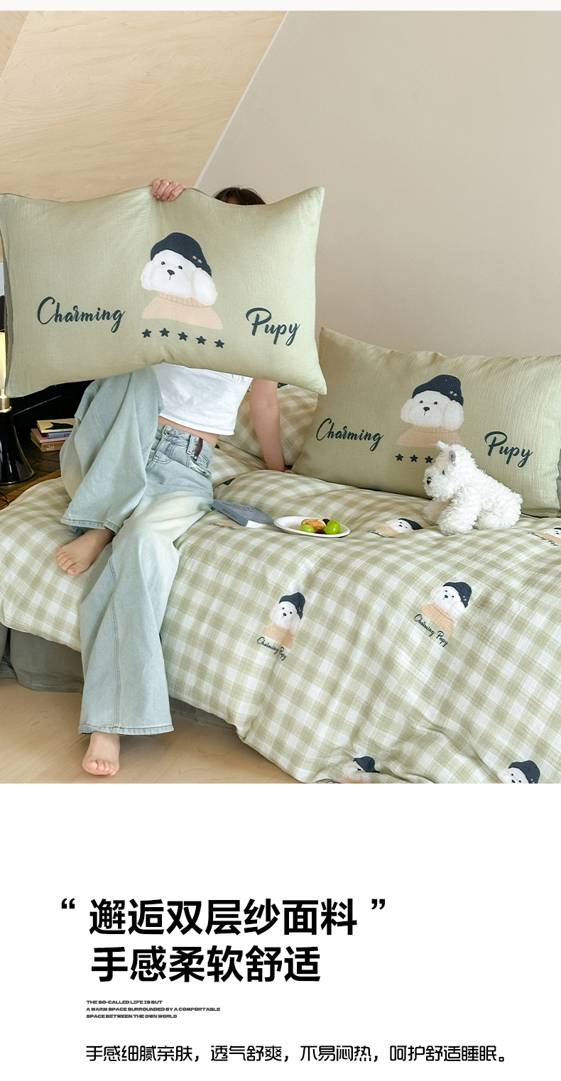 商品名称:卡巴伦家纺 2025新款全棉皱皱纱大版卡通数码印花款四件套二 汪汪掀被-绿