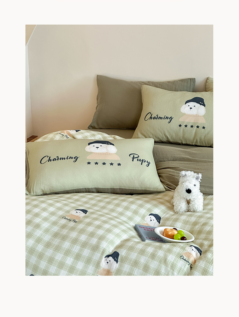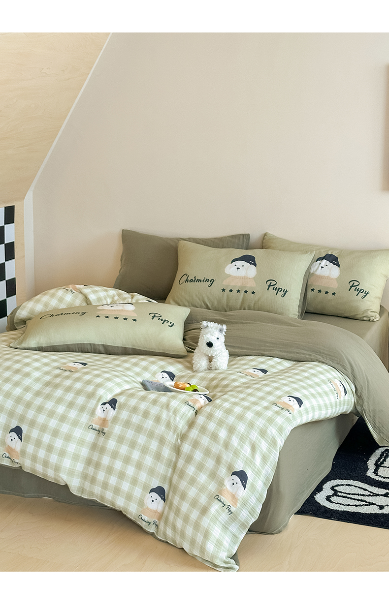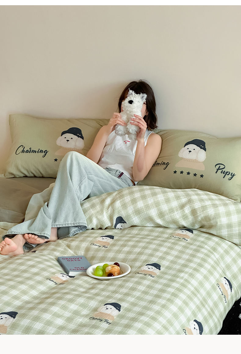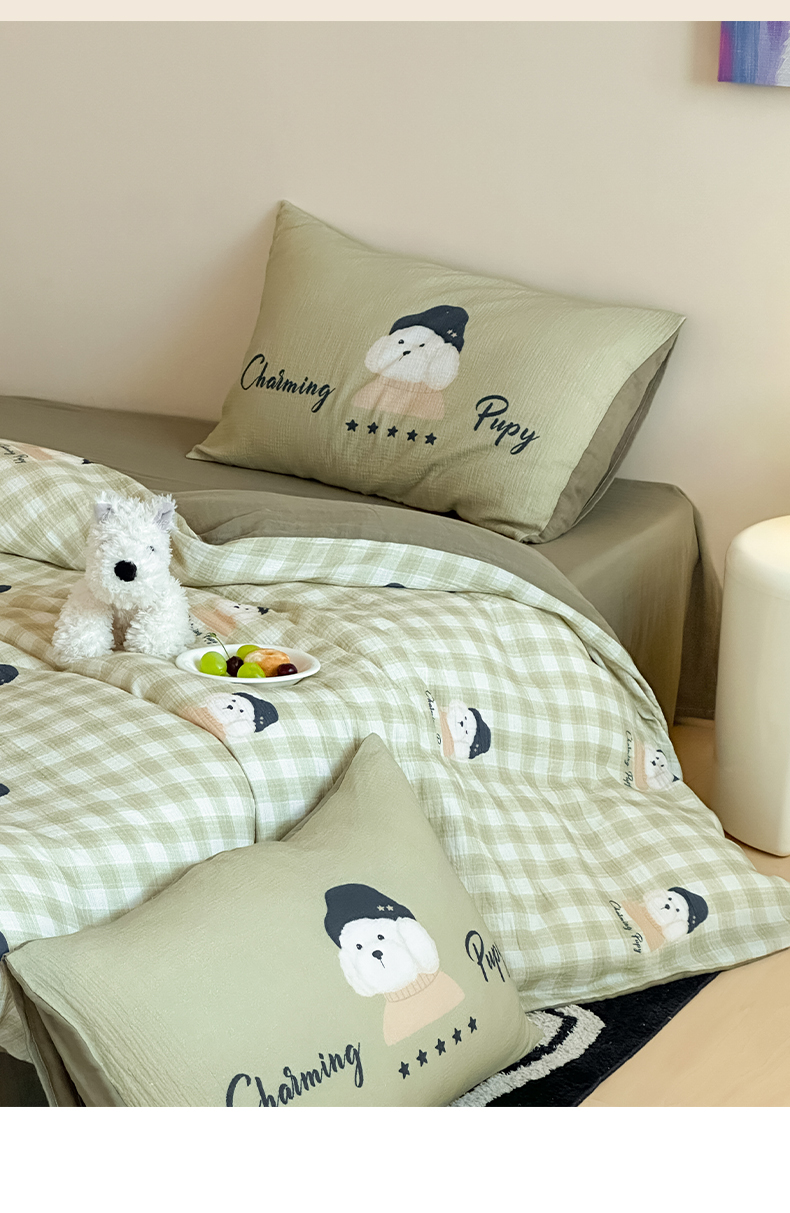 商品名称:卡巴伦家纺 2025新款全棉皱皱纱大版卡通数码印花款四件套二 汪汪掀被-绿