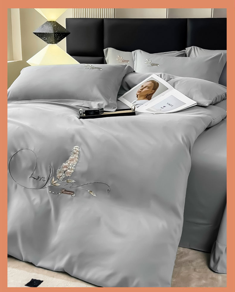 曲之慕 2025新品四季款高端刺绣四件套简约可水洗轻奢纯色刺绣四件套 大麦都市灰