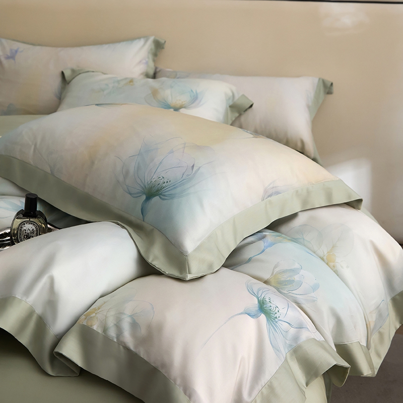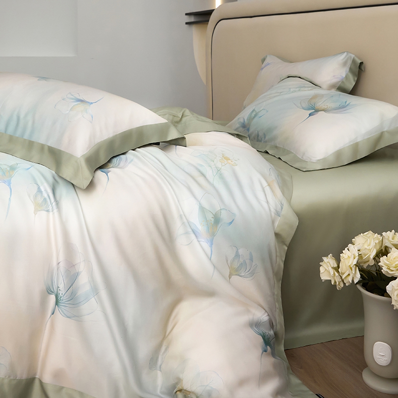 (总)薏思家纺 2025新款全棉100支数码印花生态磨毛轻奢款四件套-花边系列,橘子海,向云端,寻野-绿