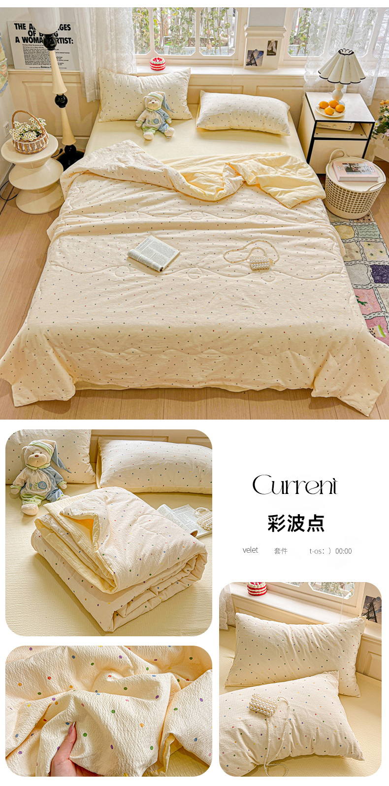 当前位置: 91家纺网 > 商品网购 > 床品套件 > 四件套 > 夏被四件套 > 一比一家纺 2025新款云感皱皱纱简单款夏被夏凉被空调被四件套 彩波点