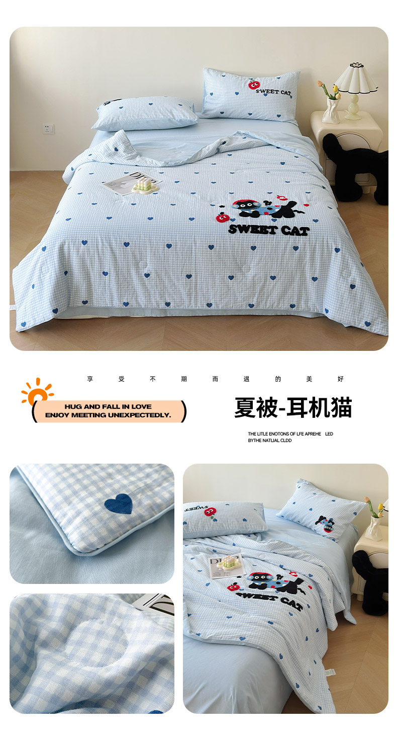 怡家居 2025新款全棉双层纱毛巾绣夏被四件套 夏被-耳机猫