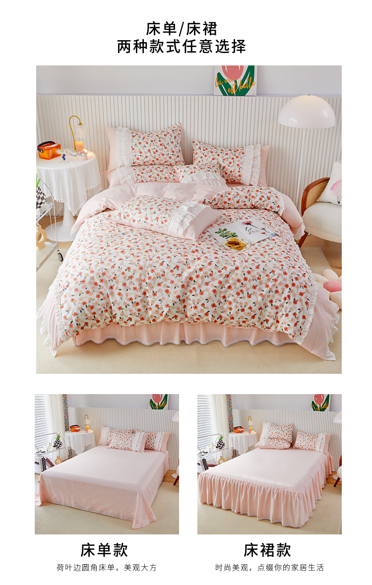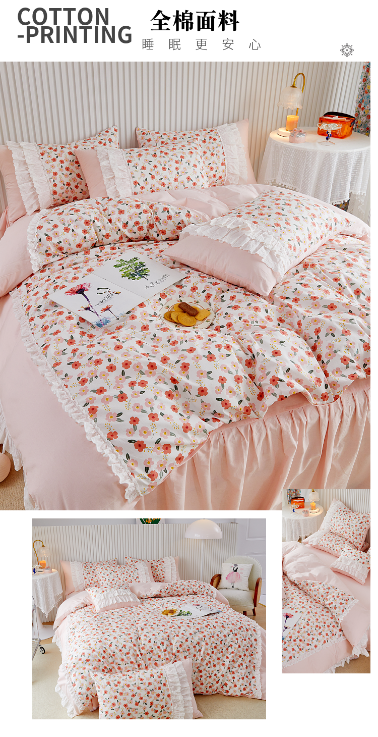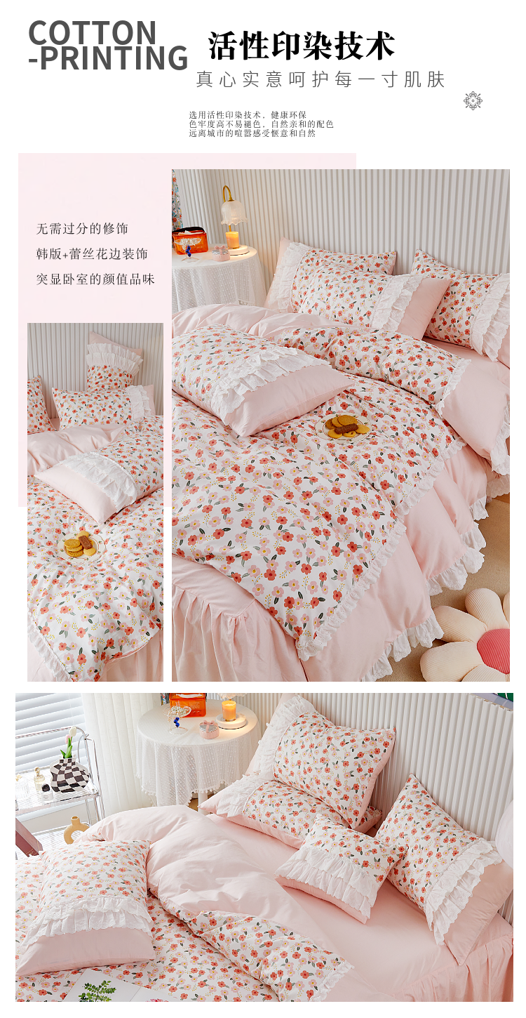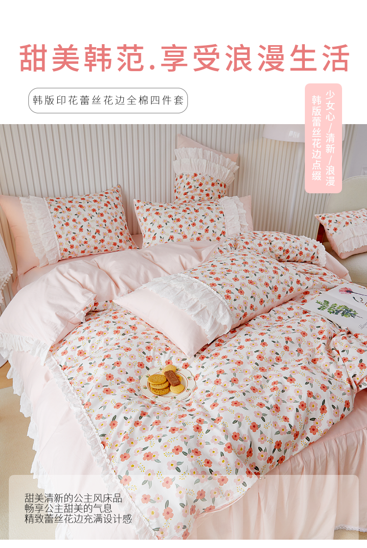 商品名称:亲亲公主 2025全棉蕾丝花边床裙公主风四件套 甜心花园-粉色