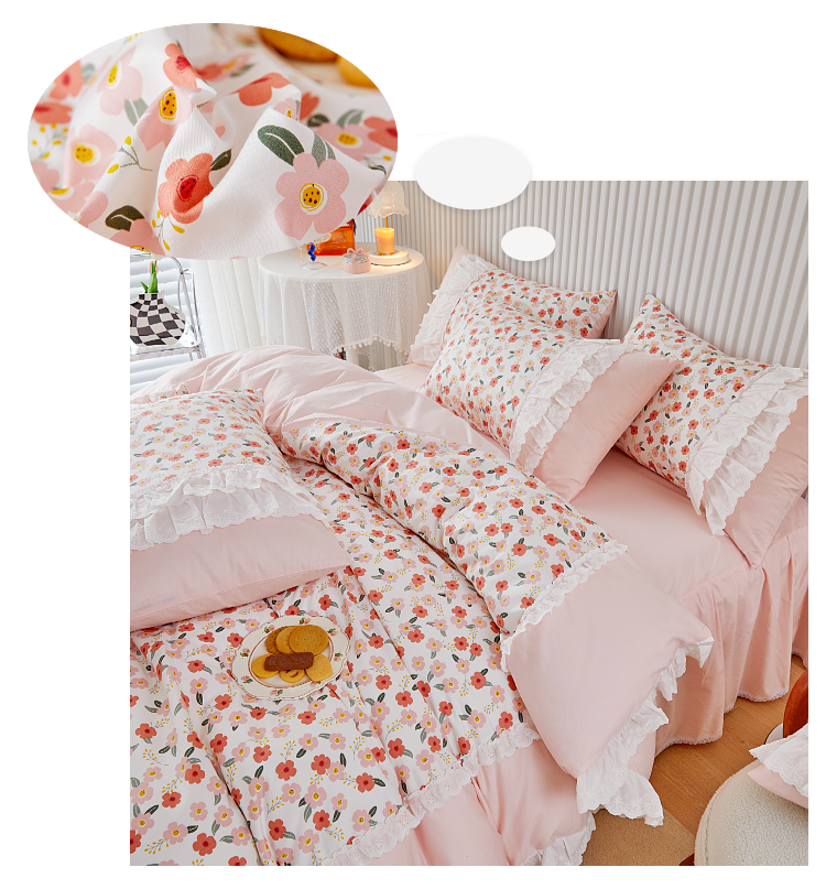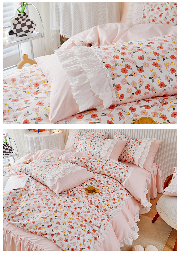 亲亲公主 2025全棉蕾丝花边床裙公主风四件套 甜心花园-粉色