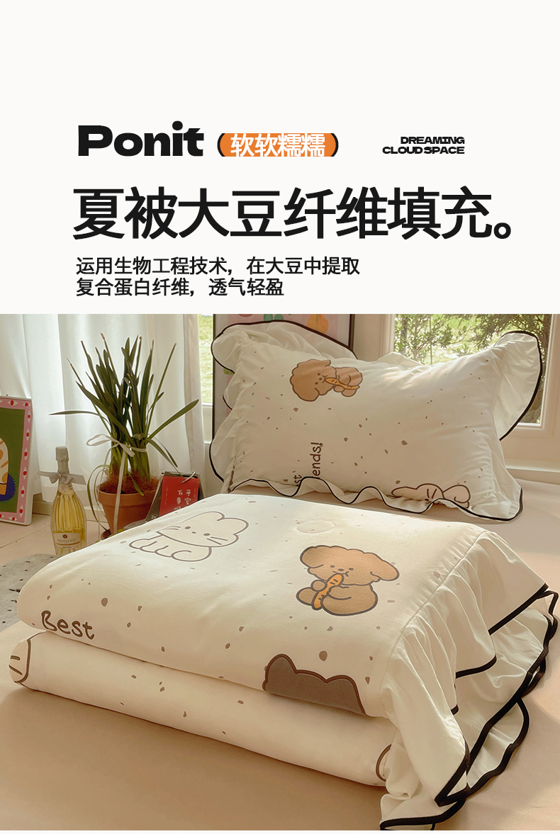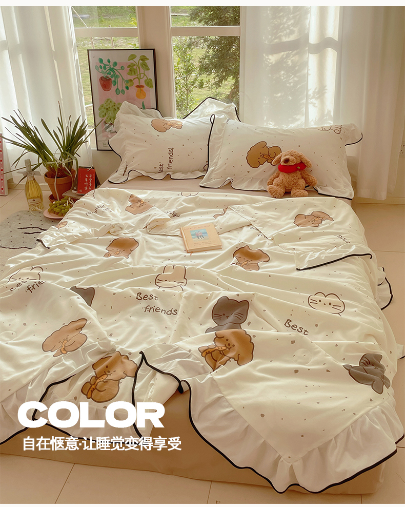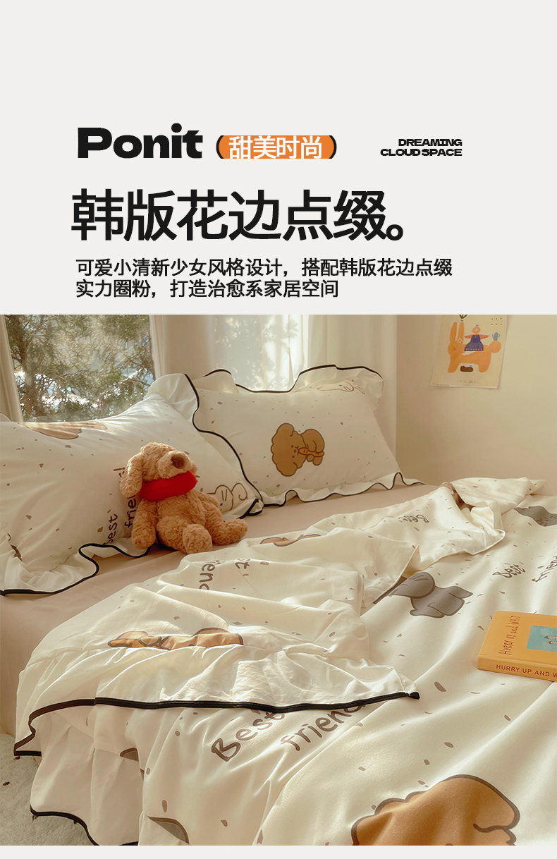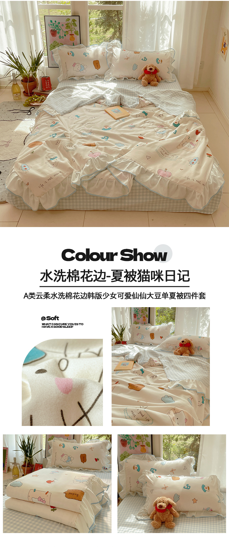 当前位置: 91家纺网 > 商品网购 > 床品套件 > 四件套 > 全棉普通四件套 > 桃心家居 2025新款A类云柔水洗棉花边韩版少女可爱仙仙大豆单夏被夏凉被空调被四件套 水洗棉花边-夏被萌萌乐园