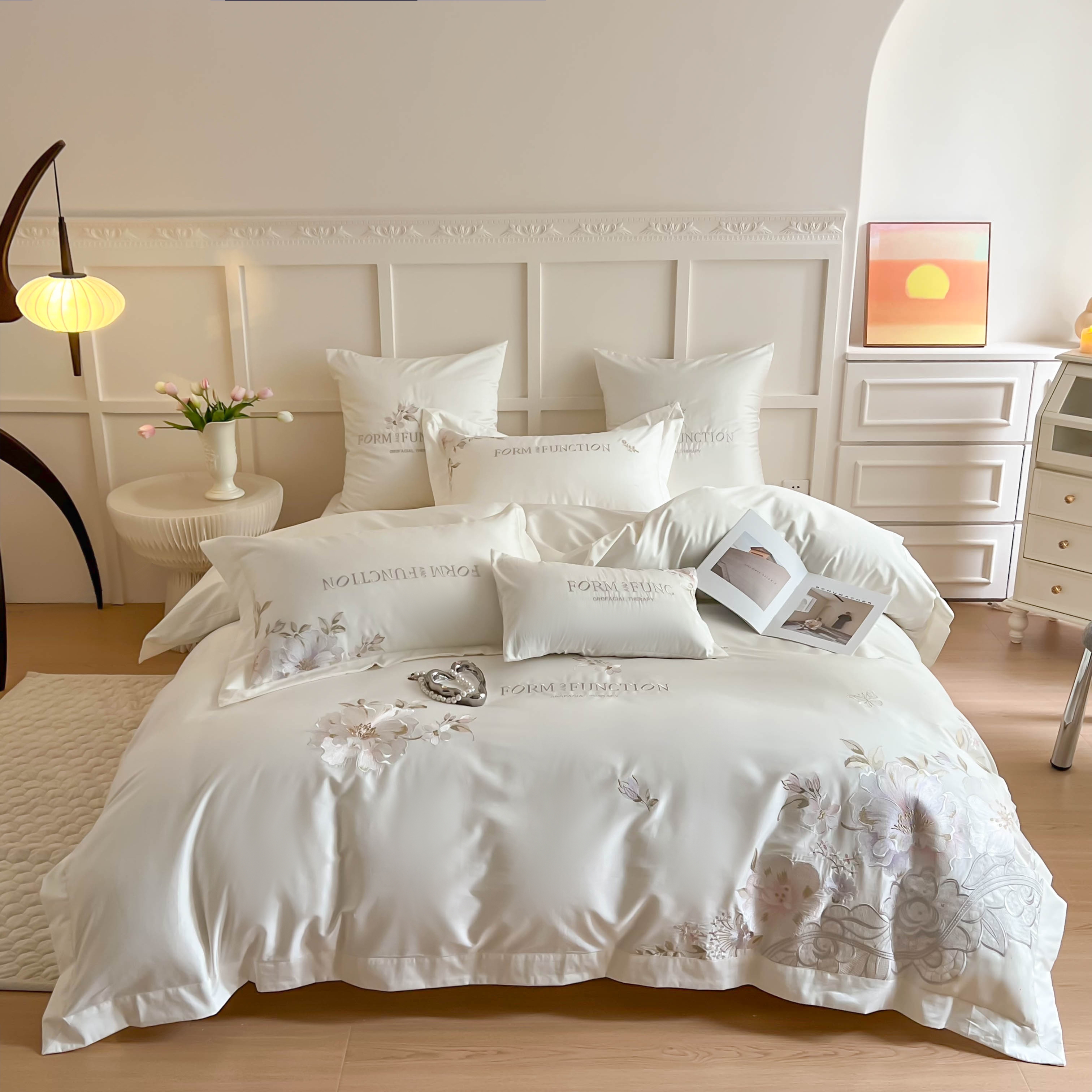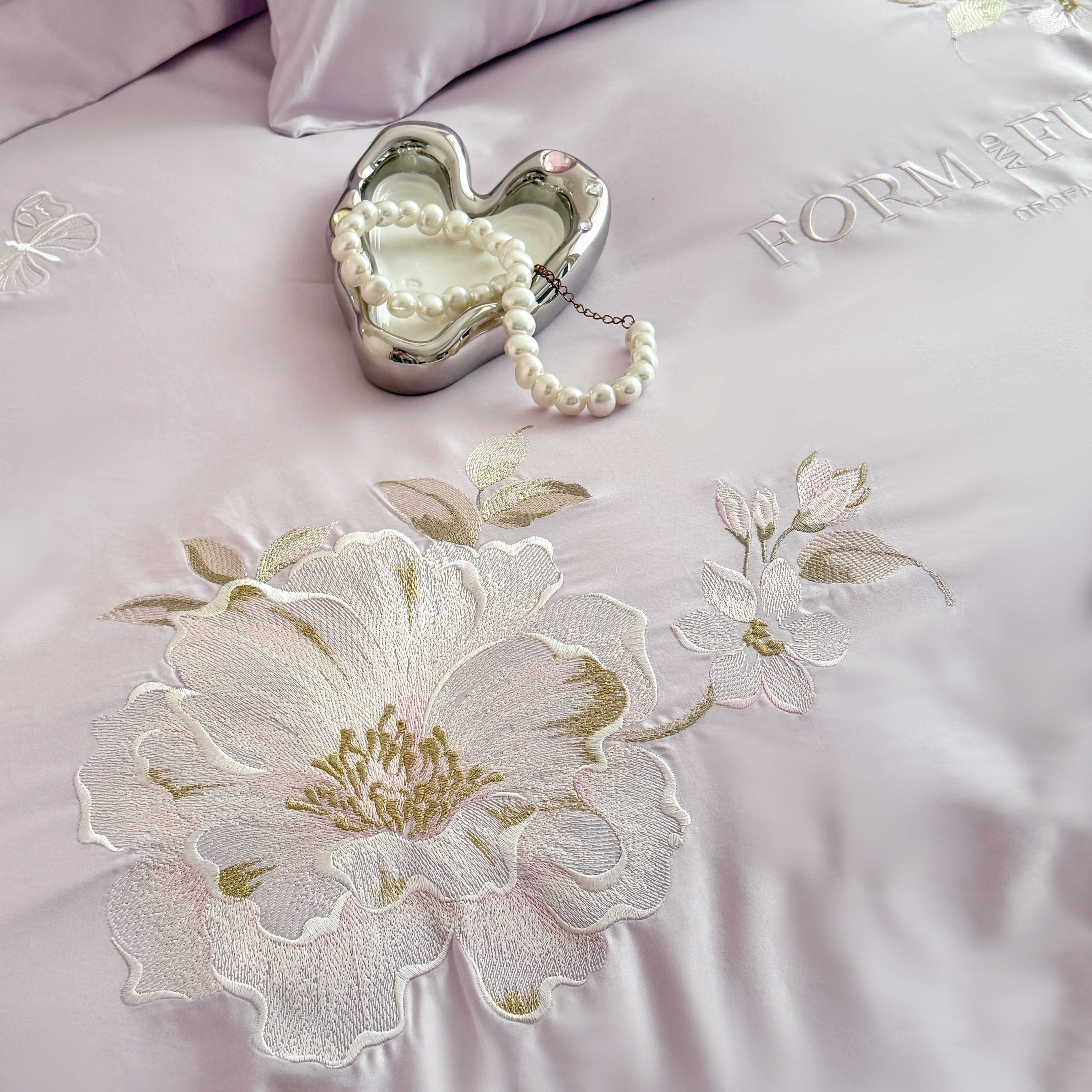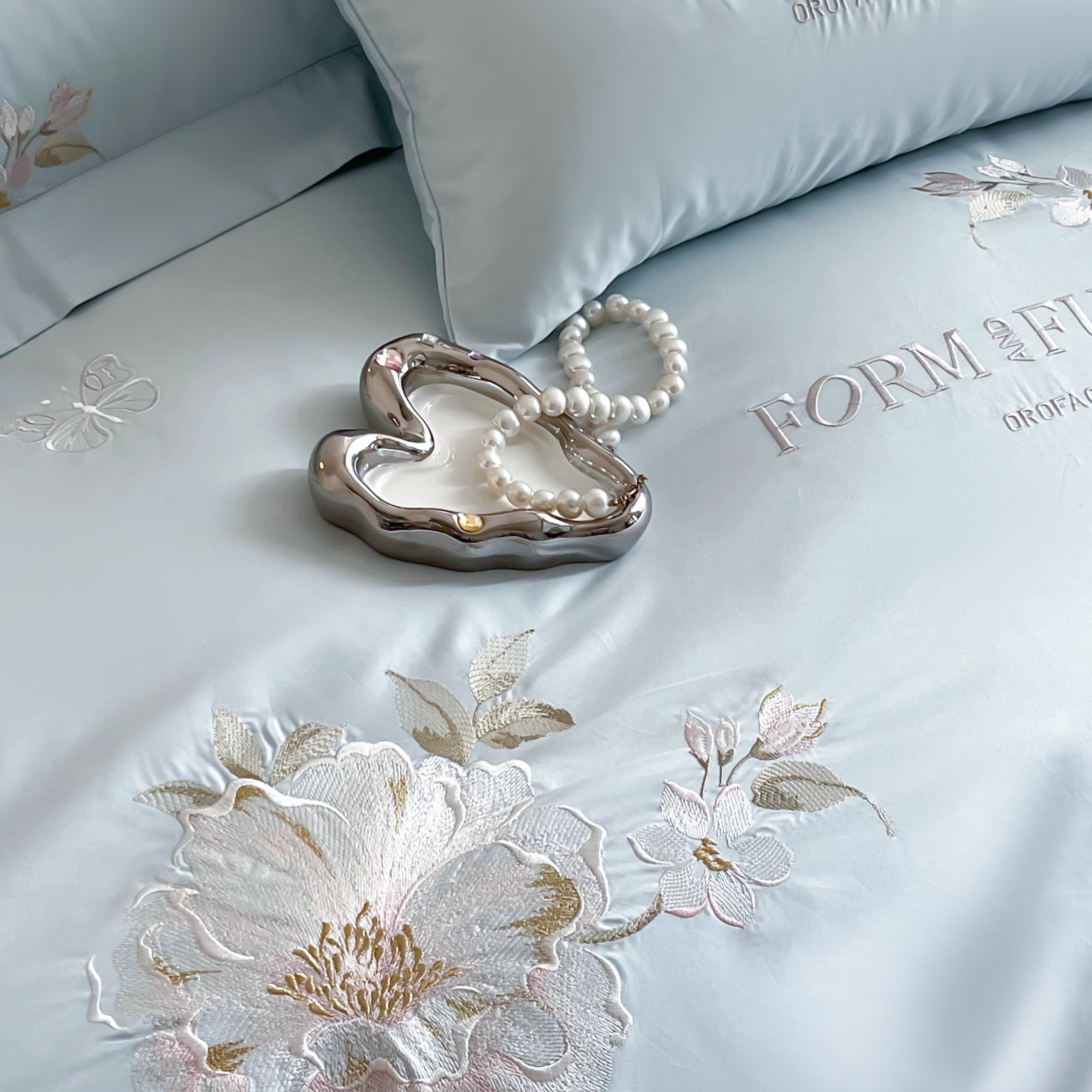 库里梦家纺 2025新款100S长绒棉纯棉刺绣四件套-春不晚花 春不晚花-浅云蓝