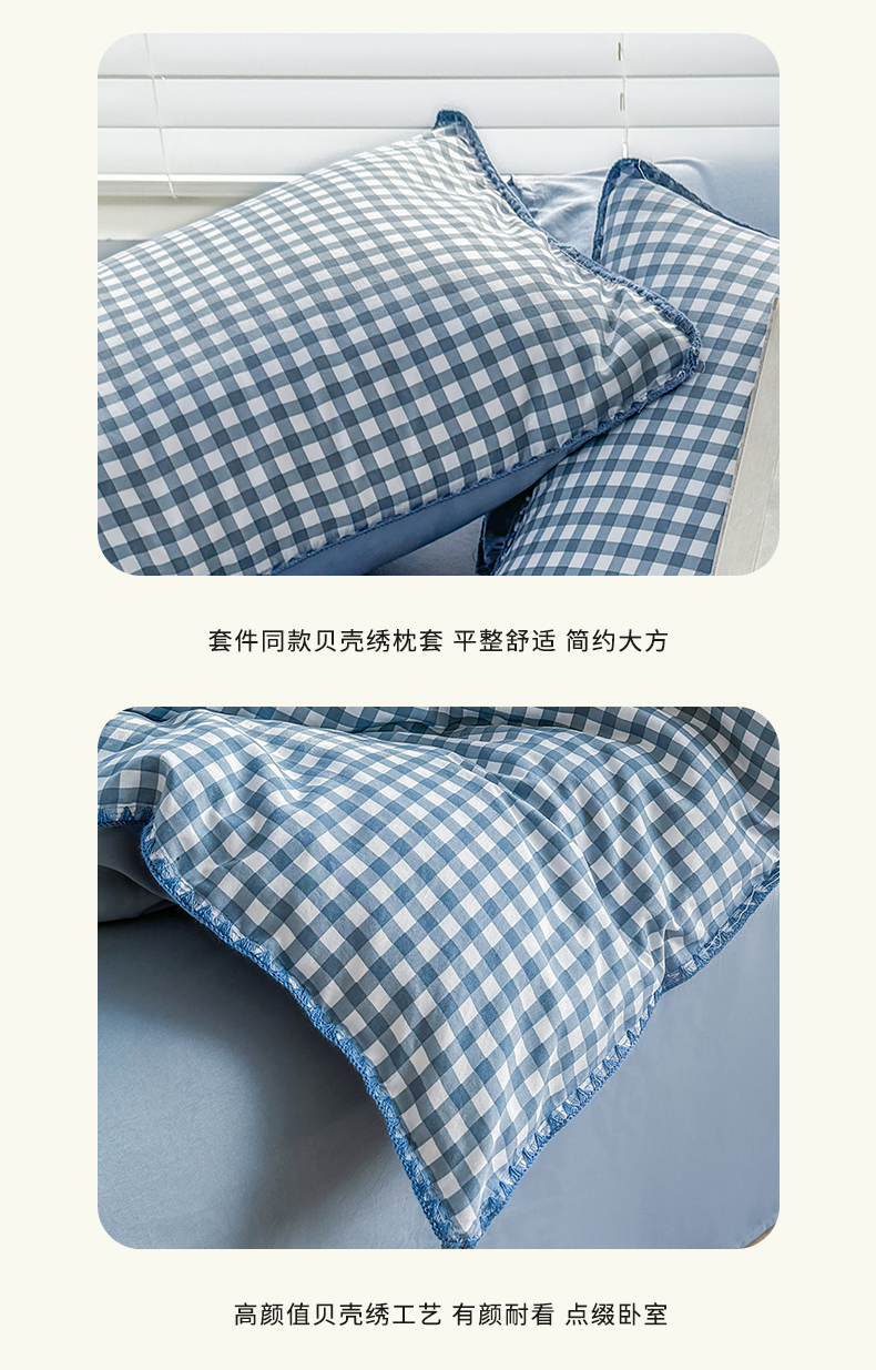 当前位置: 91家纺网 > 商品网购 > 床品套件 > 四件套 > 水洗棉四件套 > 十一家居 2025春夏新款ins风A类亲肤水洗棉贝壳绣格子四件套——暮光系列 浅蓝小格