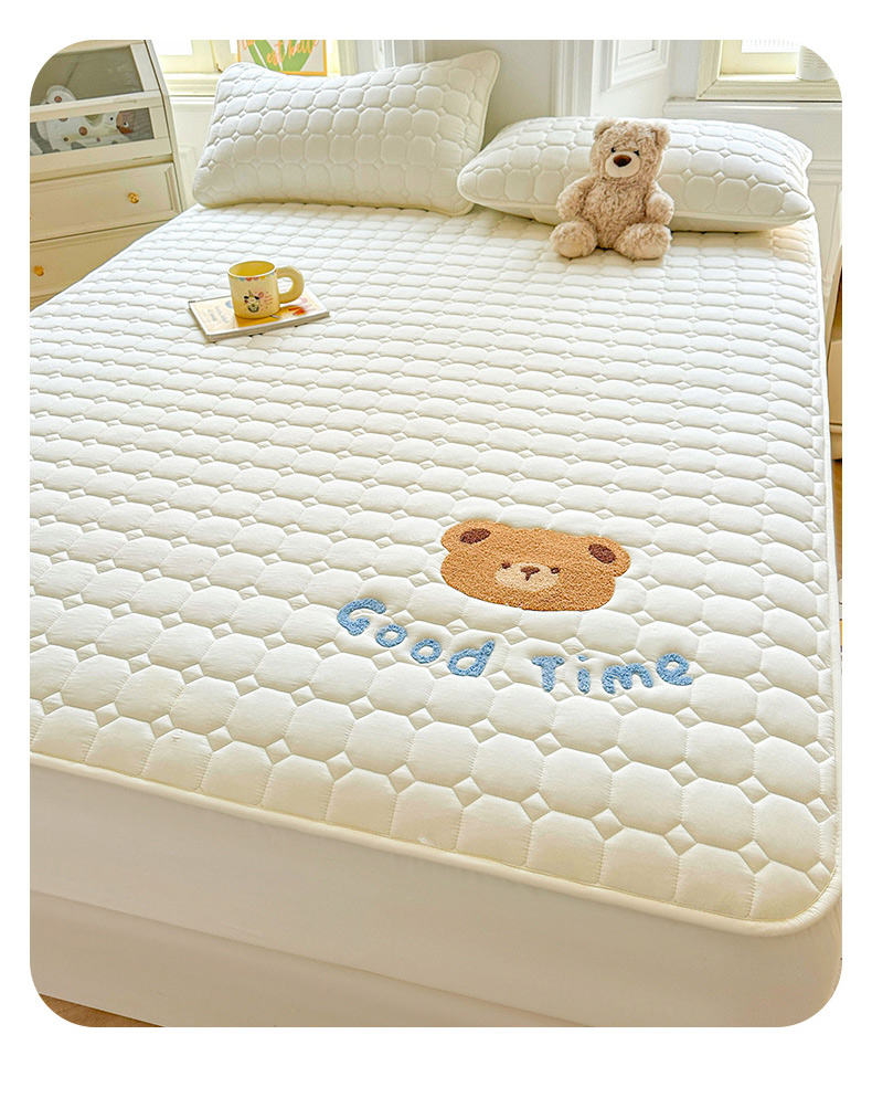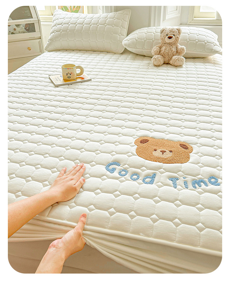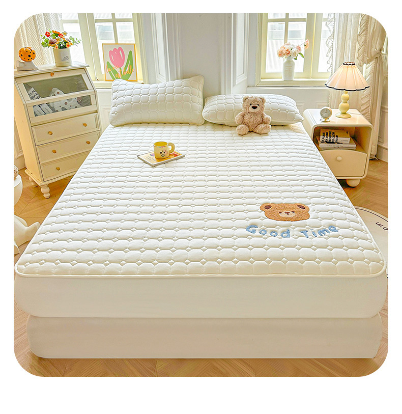 雯豆家纺 2025新品刺绣款毛巾绣夹棉床笠三件套纯色素色床护垫保护套 笨笨熊-月光白