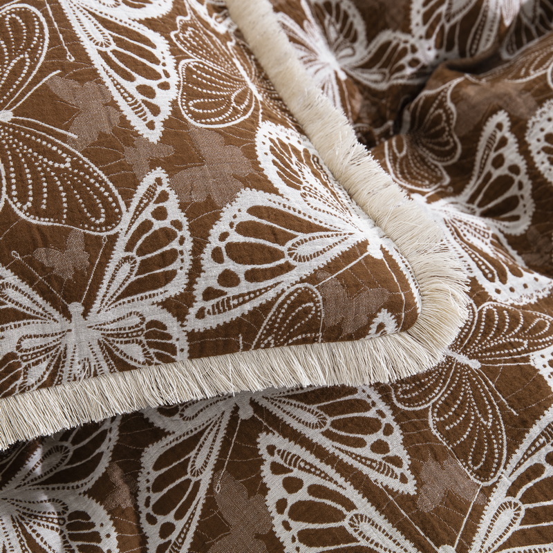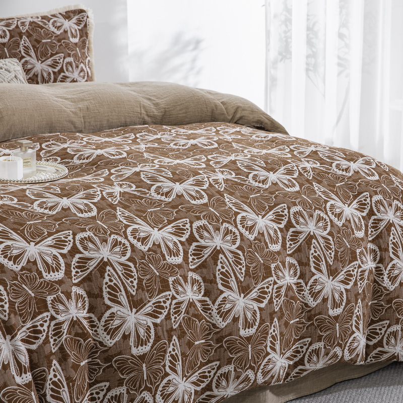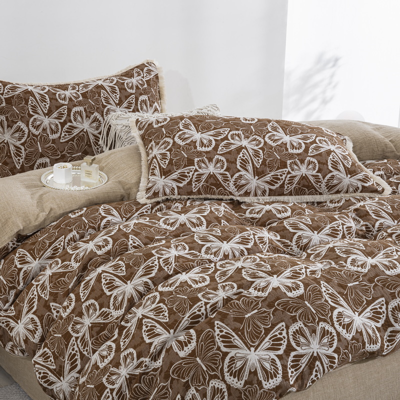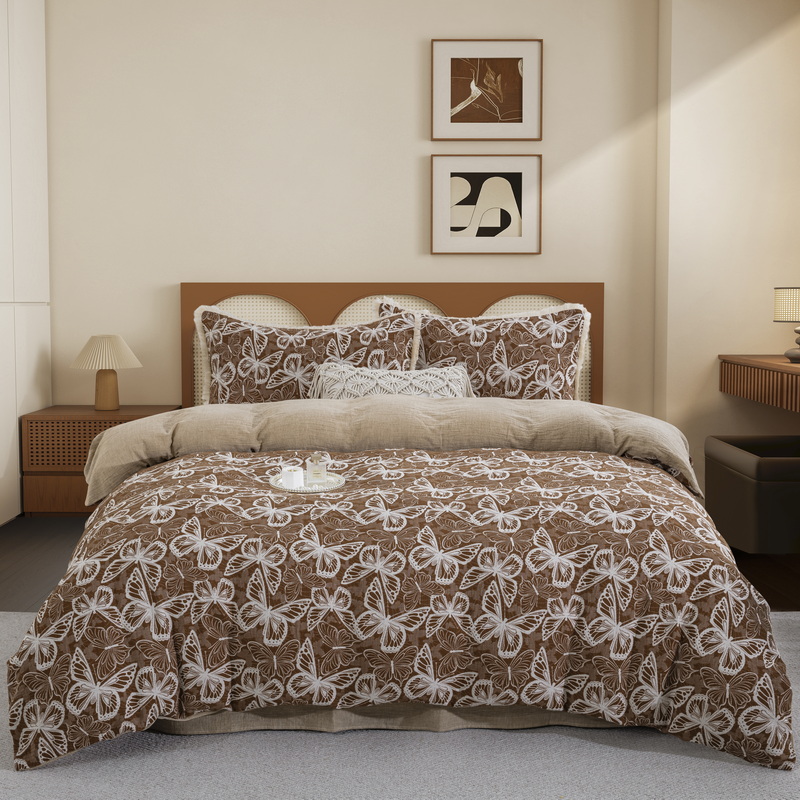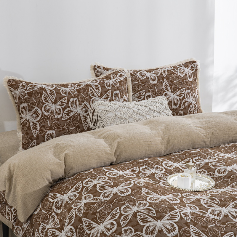 商品名称:鲁爱家纺供货 2025新款简易款双层纱四件套(纯跑量) 蝴蝶醉-咖