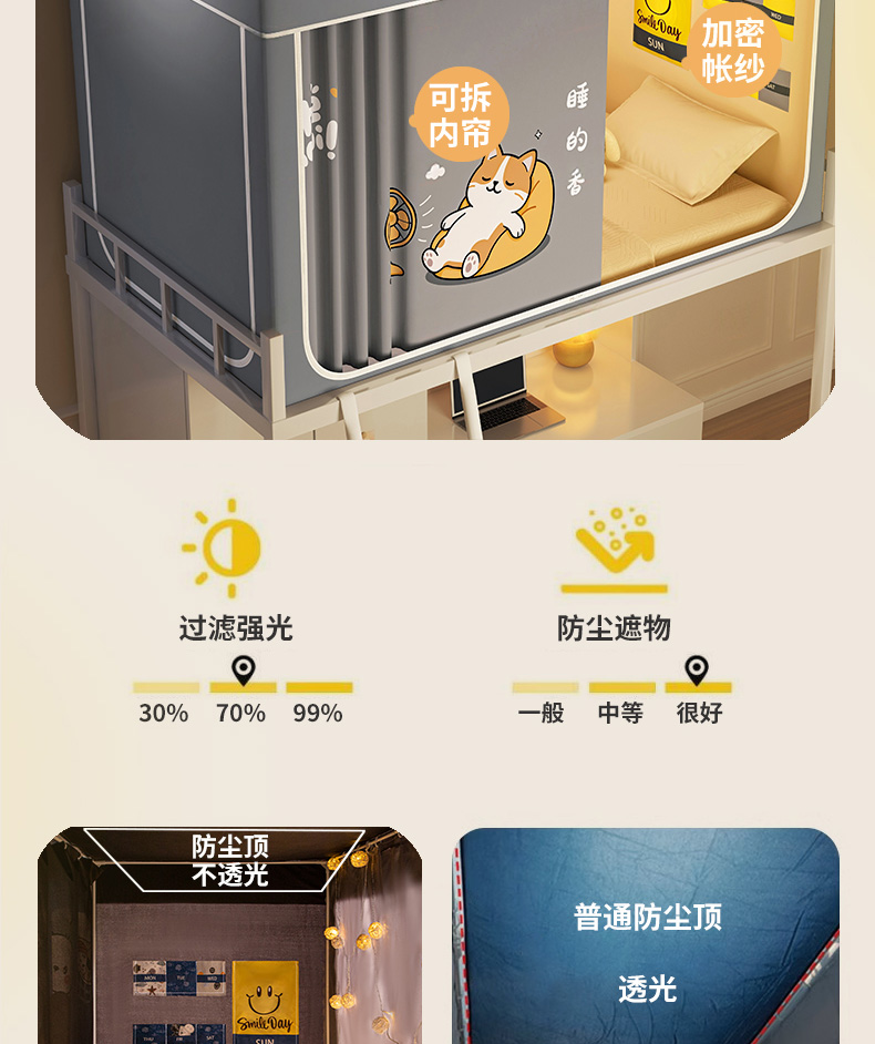 90上下铺通用(带靠墙帘):90宽x190长x90-120高(高度伸缩) | ¥105.00 |