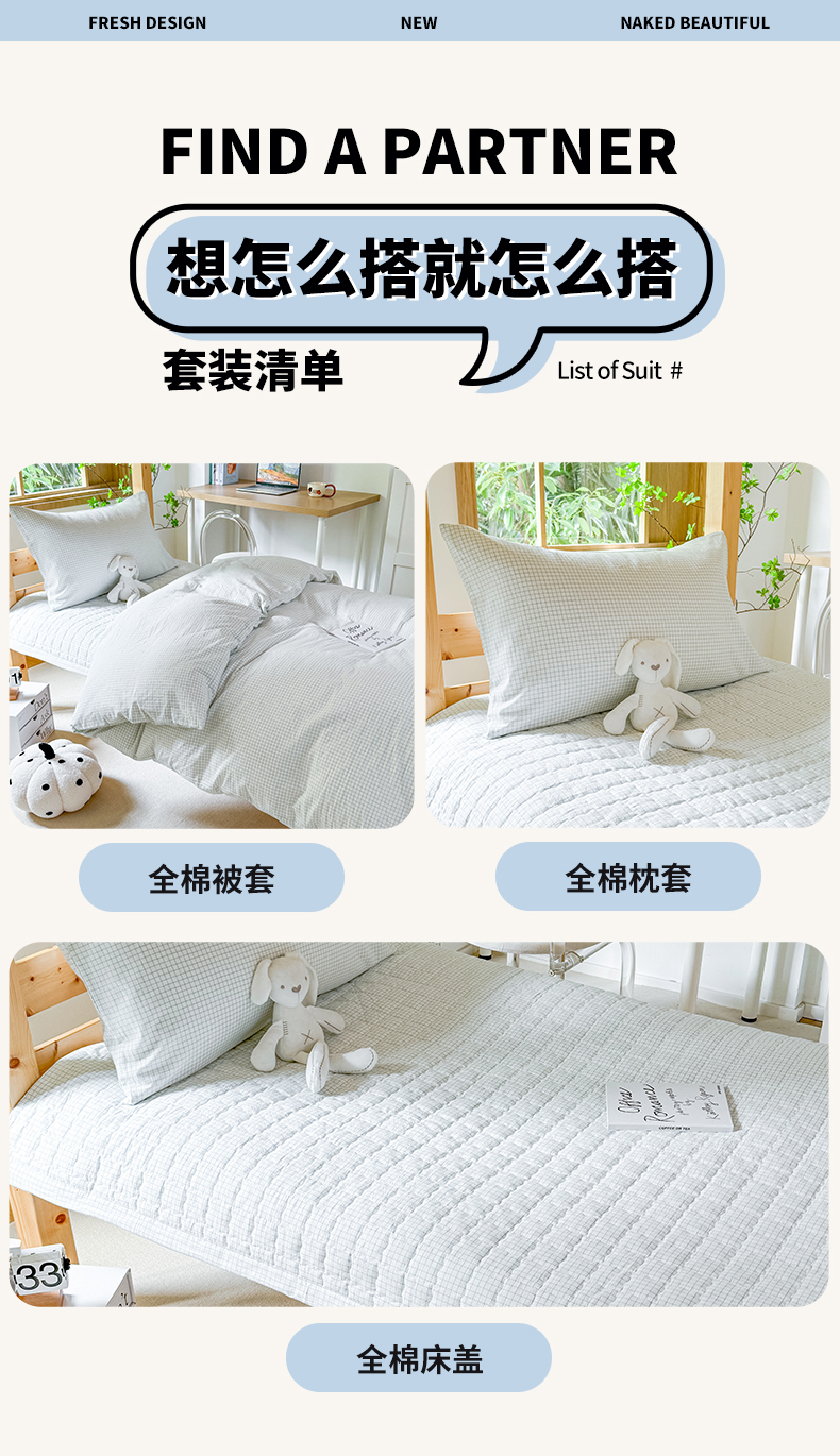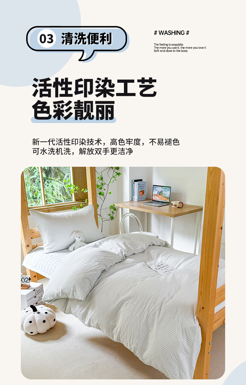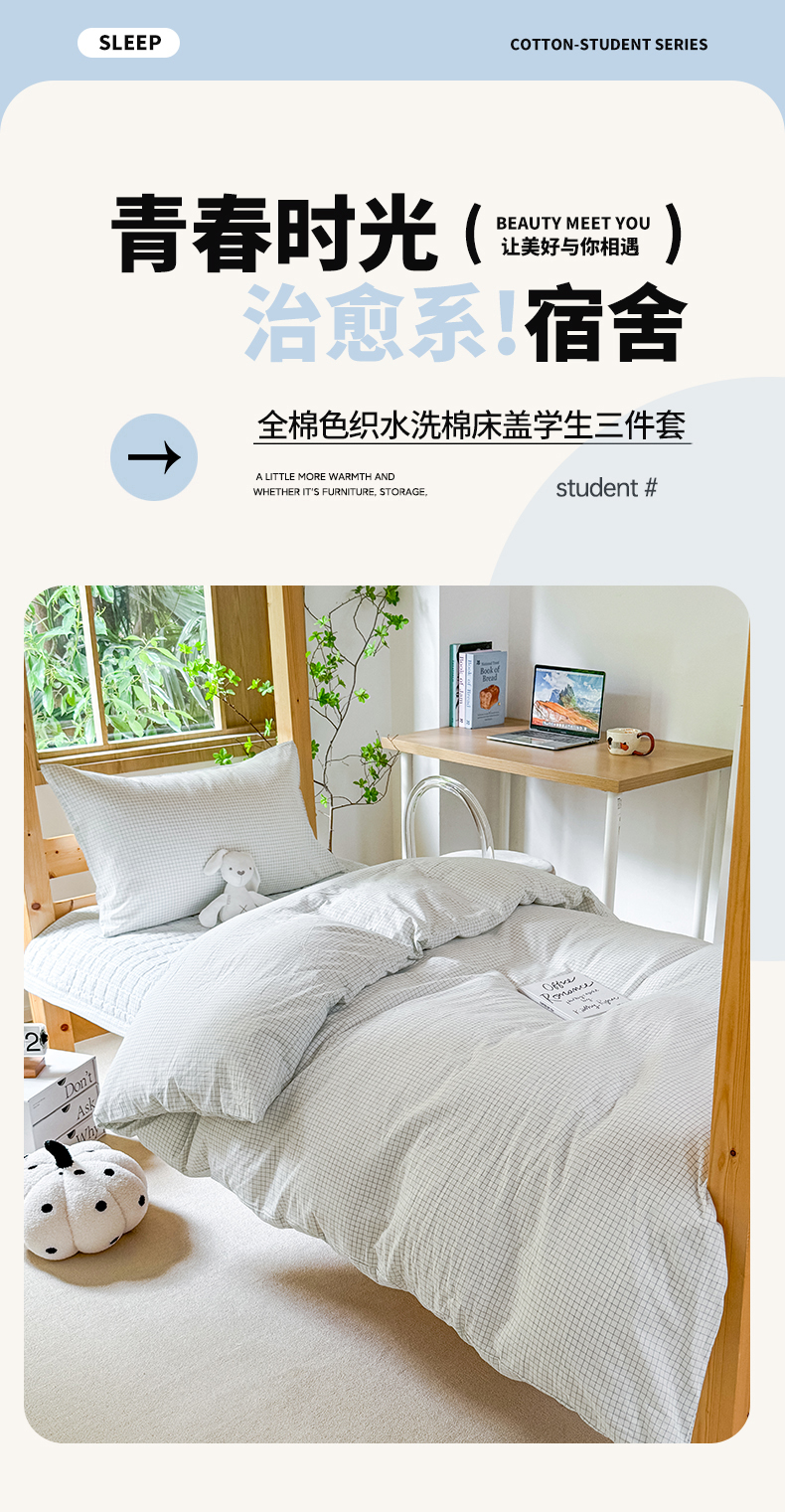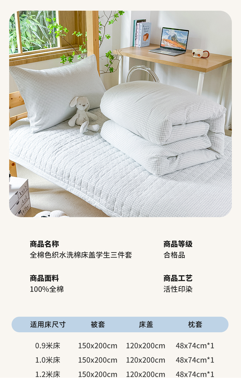 商品名称:拾物记 2025新款全棉纯棉色织水洗棉床盖学生宿舍三件套上下铺三件套 米乐蓝