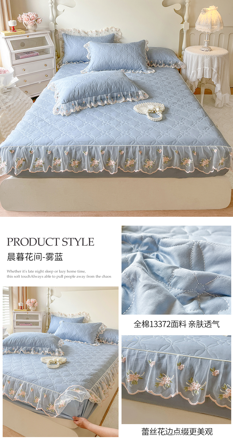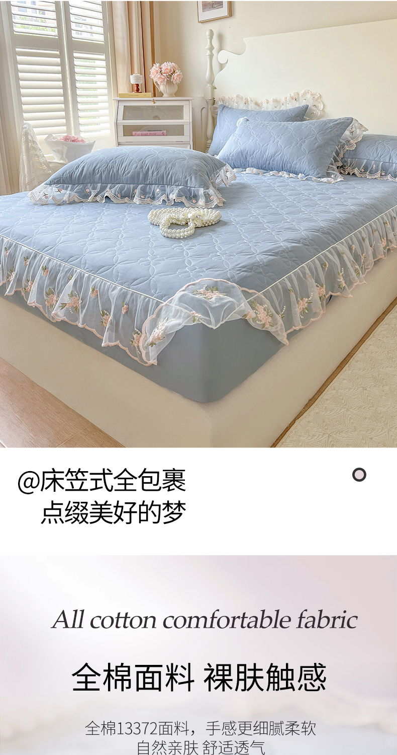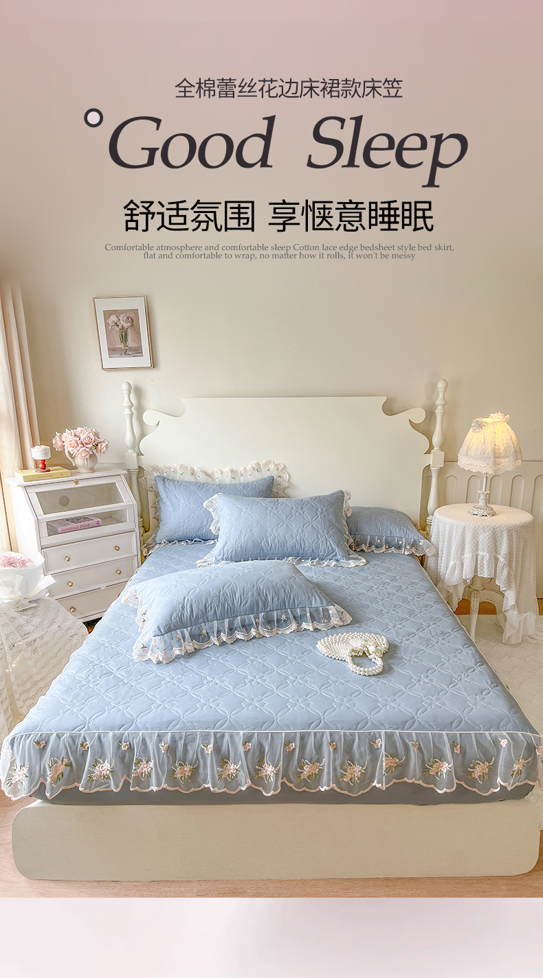 麒豆豆 2025新款全棉蕾丝边床裙款床笠-晨暮花间 晨暮花间-雾蓝