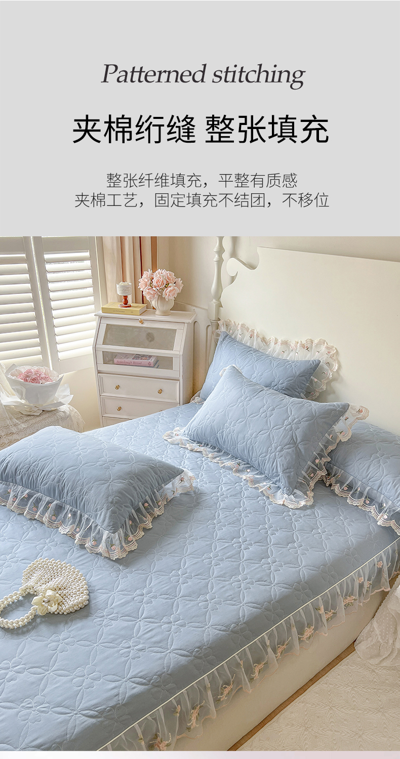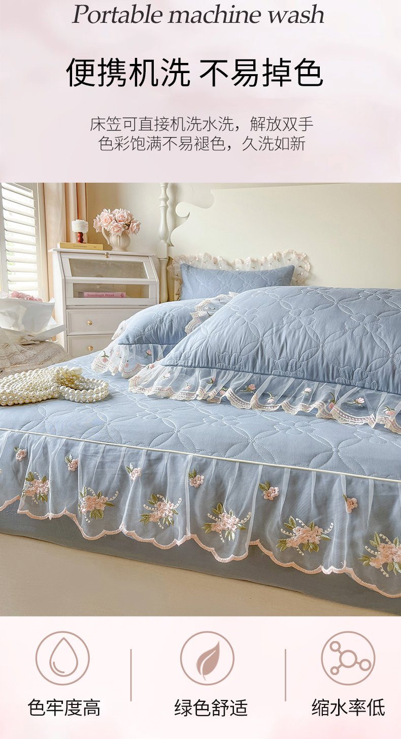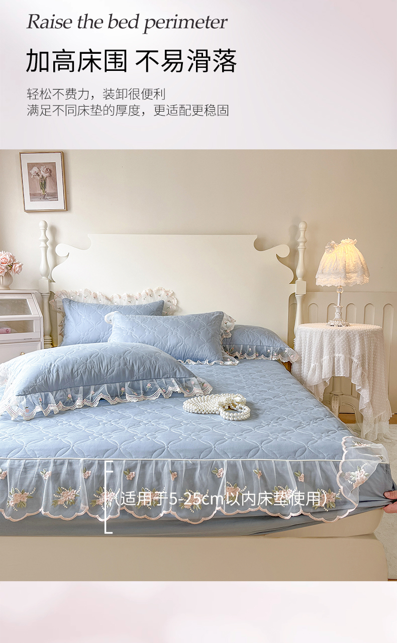 麒豆豆 2025新款全棉蕾丝边床裙款床笠-晨暮花间 晨暮花间-雾蓝