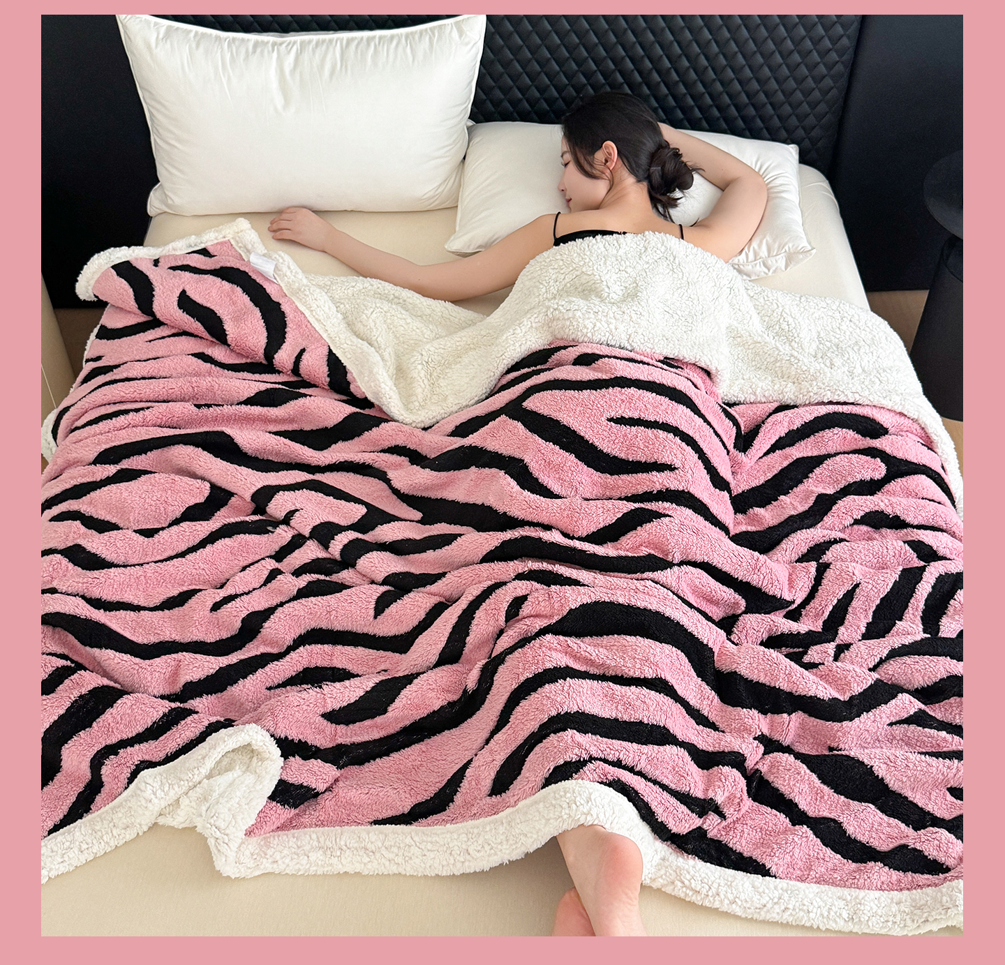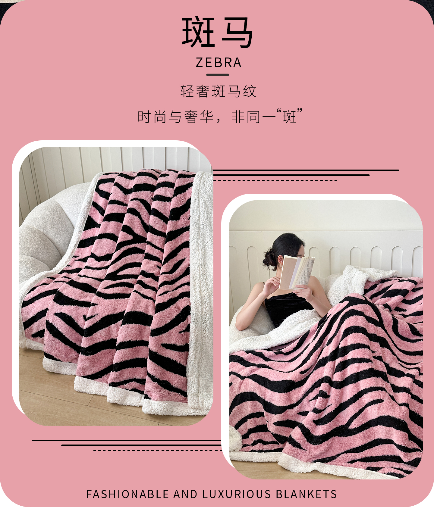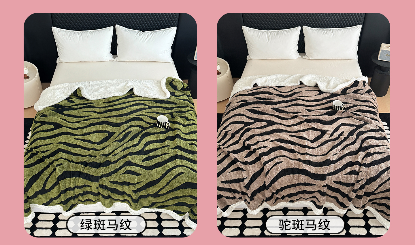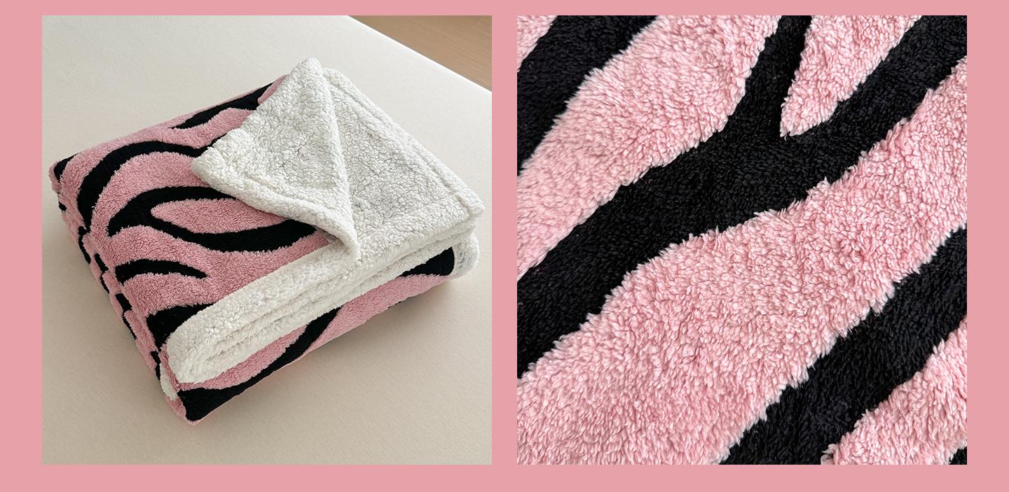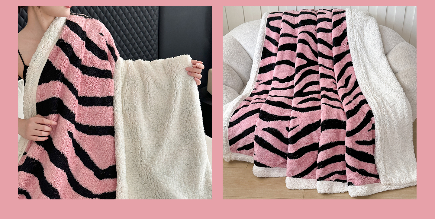 商品名称:丹本家纺 2025新款双层阳离子斑马纹提花塔芙绒羊羔绒跨境双层毛毯盖毯毯子 粉斑马纹
