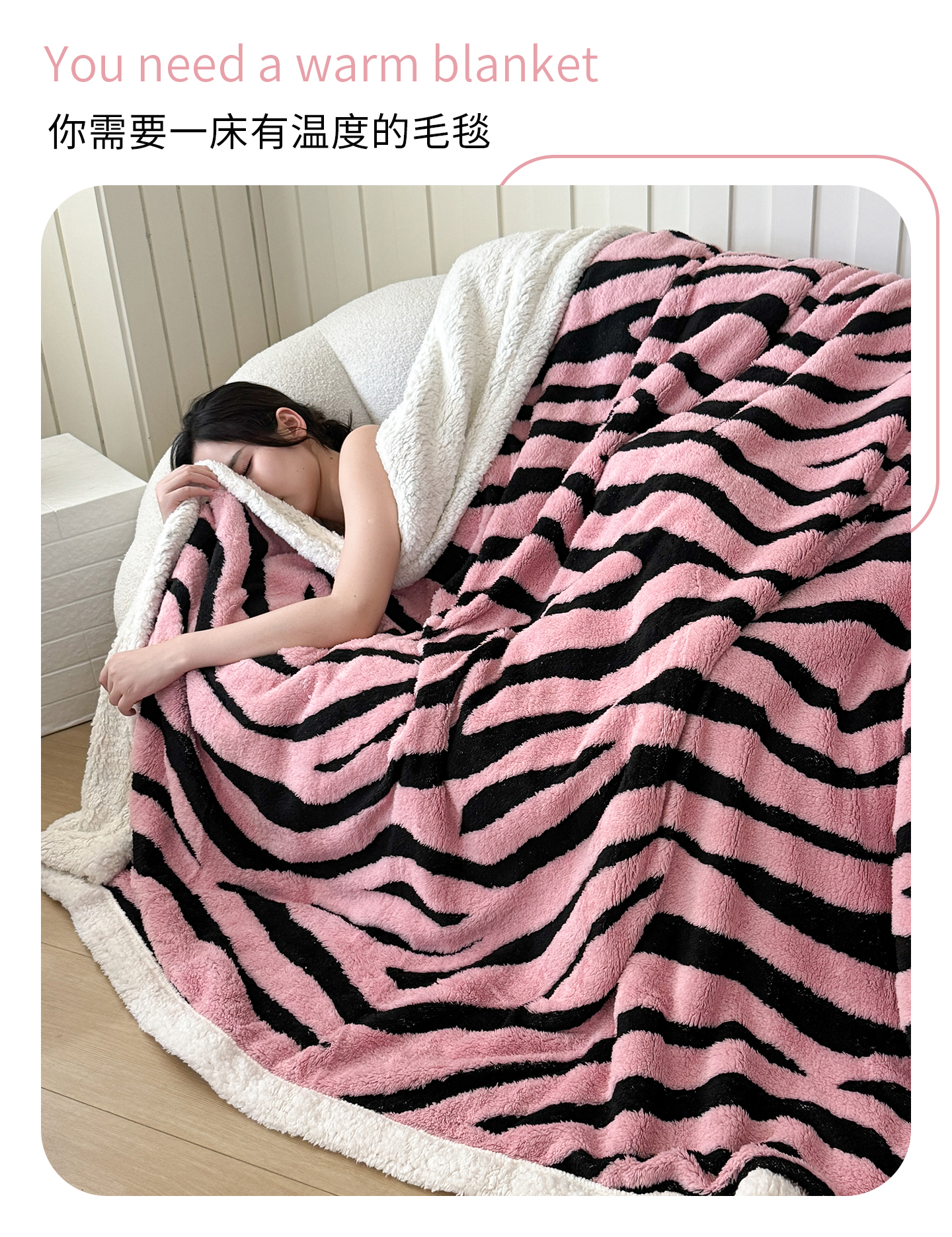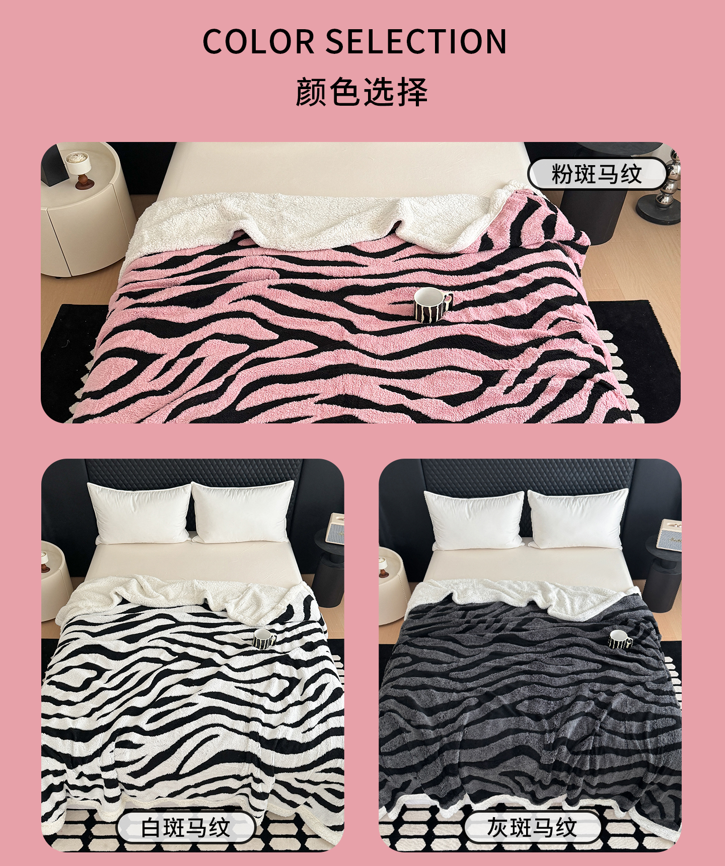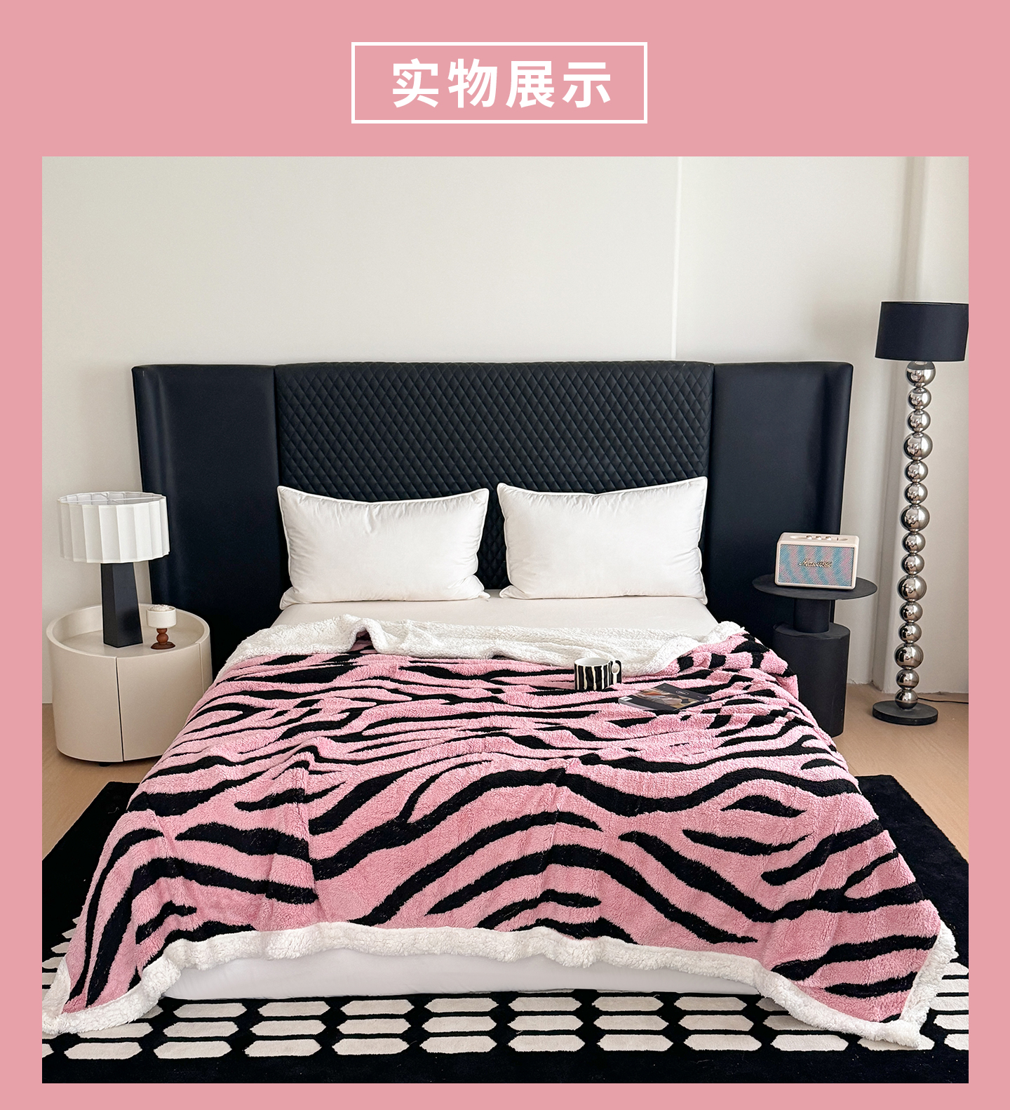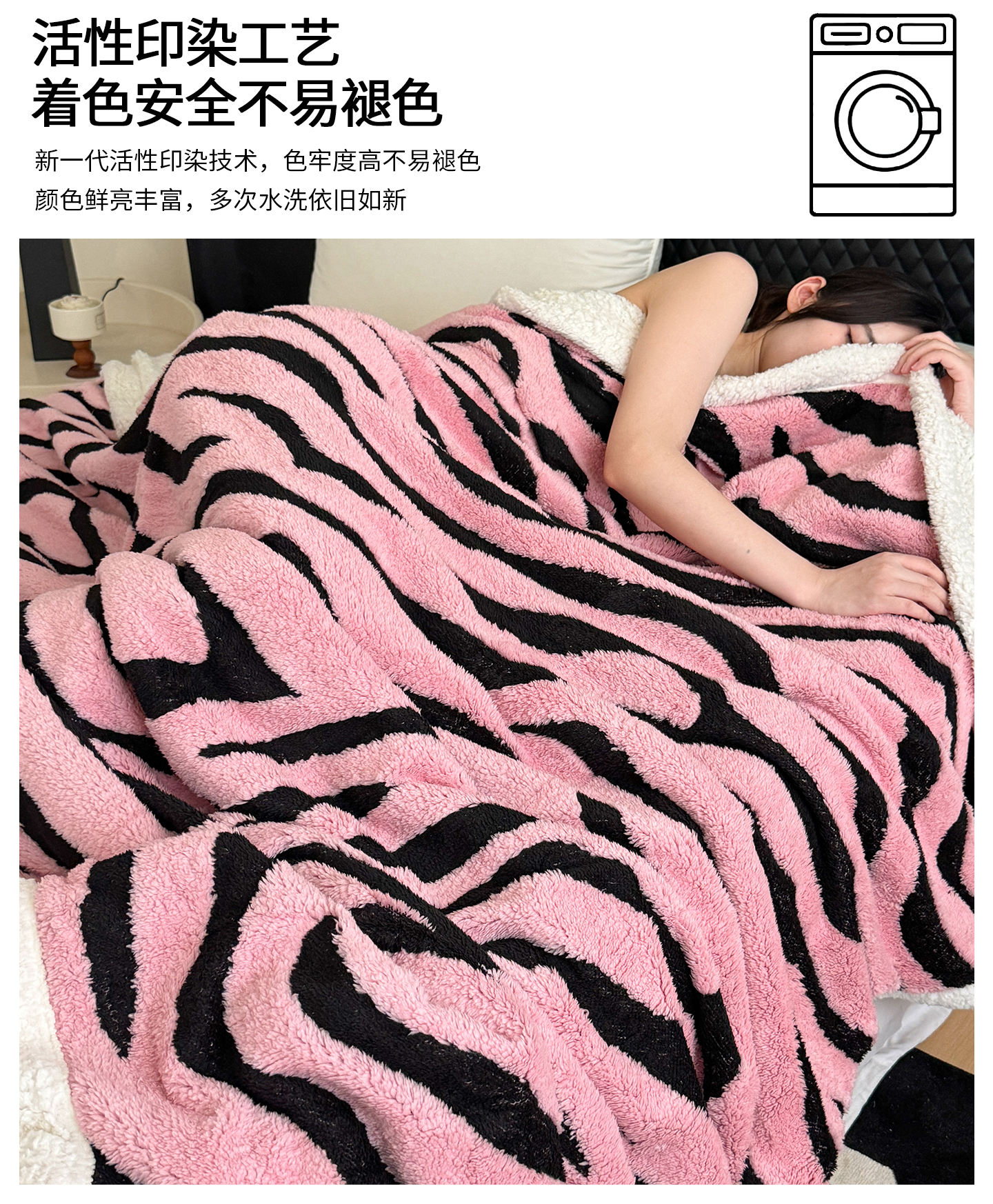 商品名称:丹本家纺 2025新款双层阳离子斑马纹提花塔芙绒羊羔绒跨境双层毛毯盖毯毯子 粉斑马纹