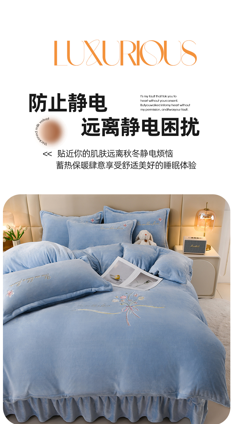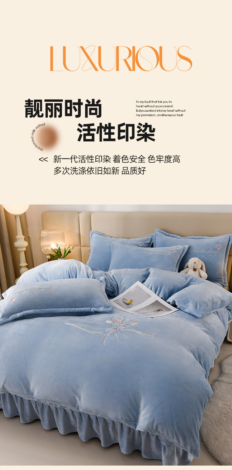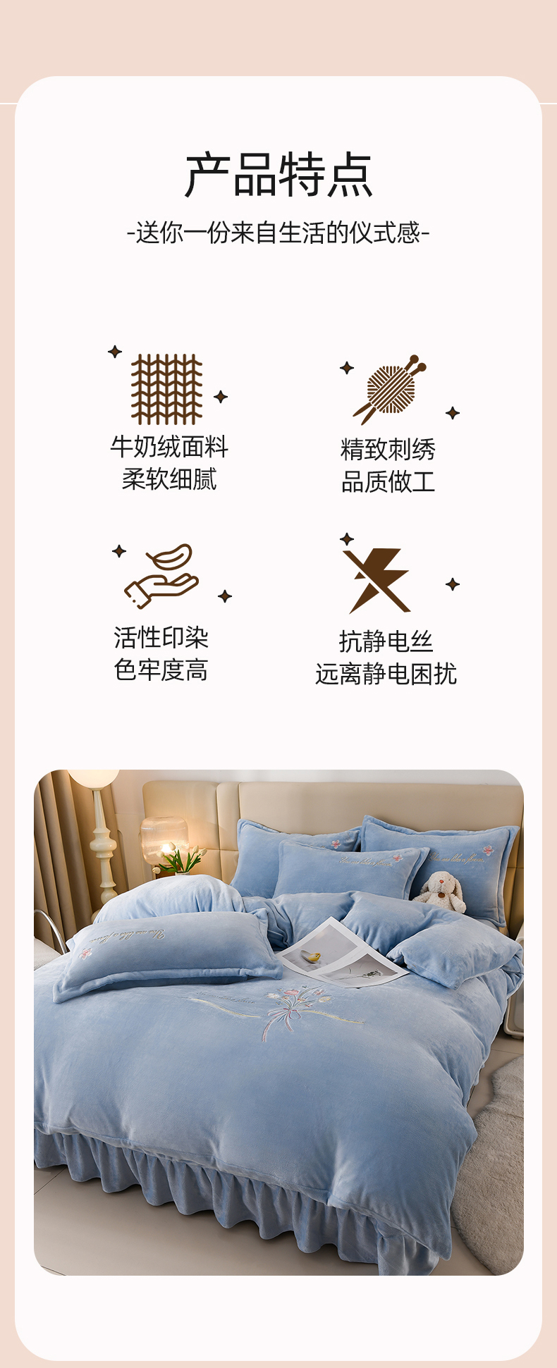 (总)绣女坊2023新款韩版花边床裙款牛奶绒宝宝绒四件套,宾利蓝,豆沙,灰色,酒红色,松花绿,紫色
