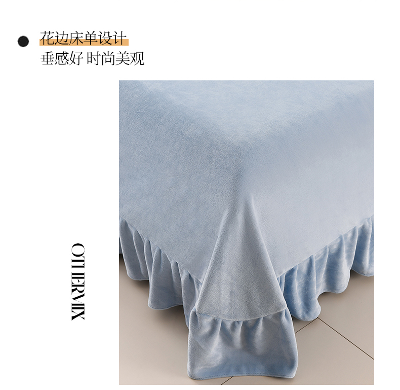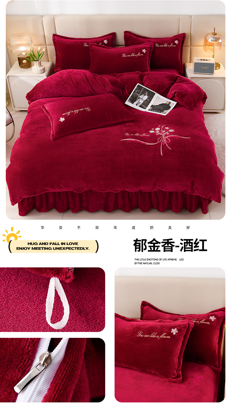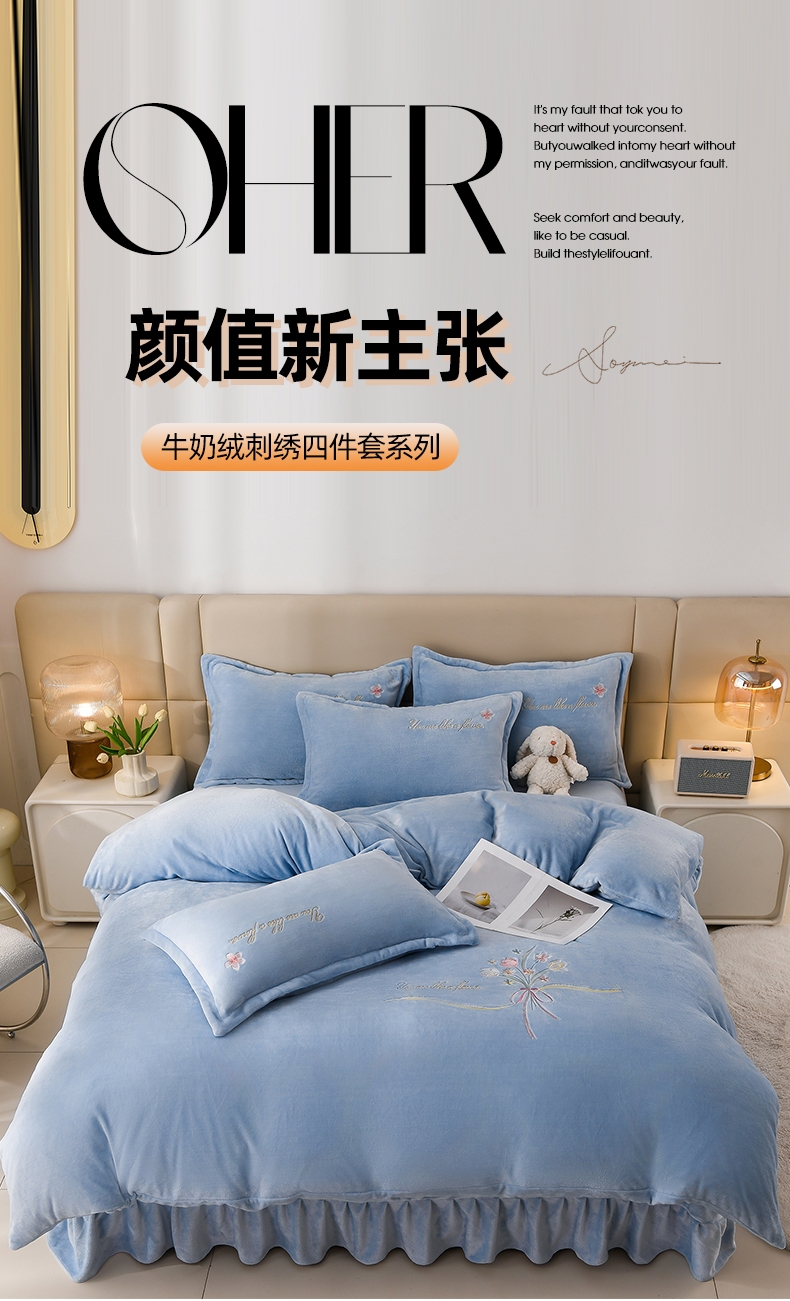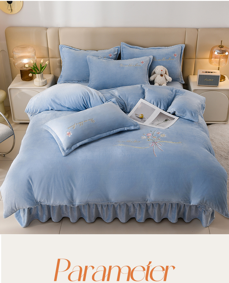 (总)绣女坊2023新款韩版花边床裙款牛奶绒宝宝绒四件套,宾利蓝,豆沙,灰色,酒红色,松花绿,紫色