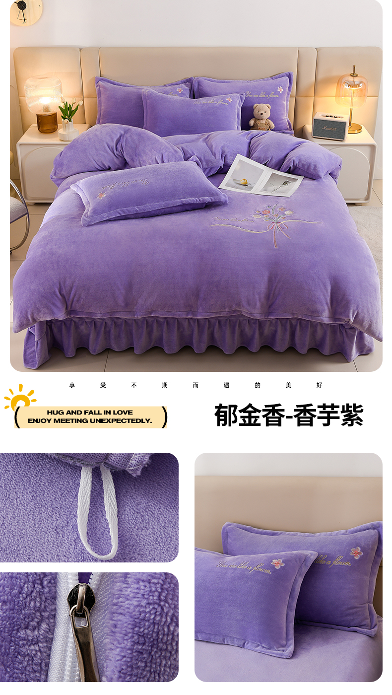 2023牛奶绒保暖四件套韩版蕾丝花边,紫色,松花绿,灰色,豆沙,宾利蓝