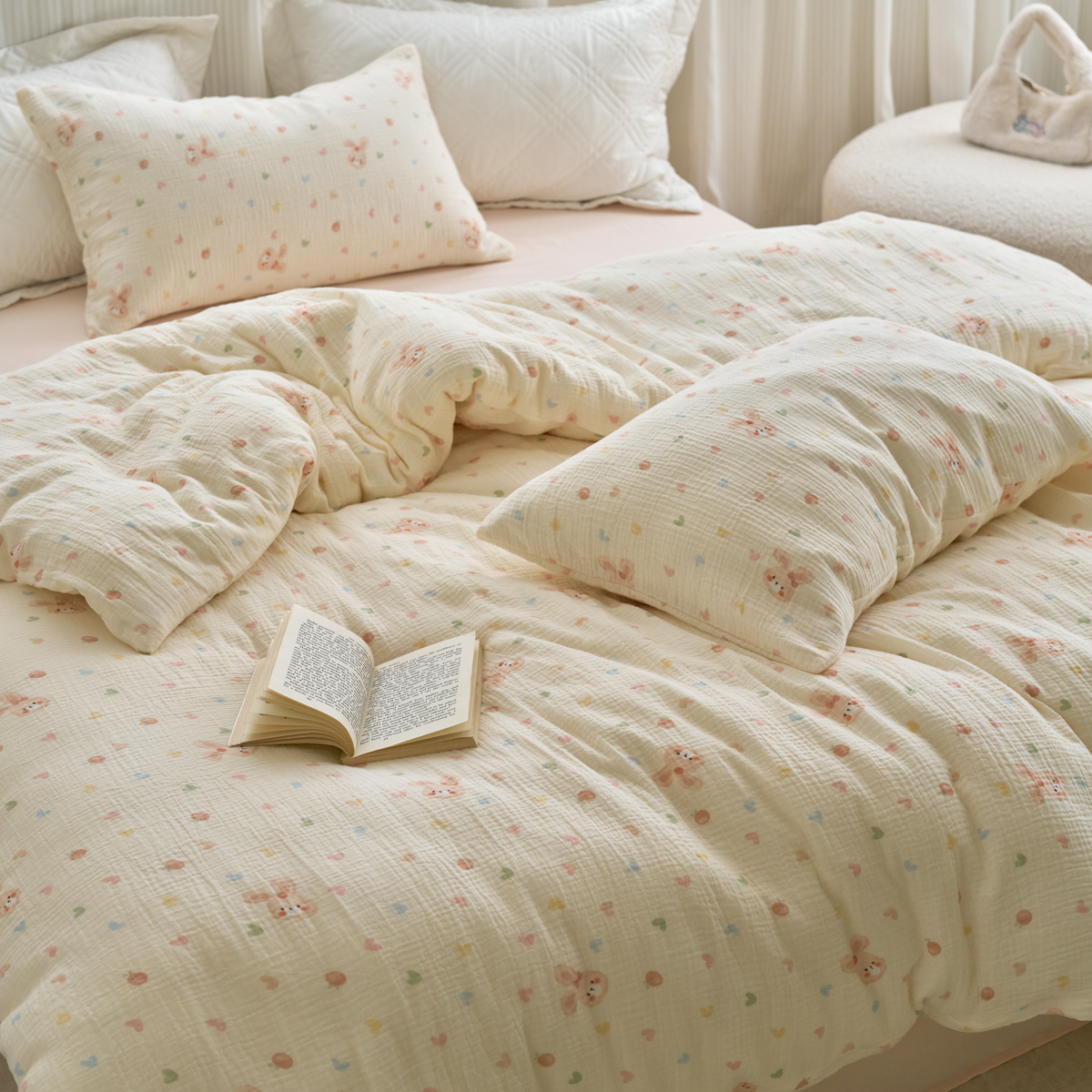 (总)洋铭区(原狠狠爱) 2026新款春季全棉彩边双层纱四件套,爱心宝莉,波斯小懒狗,繁花兔兔,格格小熊,海蓝小木马,红格小马,红枣小兔,花朵兔兔,焦糖小熊,兰花香,绿芽小马,萌宠小分队,奶茶蝴蝶结,奶糕熊熊,汽车派对,桃桃粉花,甜果小象,图图小狮子,幸运小可爱,熊猫嘟嘟,遇见粉花,月光宝宝