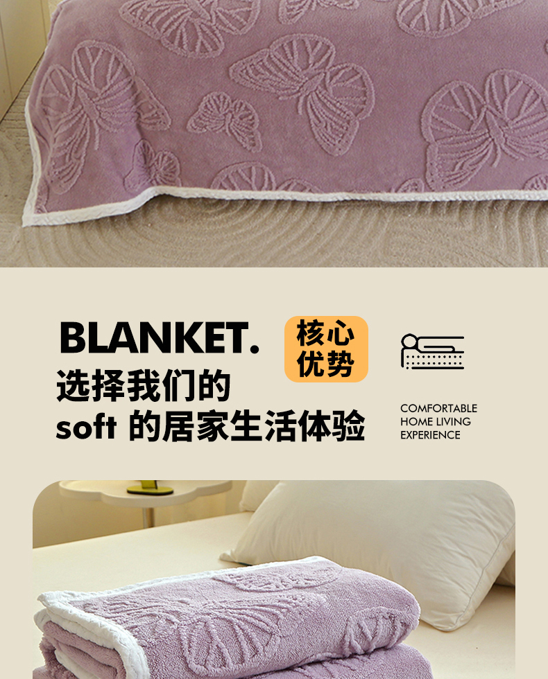 (总)莱家富 2026新款加厚双层复合毯舒棉绒剪花毛毯,兰色,绿色,米色,深灰色,樱花粉,紫色