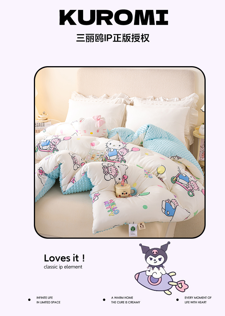 • 91家纺网 家纺一手货源 找家纺 (总)米乐被业 2025新款三丽鸥水洗棉豆豆被被子被芯冬被,波点大耳狗,草莓美乐蒂,可爱KT猫,库洛米之心,库洛米总动员,帕恰狗,樱花KT猫