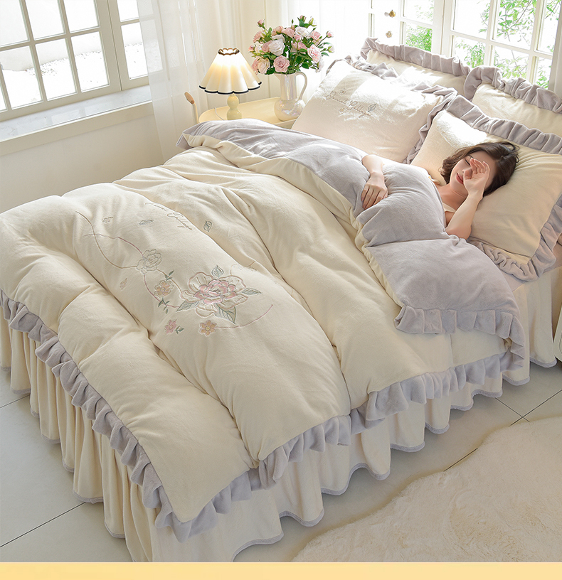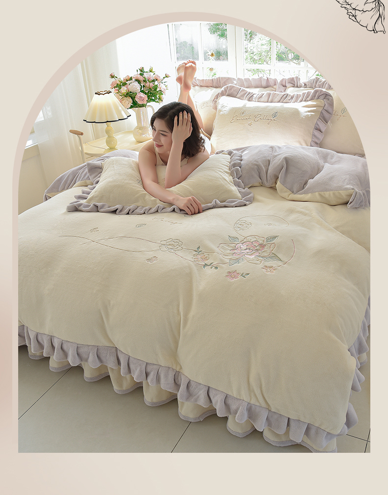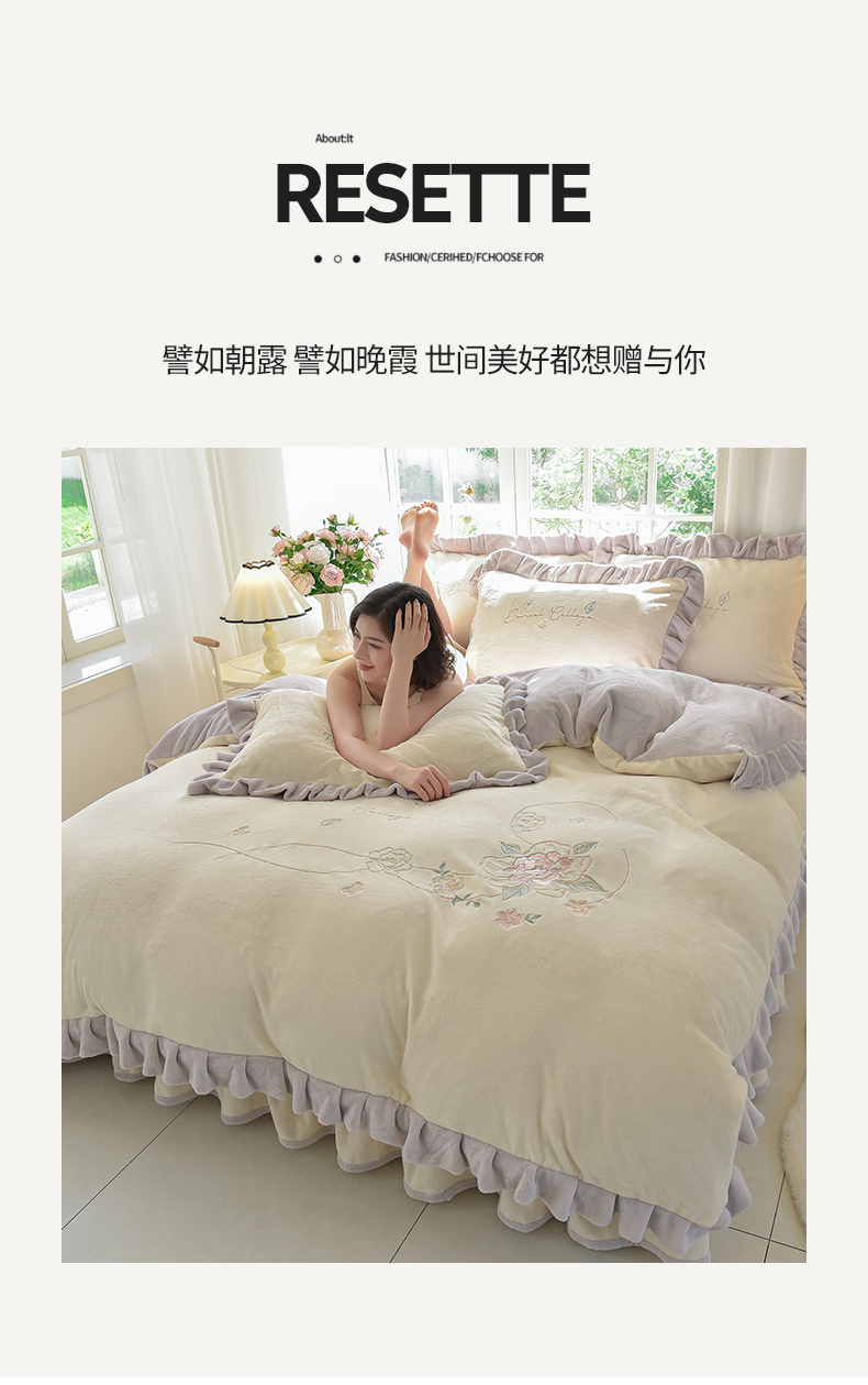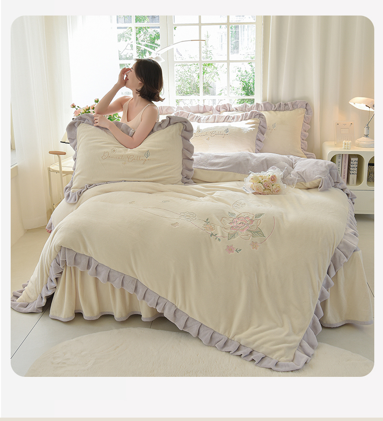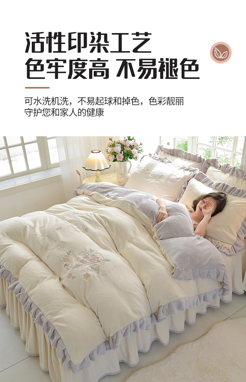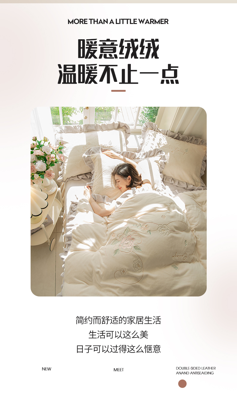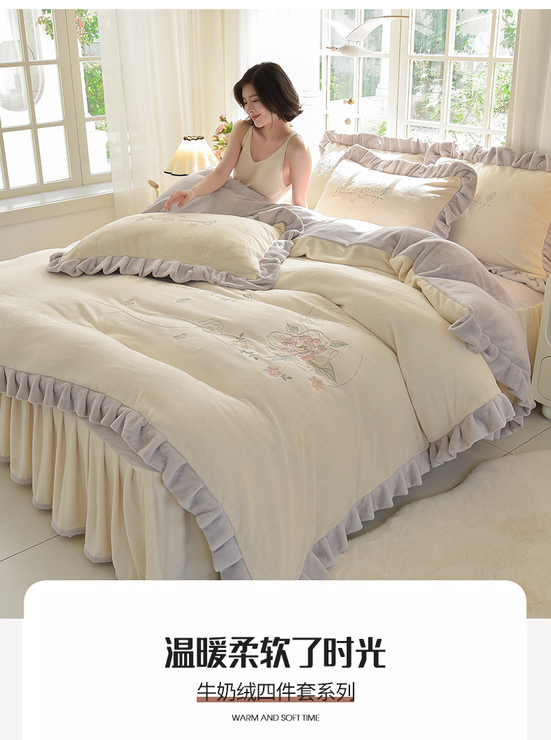 (总)鑫喜莱家纺 2025新款刺绣双层花边牛奶绒四件套(注意控价 标准尺寸156元,实际售价不得低于控价的价格)