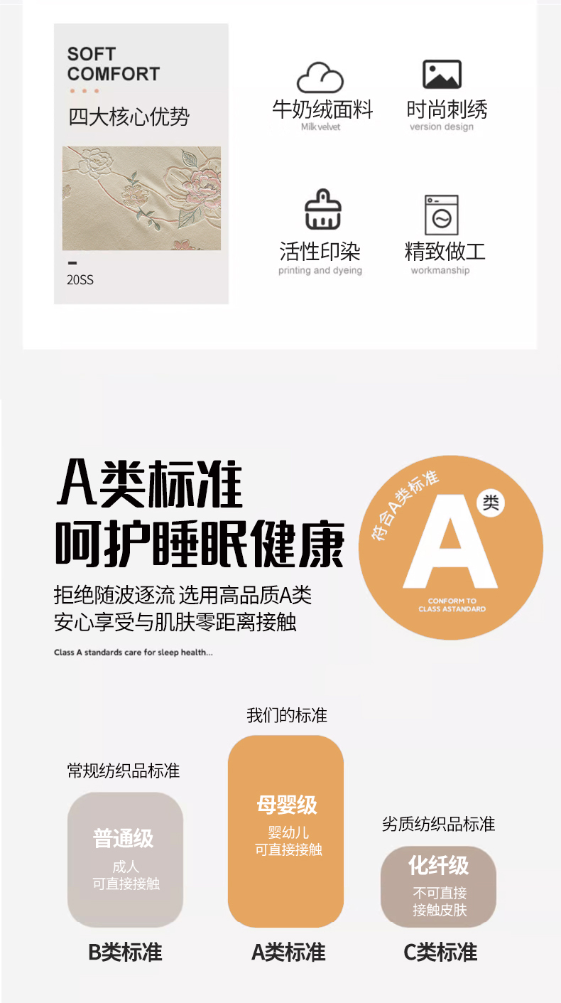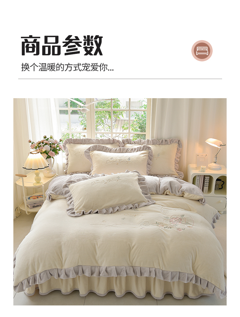 商品名称:(总)鑫喜莱家纺 2025新款刺绣双层花边牛奶绒四件套(注意控价 标准尺寸156元,实际售价不得低于控价的价格)