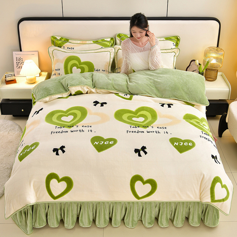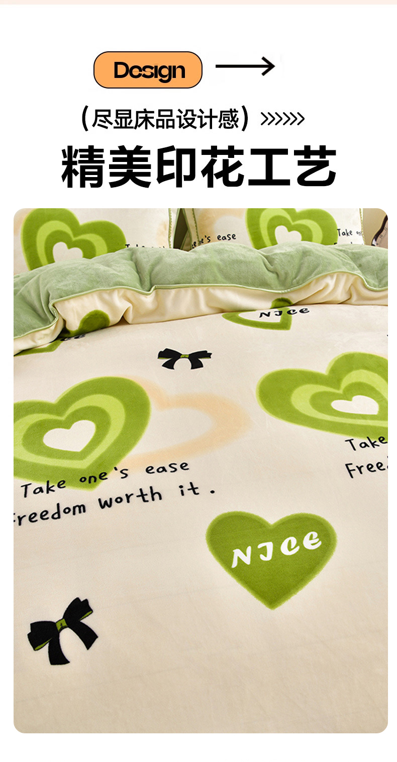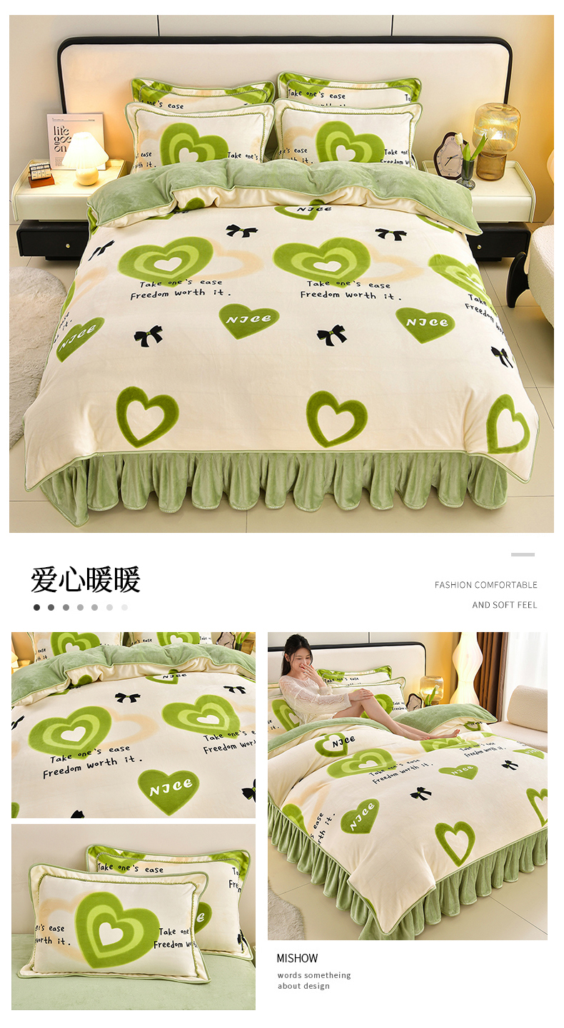 新8.5-9.5斤法莱绒四件套珊瑚牛奶金貂绒四件套床裙 爱心暖暖