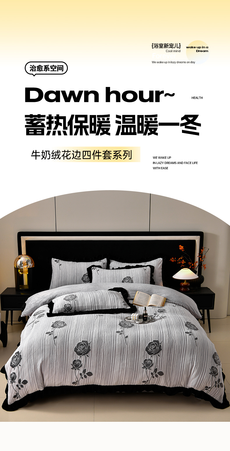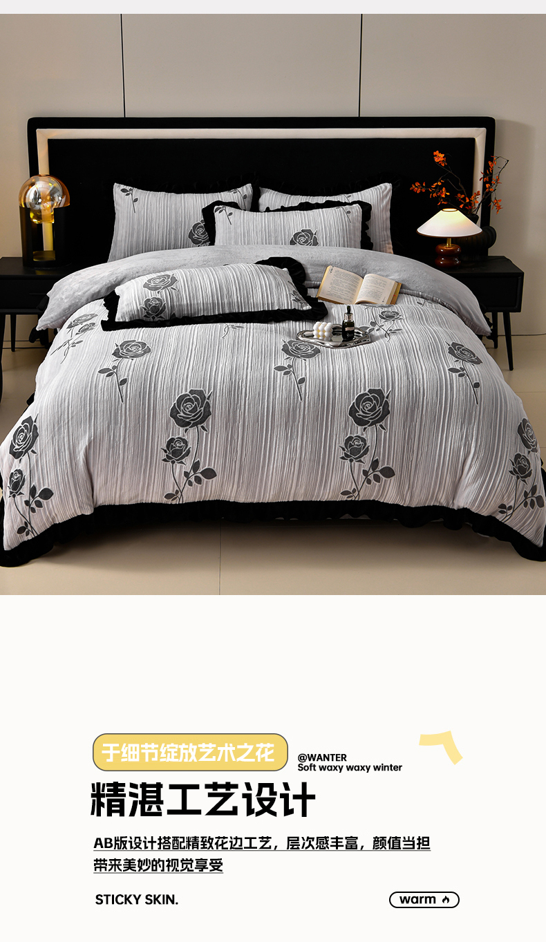 商品名称:梦之星 2025新款雕花绒赫本风牛奶绒花边四件套 加厚8.5斤 花边玫瑰-灰