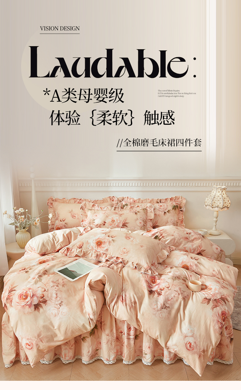 (总)缦彩 2025新款100%全棉A类数码印花床裙遮丑花边床单床罩四件套