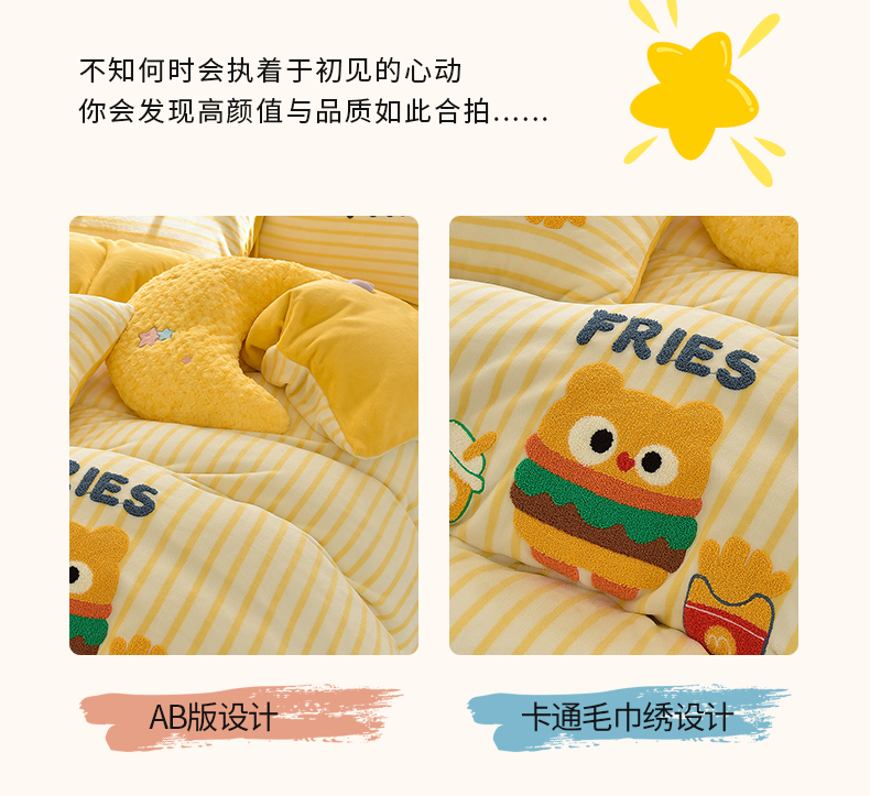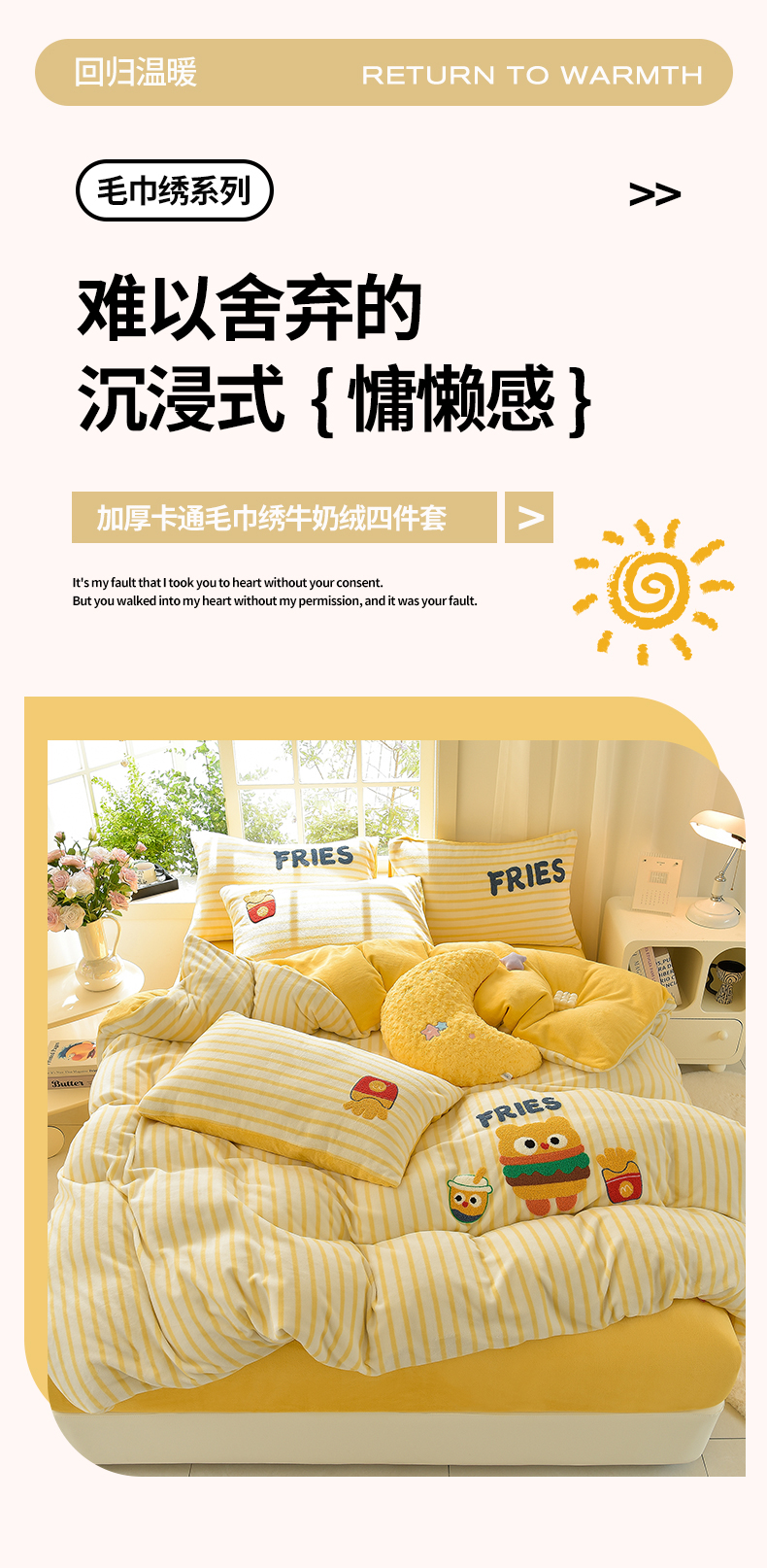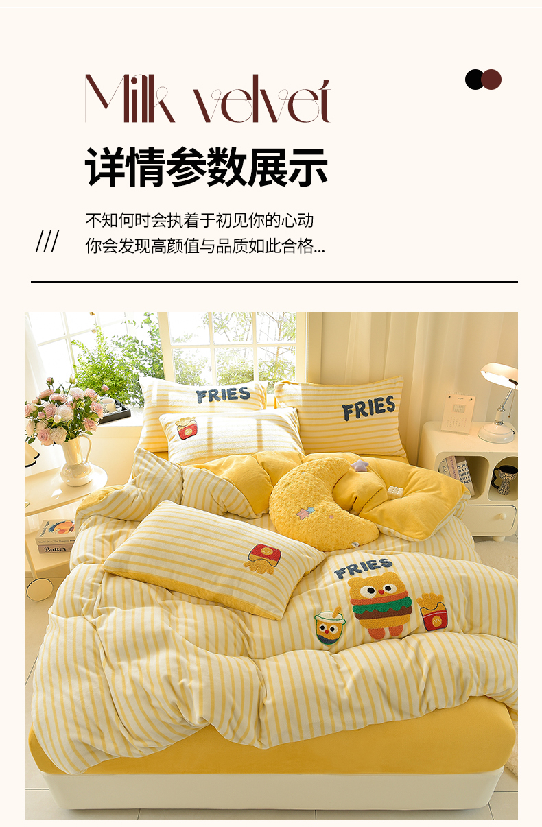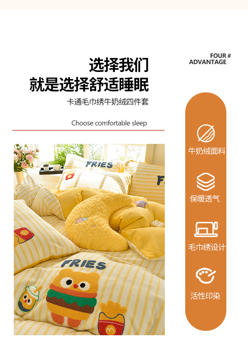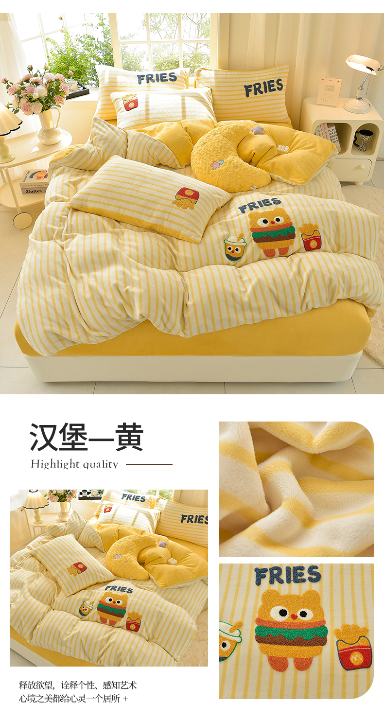 商品名称:炫拼家纺 2025新款条纹印花卡通毛巾绣加厚牛奶绒四件套 条纹-汉堡-黄