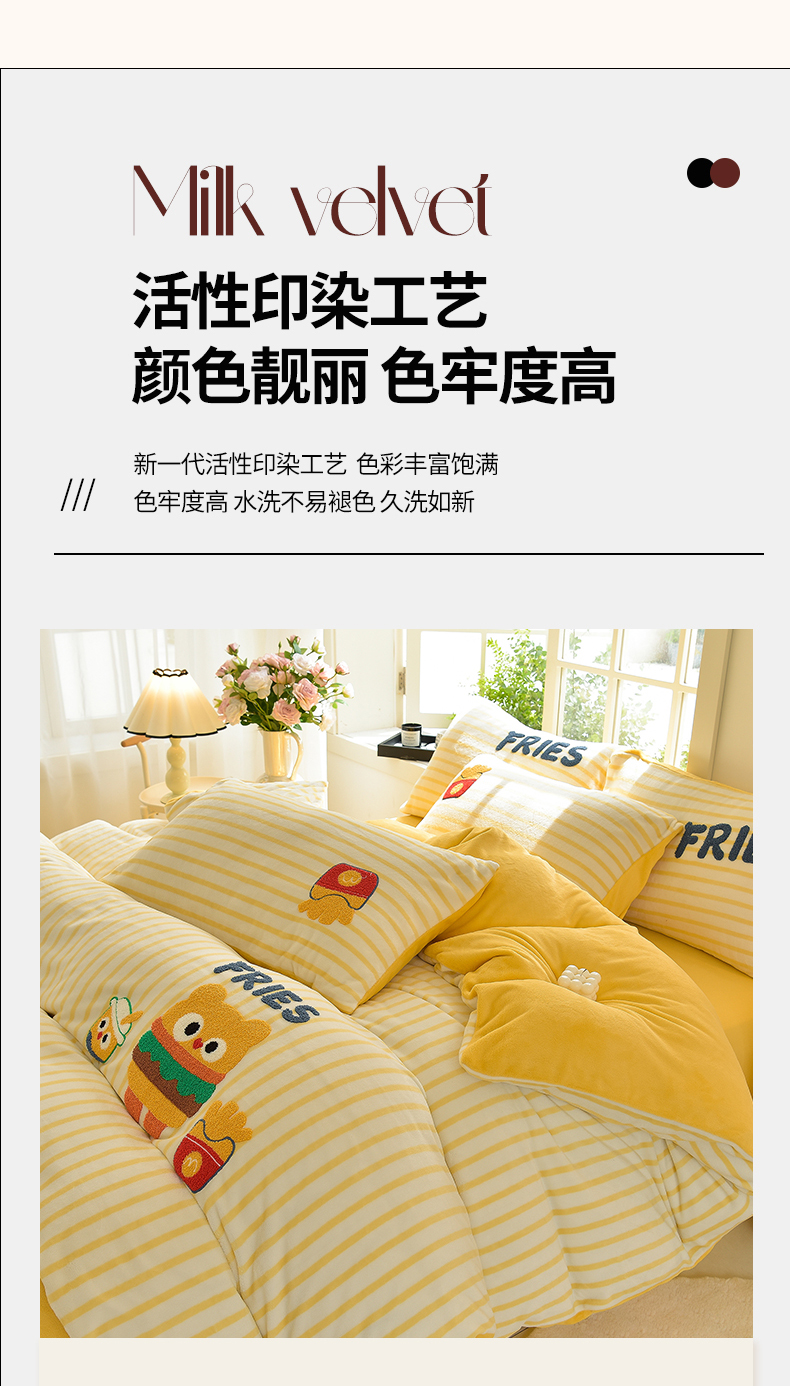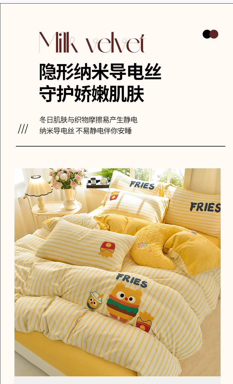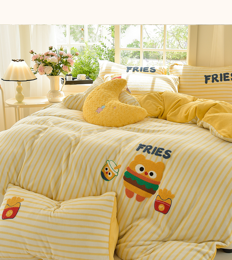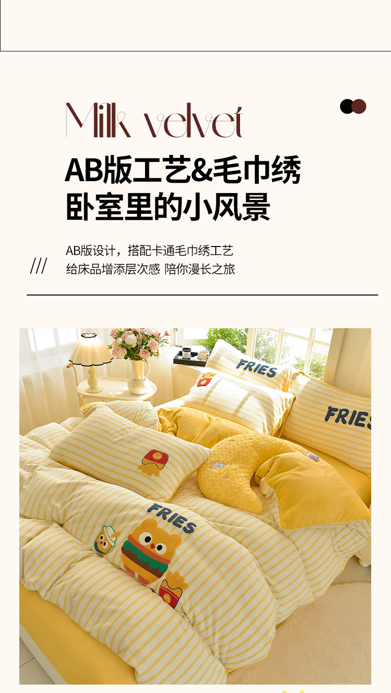 炫拼家纺 2025新款条纹印花卡通毛巾绣加厚牛奶绒四件套 条纹-汉堡-黄