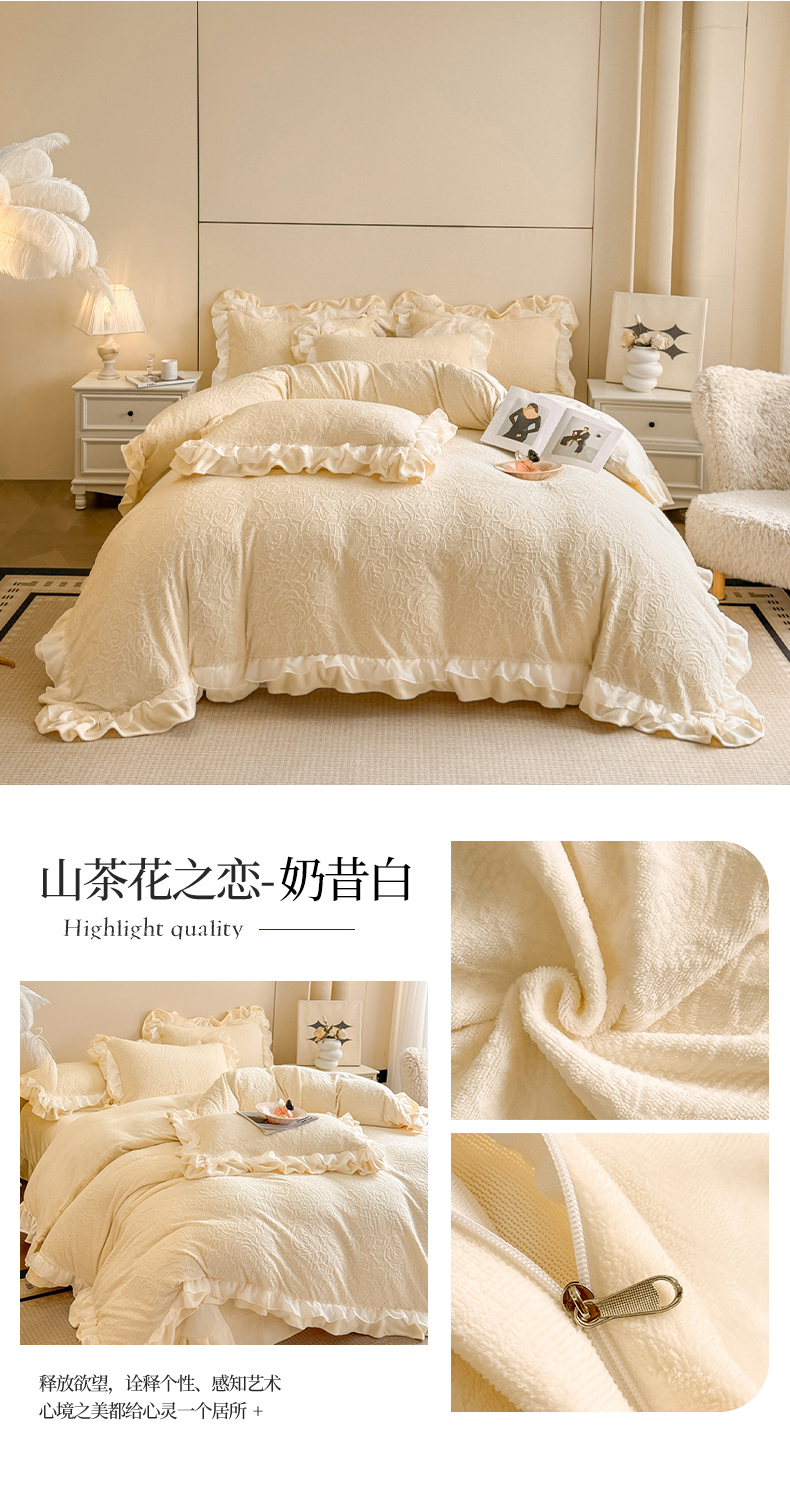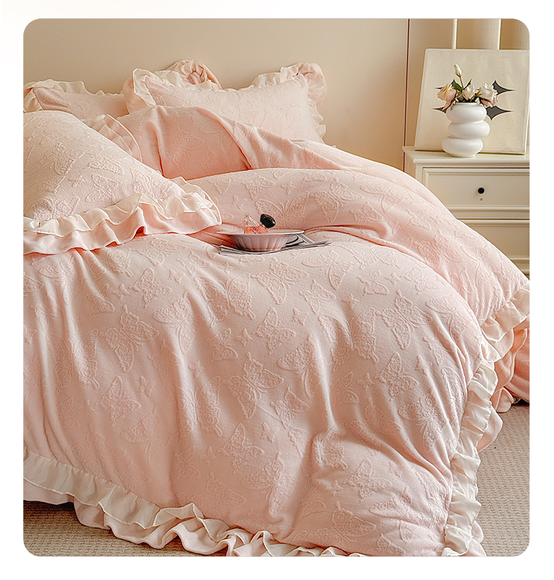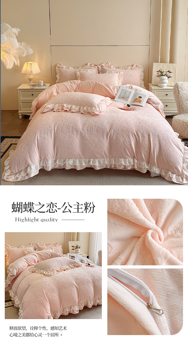当前位置: 91家纺网 > 商品网购 > 床品套件 > 四件套 > 牛奶绒四件套 > 爱家(原缔乐家纺) 2025新款A类牛奶雕花绒四件套 山茶花-蝴蝶之恋系列 蝴蝶之恋-公主粉