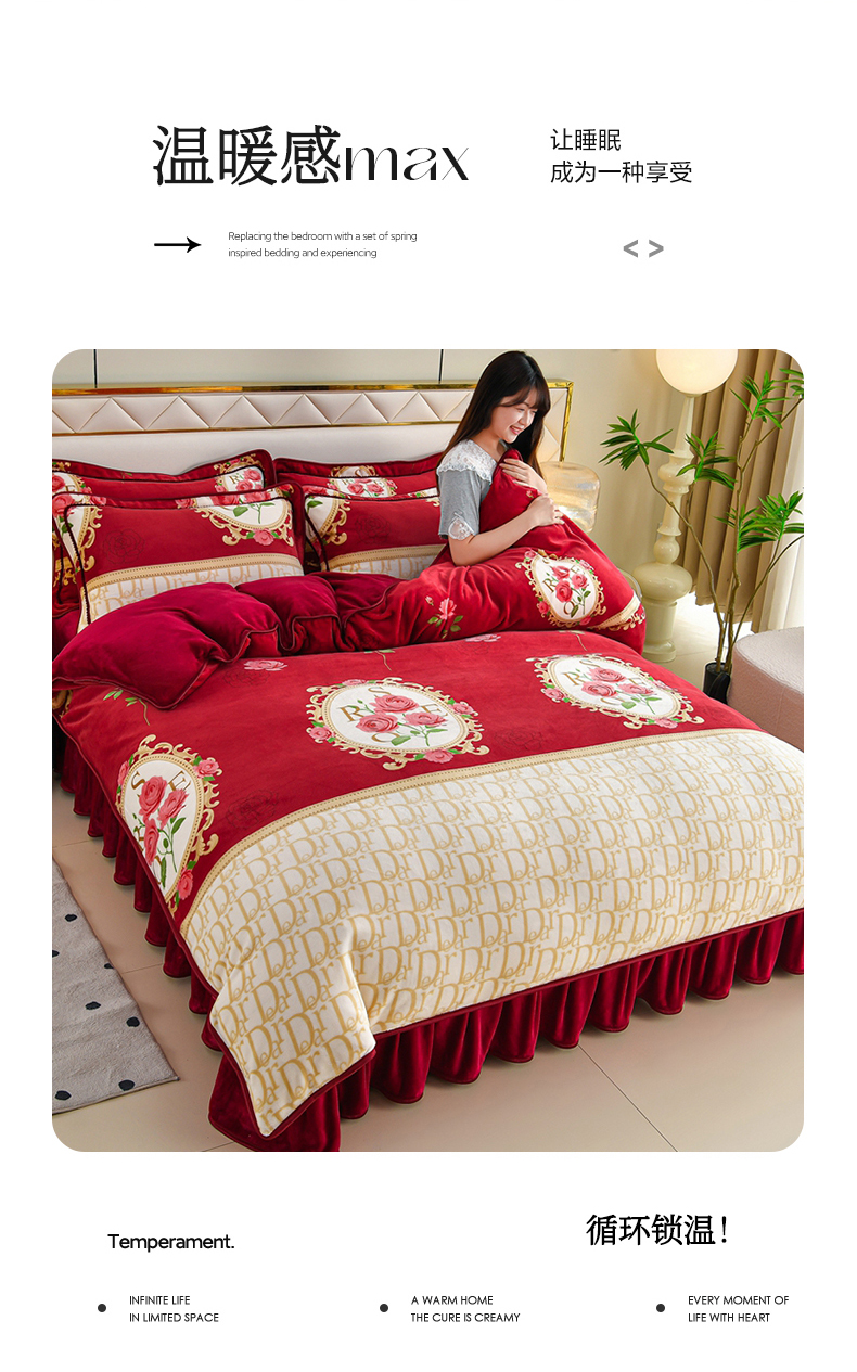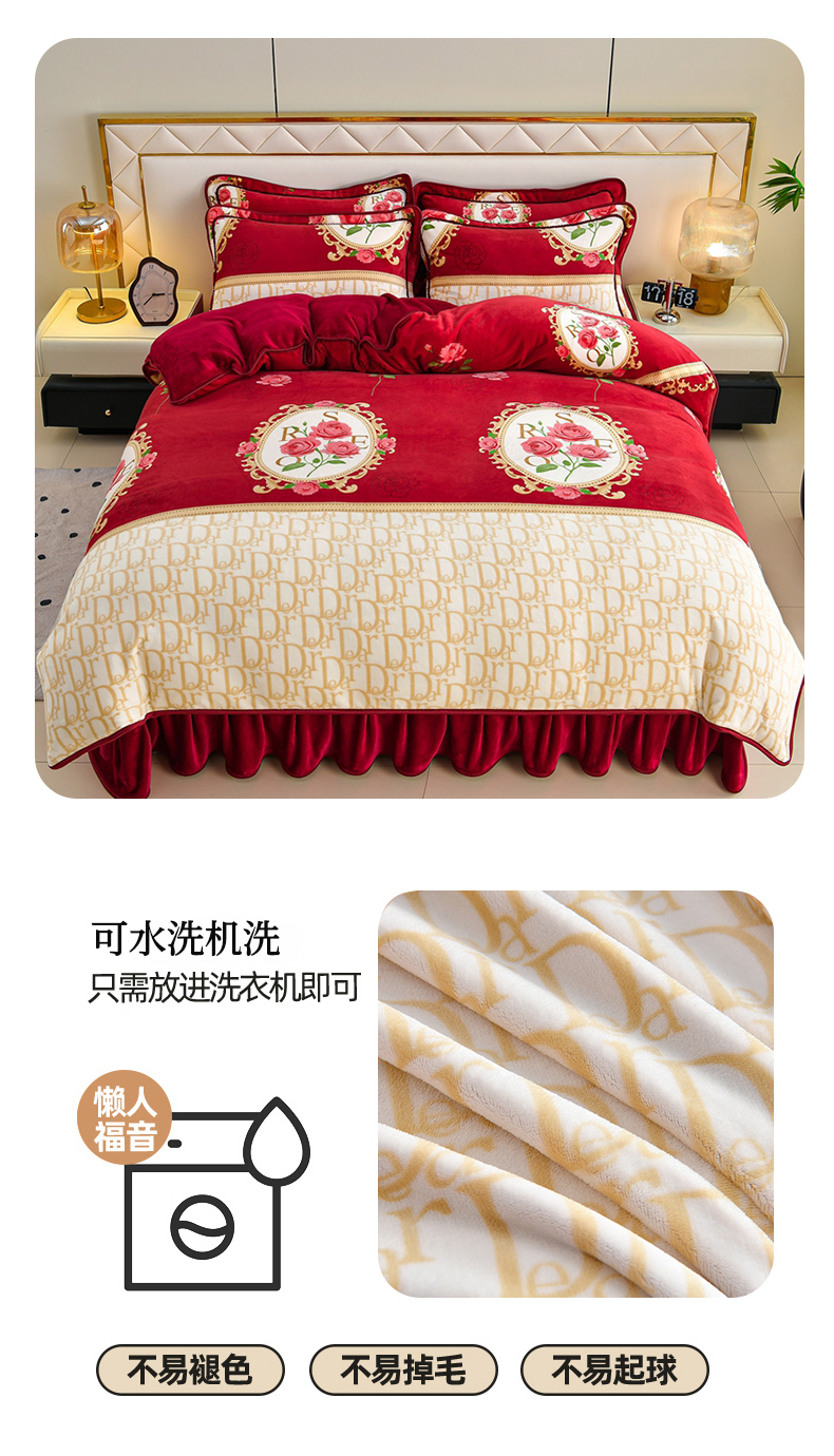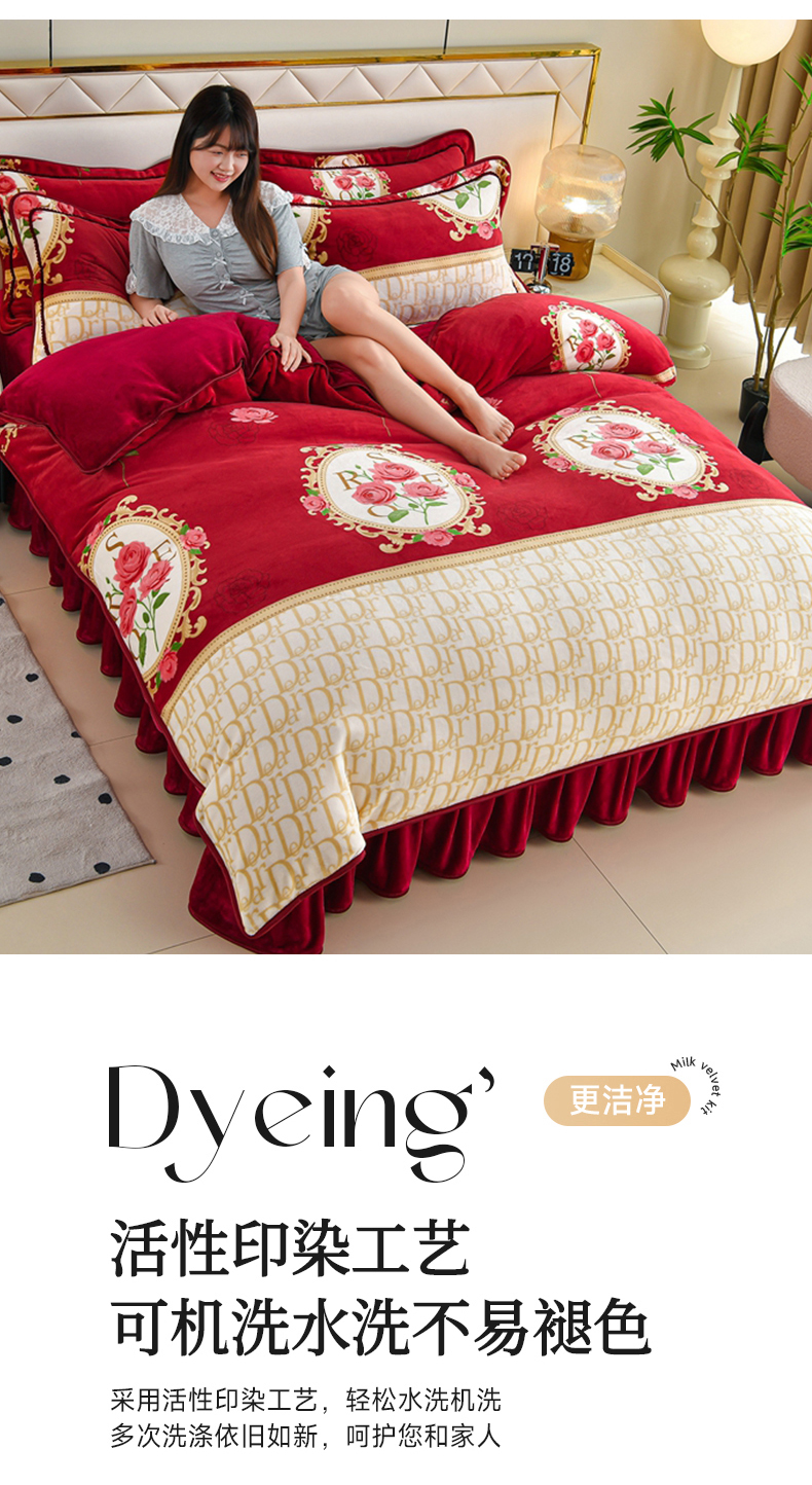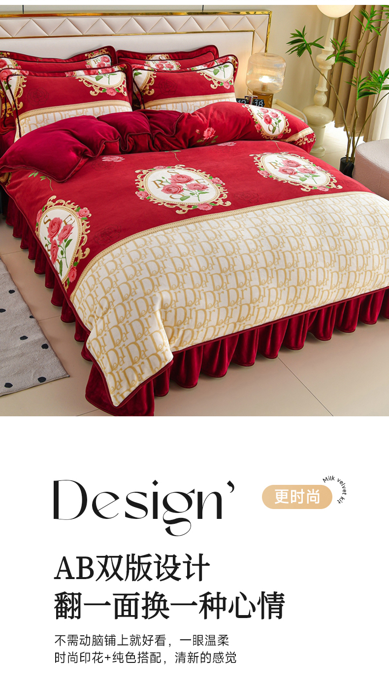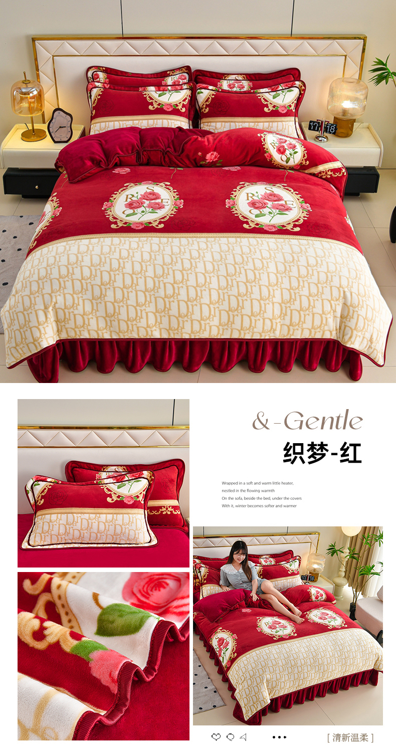 商品名称:赫本 2025新品8斤爆品牛奶绒四件套床裙款金雕绒法莱绒四套件 织梦-红