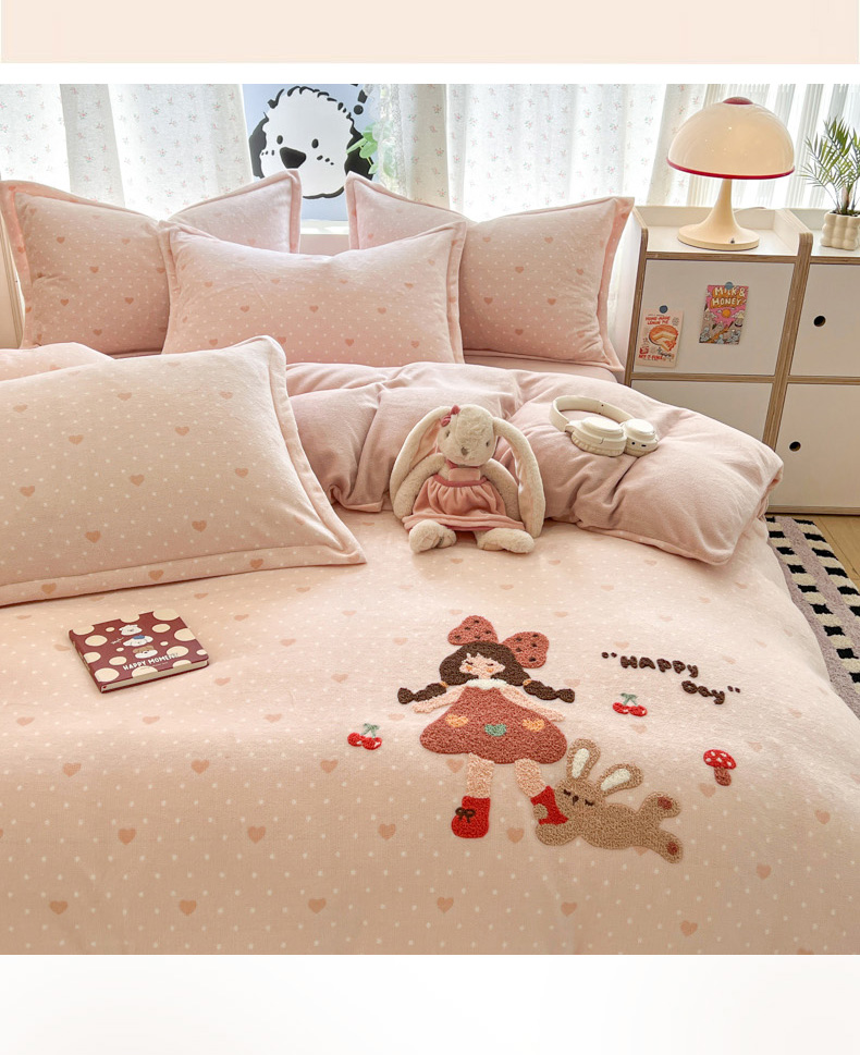(总)倾慕家纺 2025新款卡通毛巾绣加厚保暖牛奶绒四件套,爱心女孩,咖啡小狗,猫咪熊兔,迷你小车,圣诞树熊,音乐企鹅