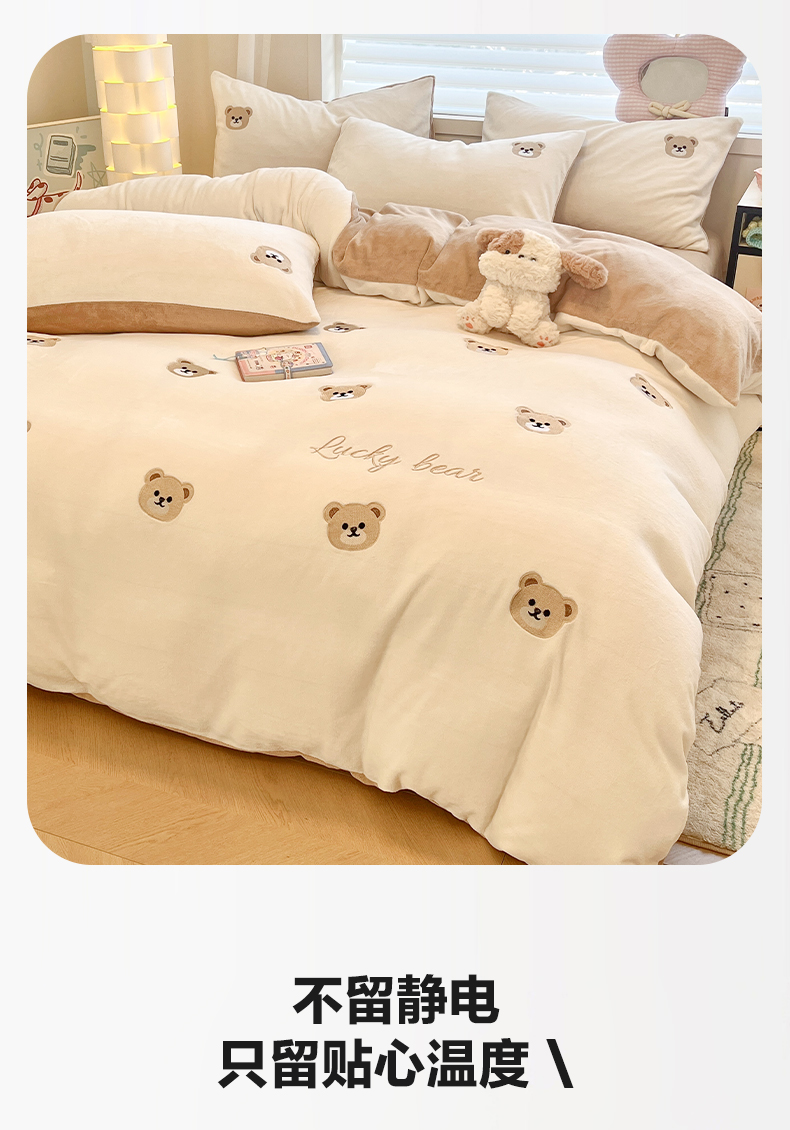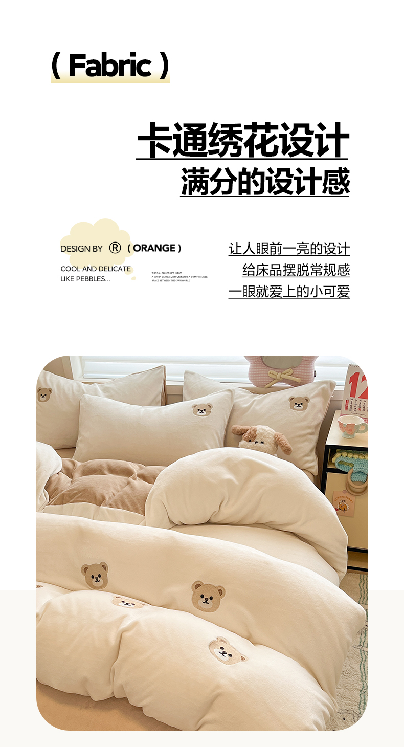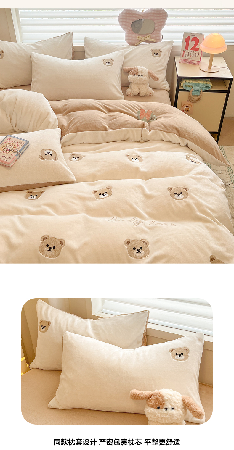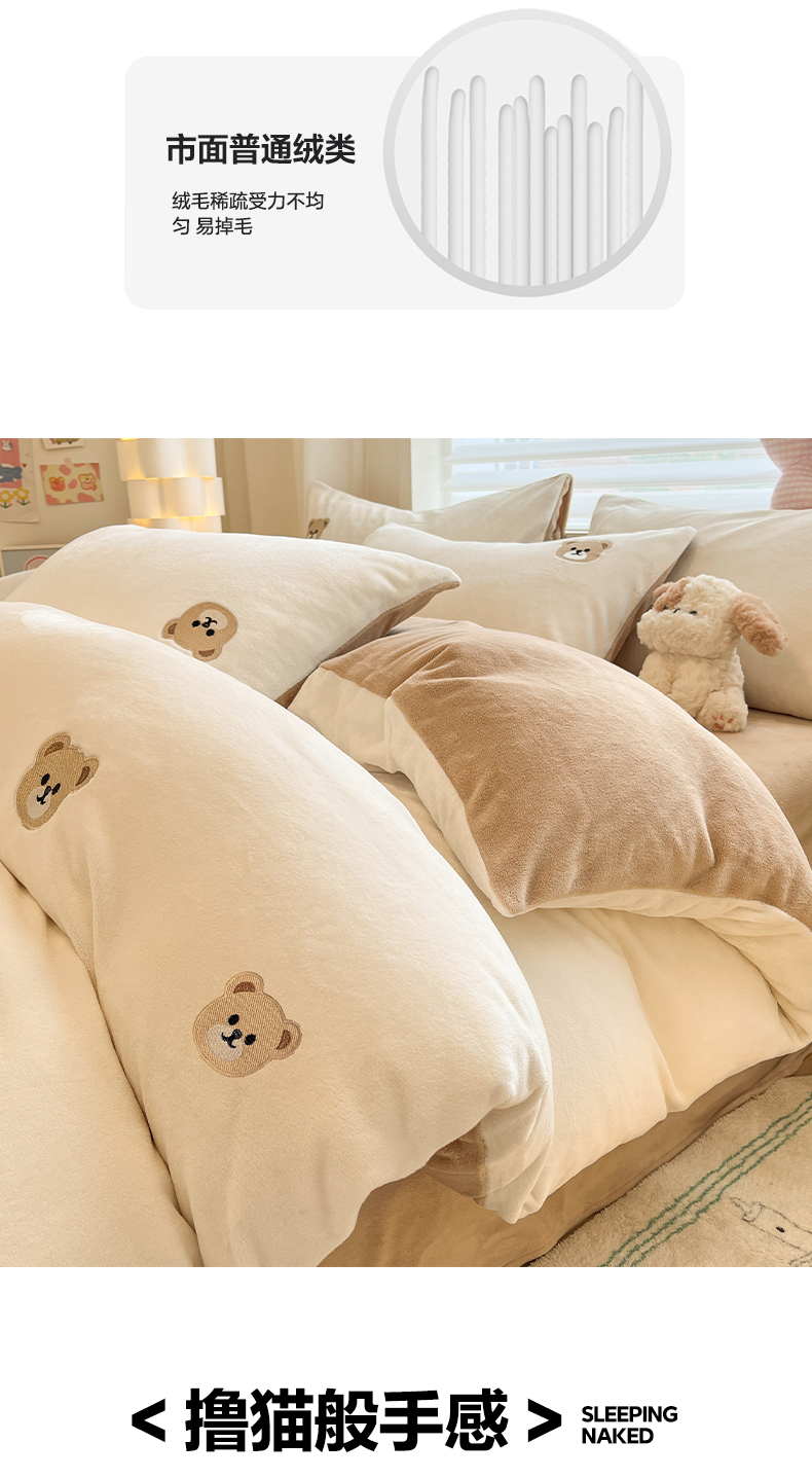 如一 2025新款200克缸染高克重精绣牛奶绒四件套 绒-小熊-白咖