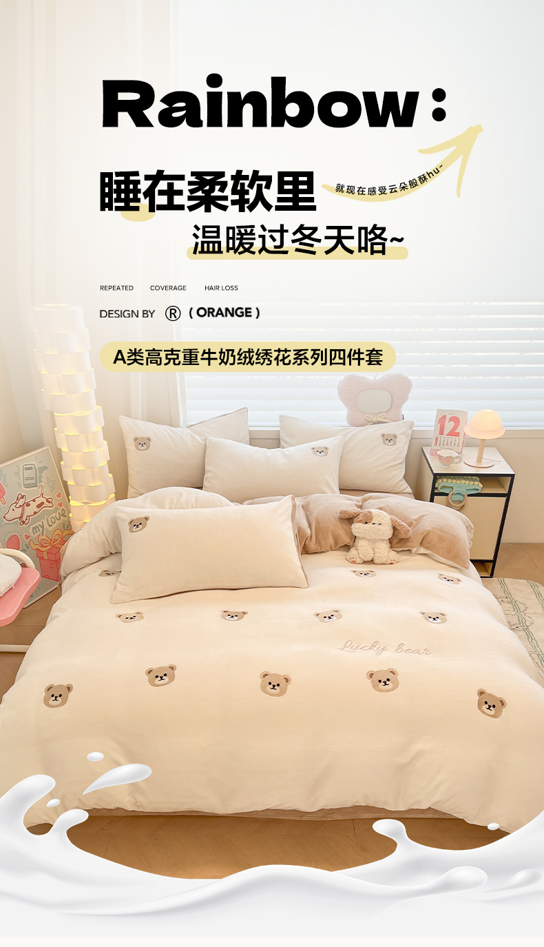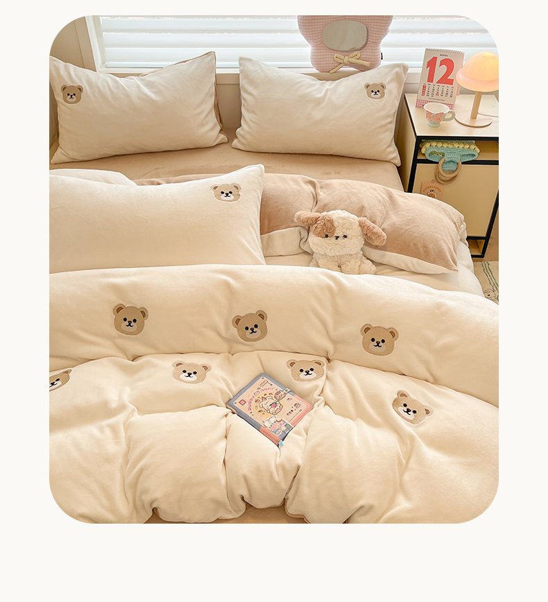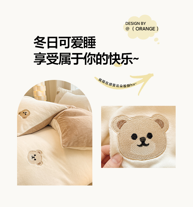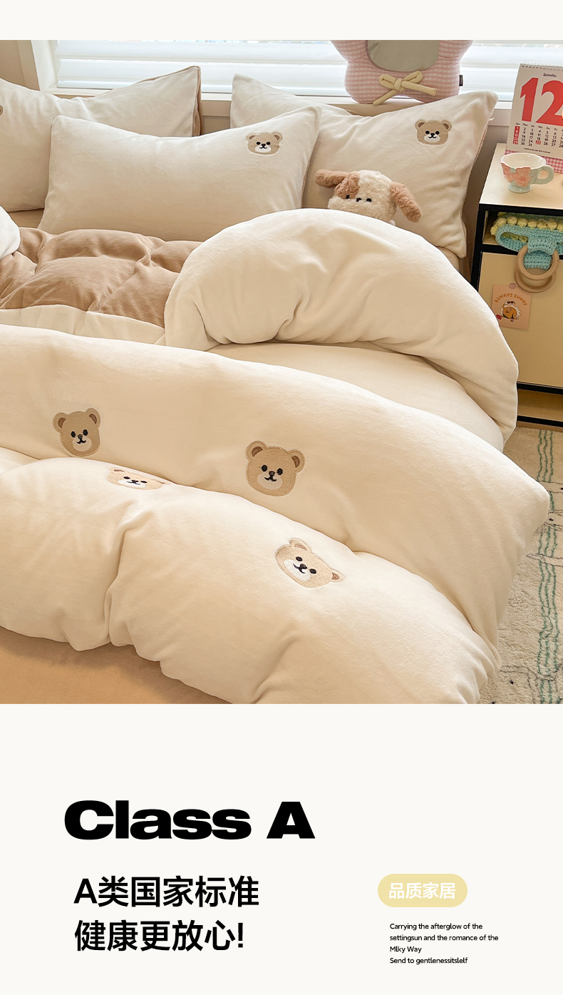 如一 2025新款200克缸染高克重精绣牛奶绒四件套 绒-小熊-白咖