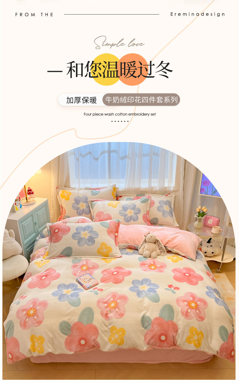 (总)慕尚家纺 2025新款豆豆绒刺绣四件套,大耳狗 白蓝,玫瑰 白粉