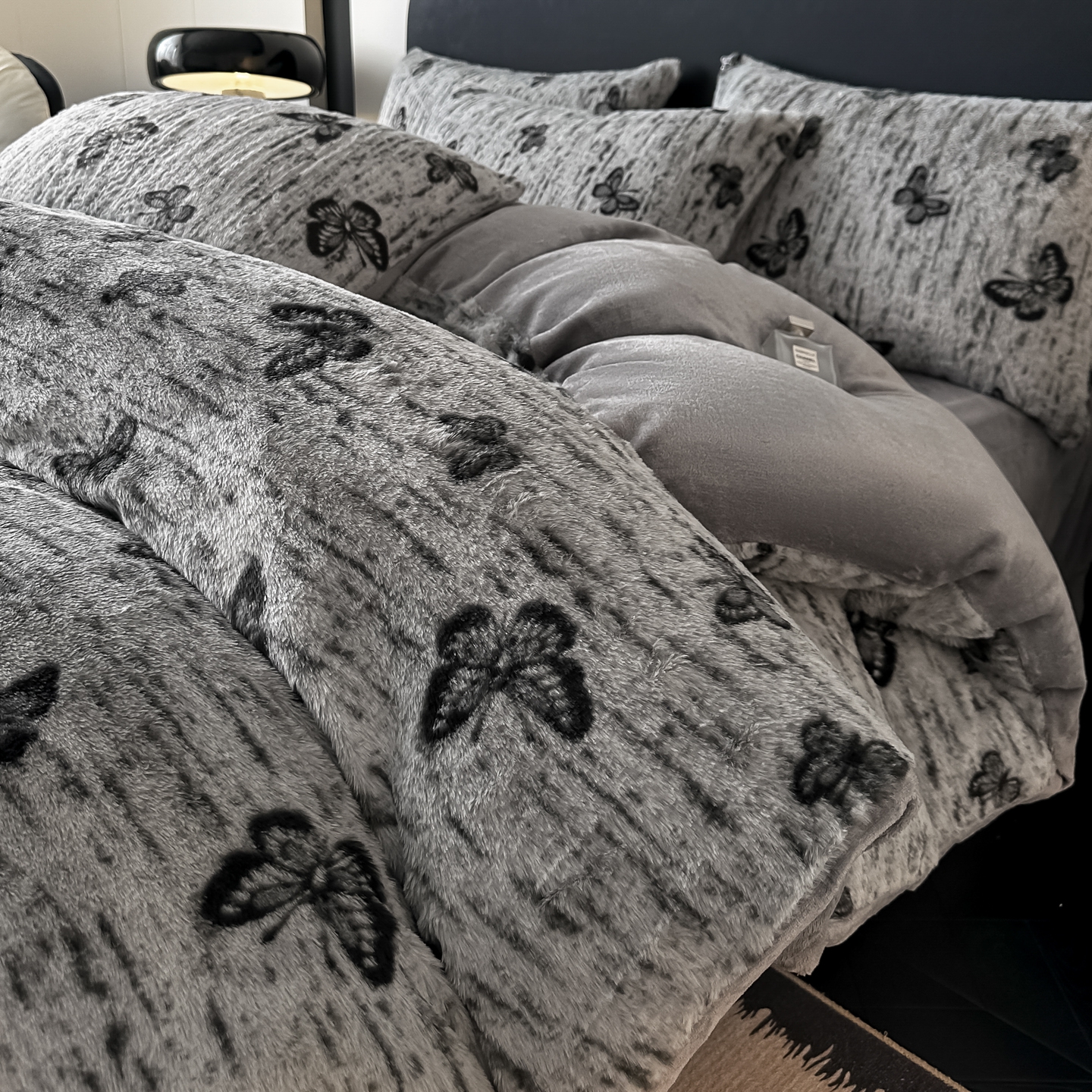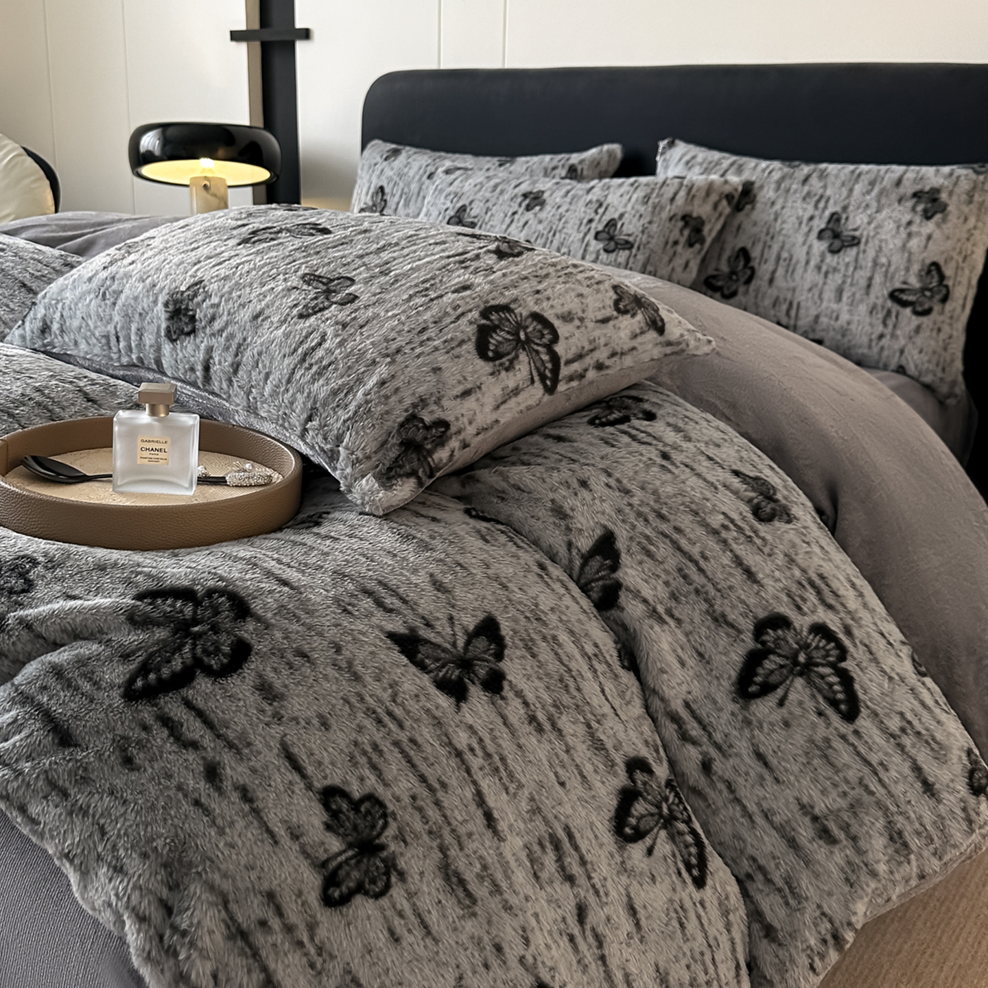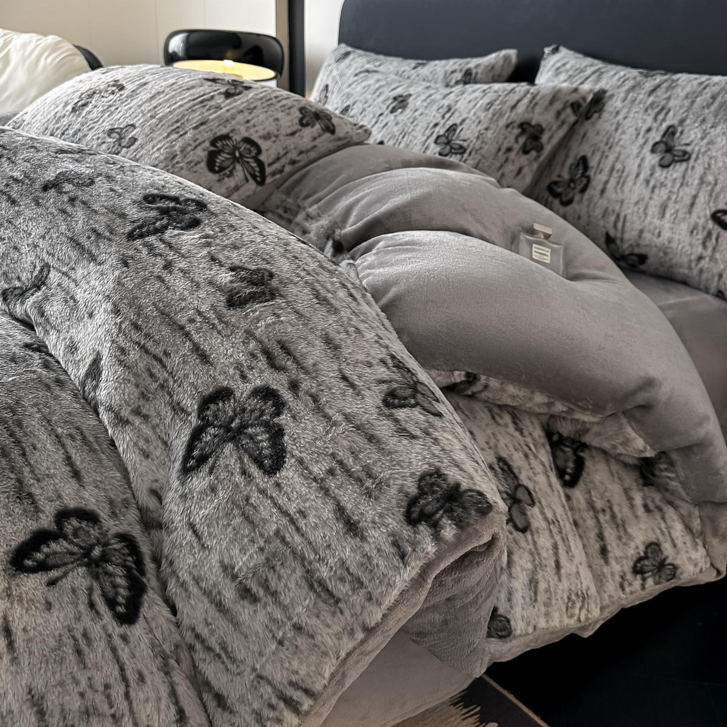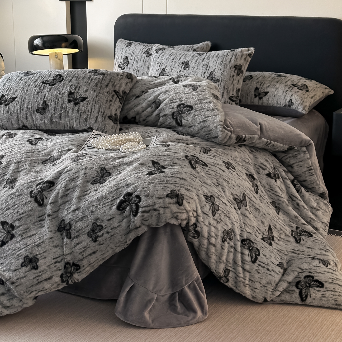 鸿羽樱家纺《原伊菲晓》 2025新款美拉德复古印花抽条兔毛绒床裙款四件套 蝴蝶仙子