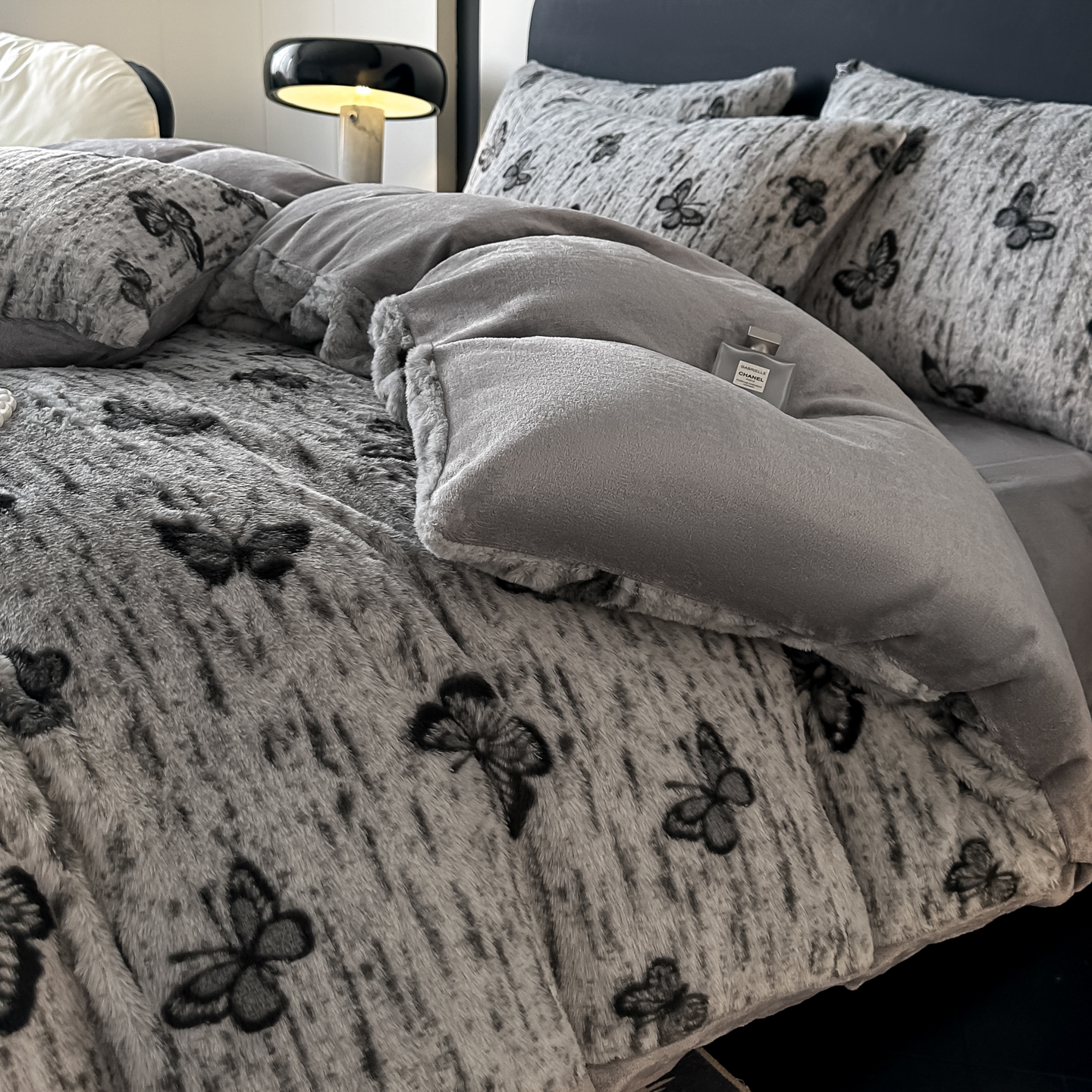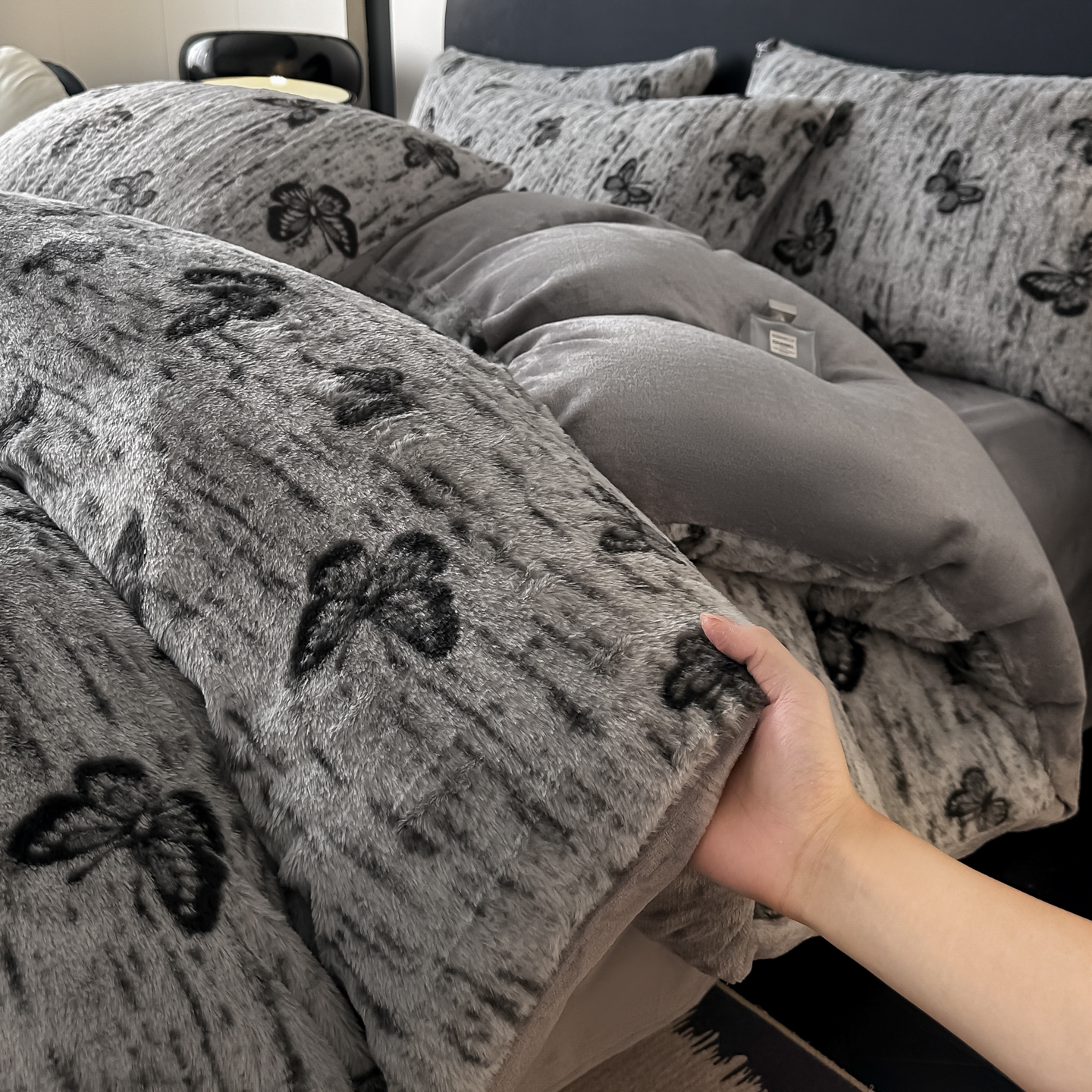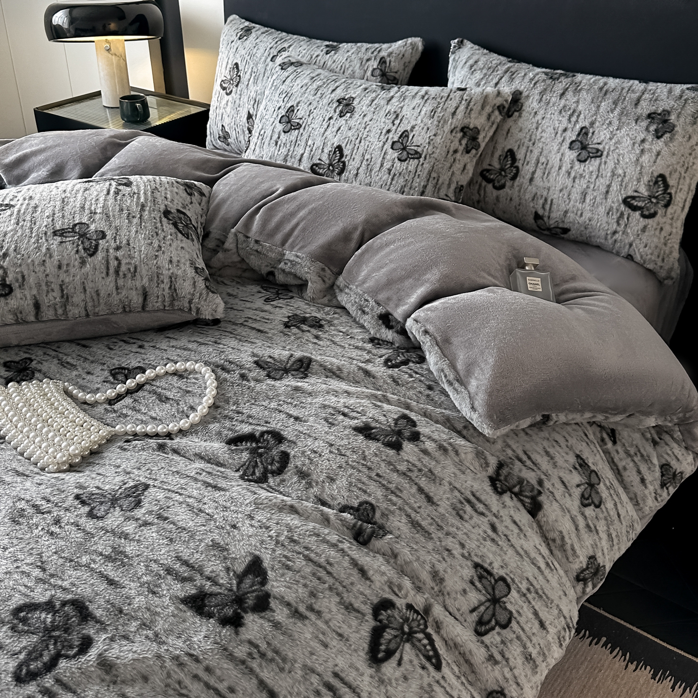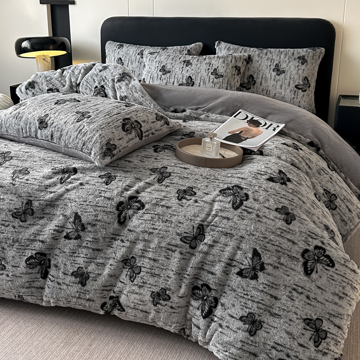 鸿羽樱家纺《原伊菲晓》 2025新款美拉德复古印花抽条兔毛绒床裙款四件套 蝴蝶仙子