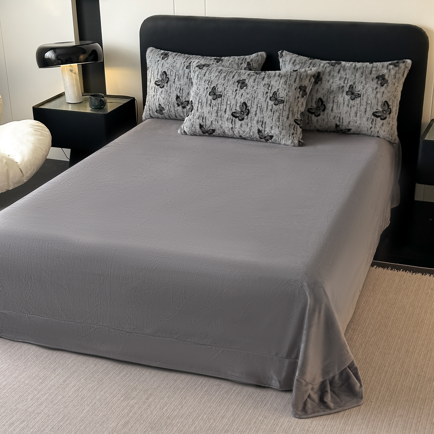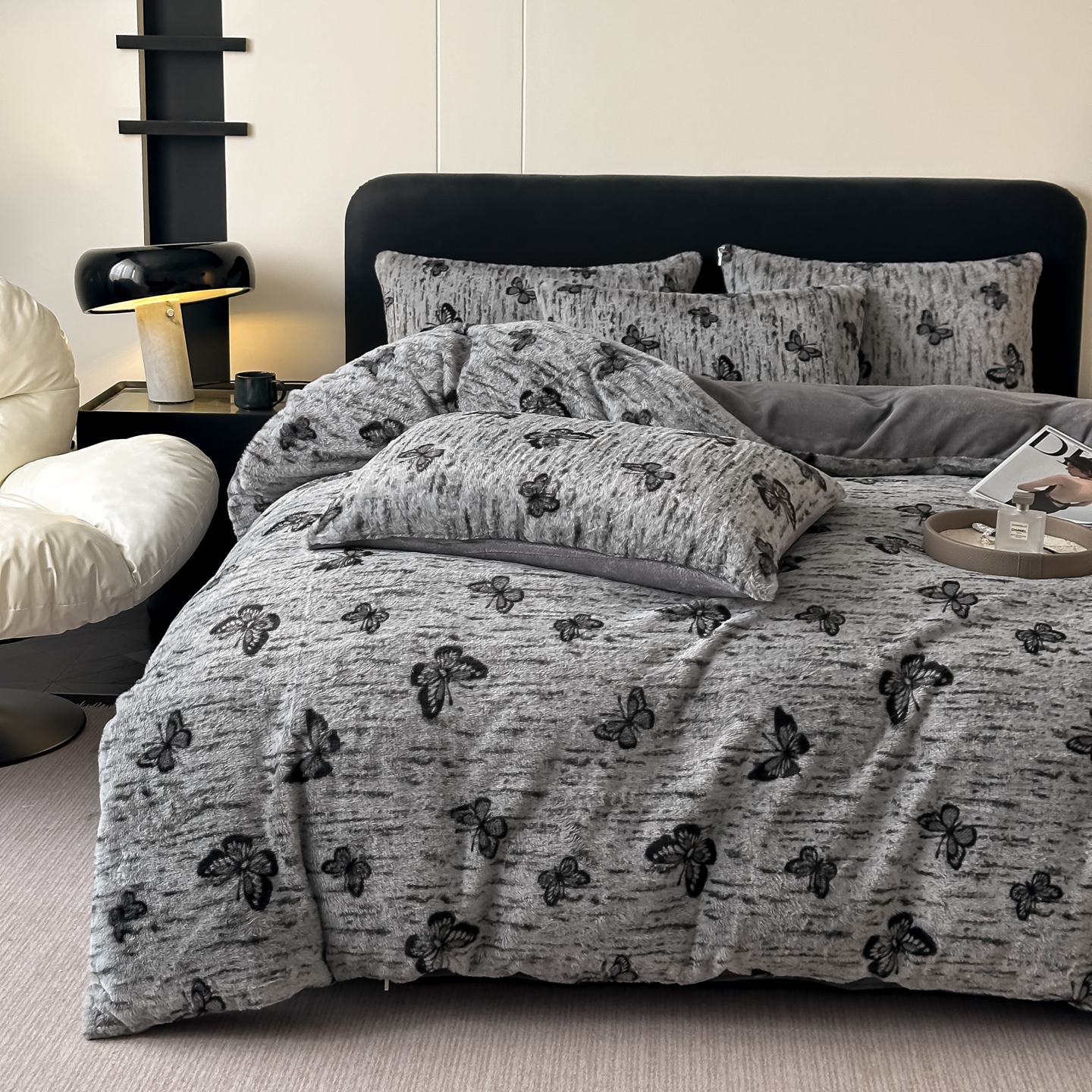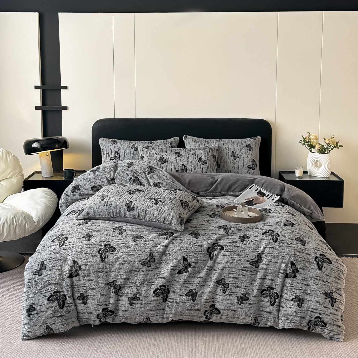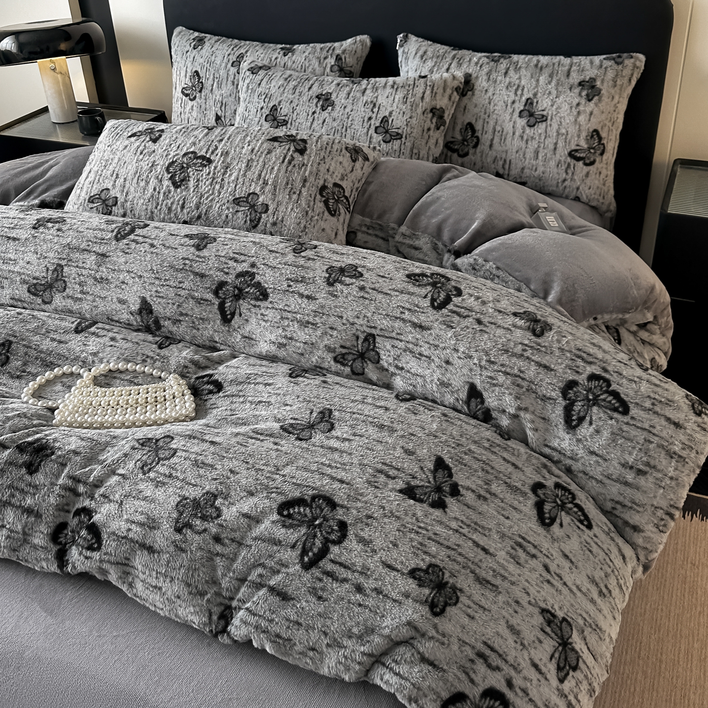 鸿羽樱家纺《原伊菲晓》 2025新款美拉德复古印花抽条兔毛绒床裙款四件套 蝴蝶仙子