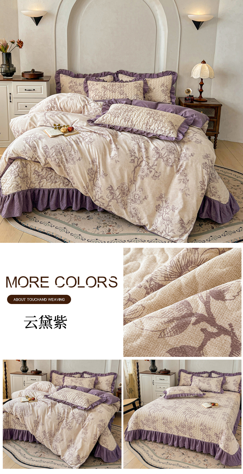• 91家纺网 家纺一手货源 找家纺 (总)笠裙家纺 2025新款a类加厚夹棉云感水洗棉床盖四件套,云黛紫,茶巷,扶桑花-红,浮绘花影,花田错,兰亭序-米白,乌木花园,月神蝶